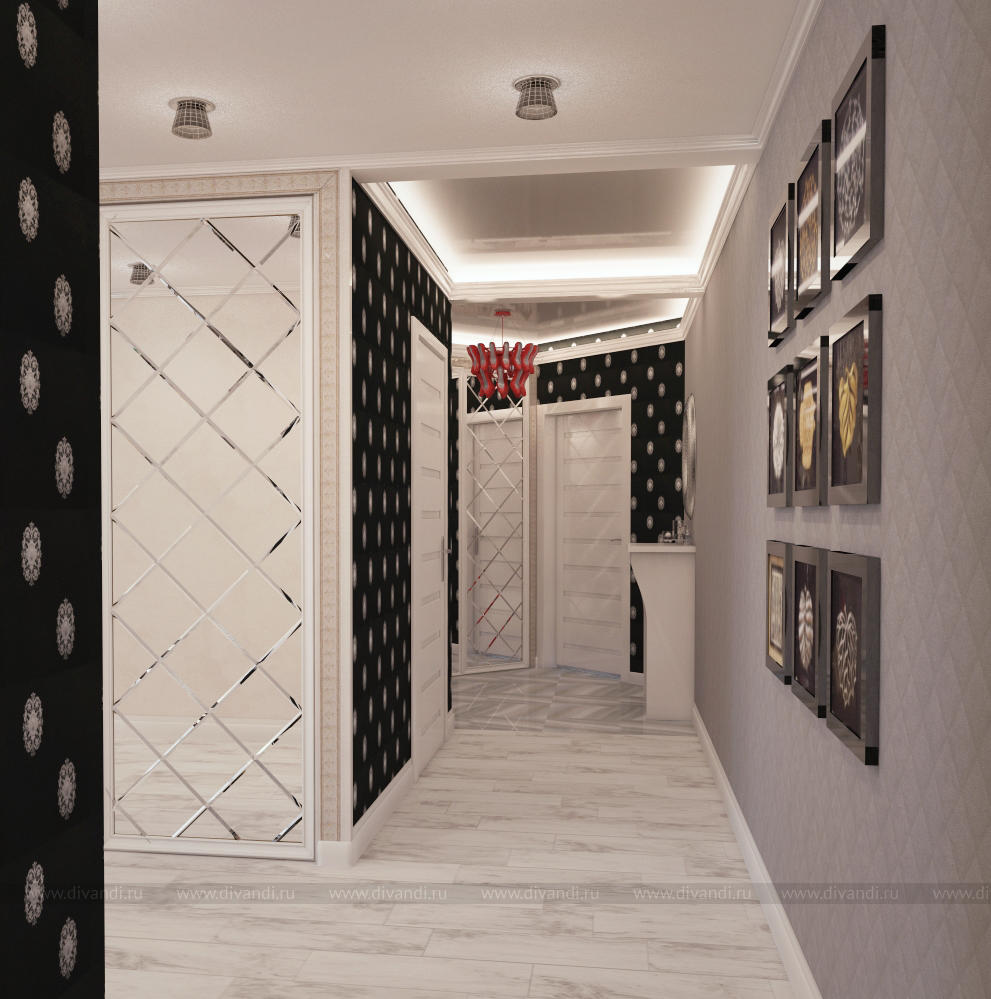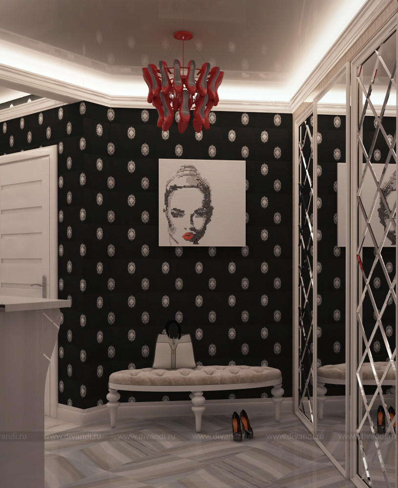 Необычная и запоминающаяся прихожая в стиле арт деко. Светильник из красных туфелек является главным акцентом.