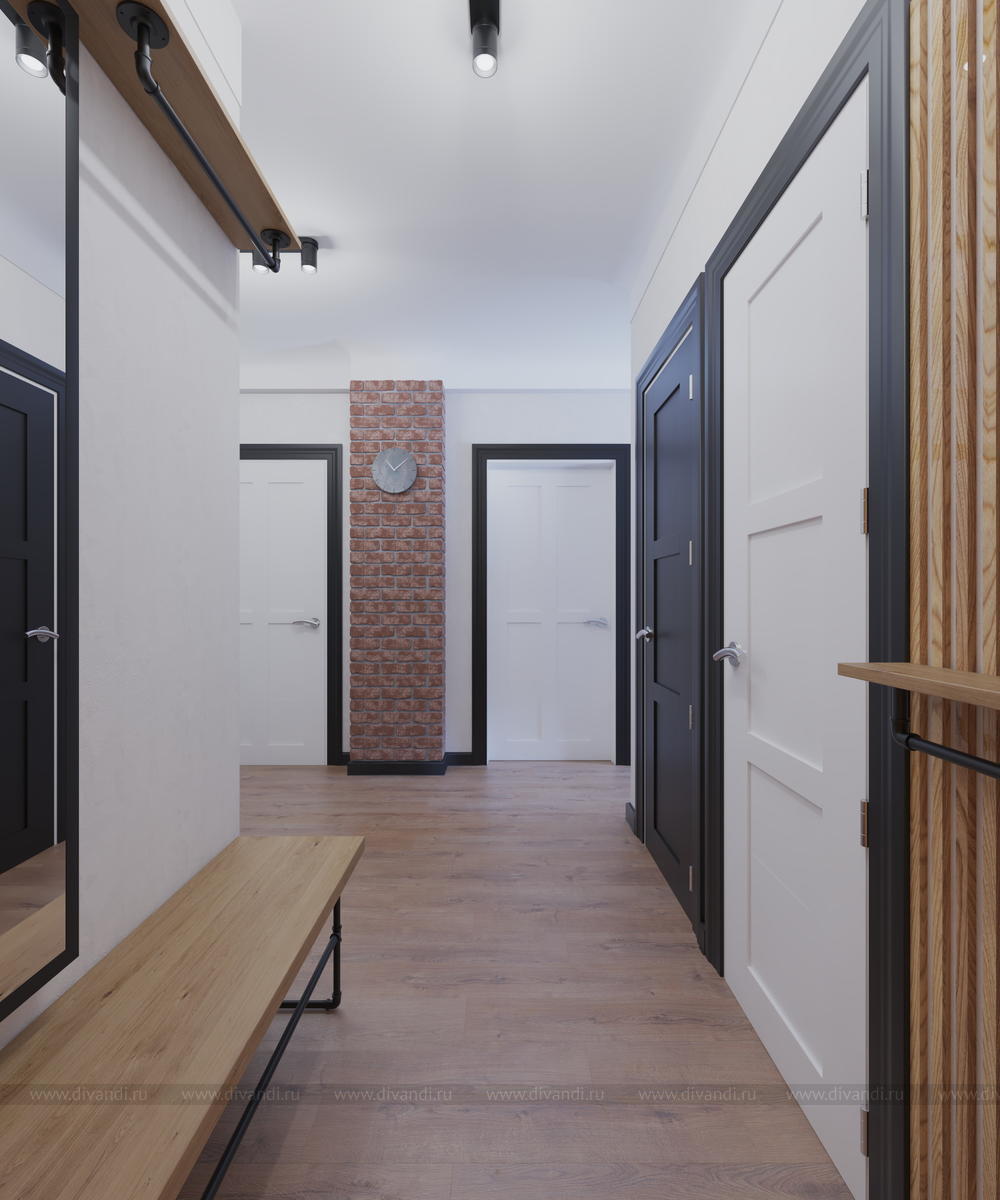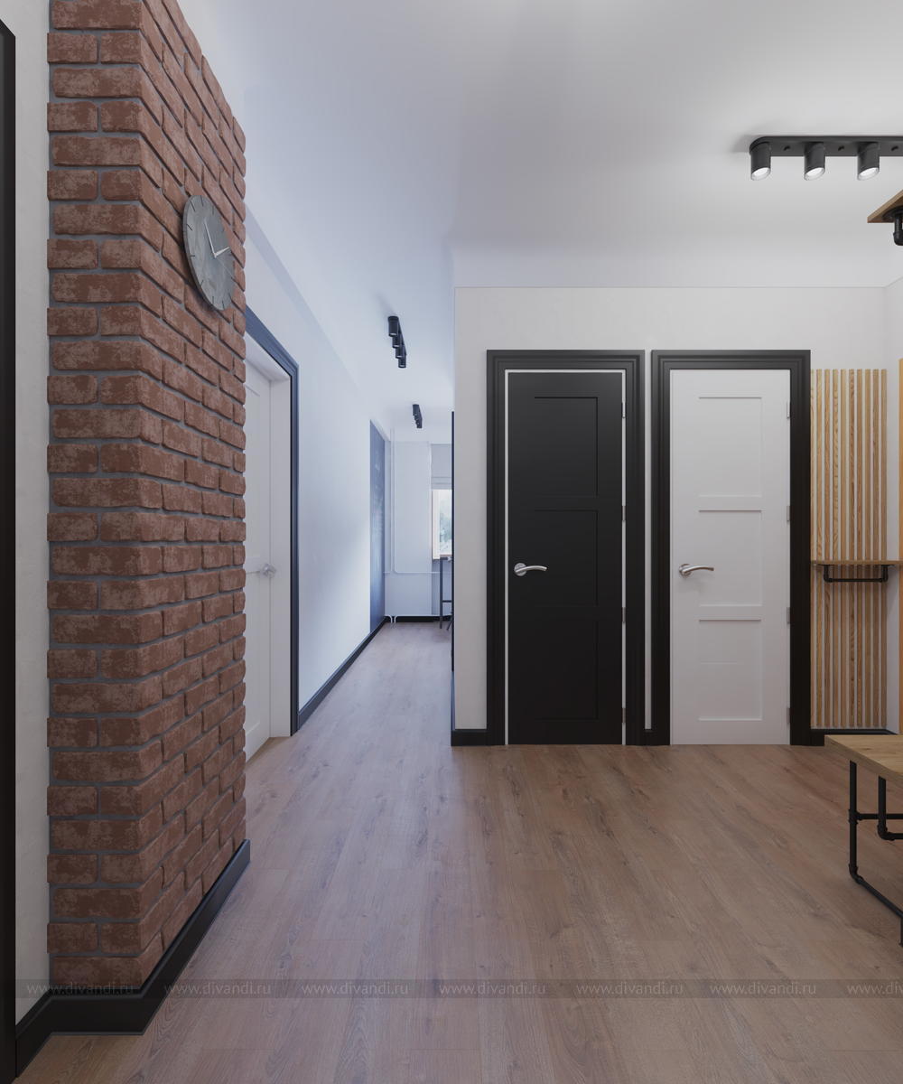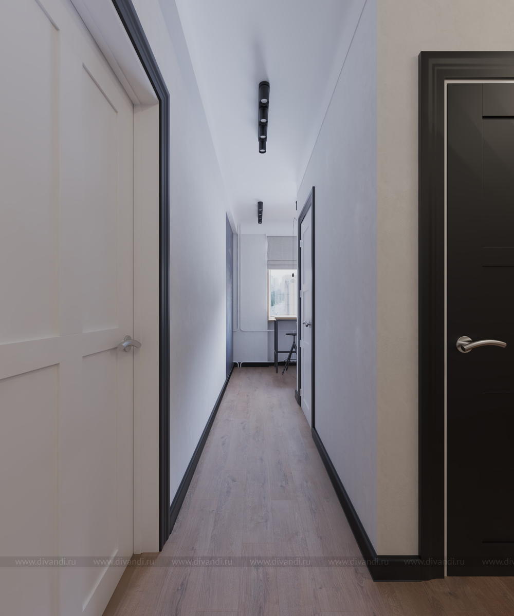 А чтобы всё не казалось слишком одинаковым, - плинтусы, пару дверей и наличники мы сделали черными и протянули контрастной линией вдоль всего коридора. Входная дверь в оттенке натурального дерева поддерживает цветовую гамму зоны прихожей.