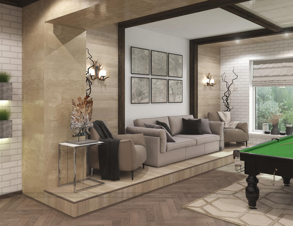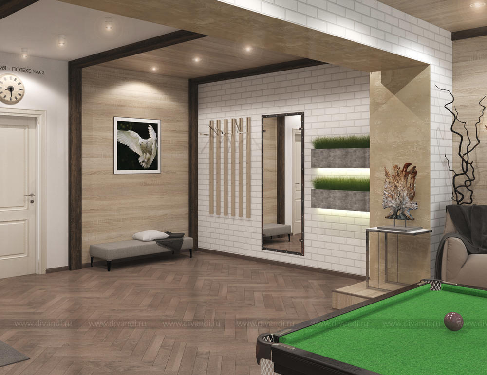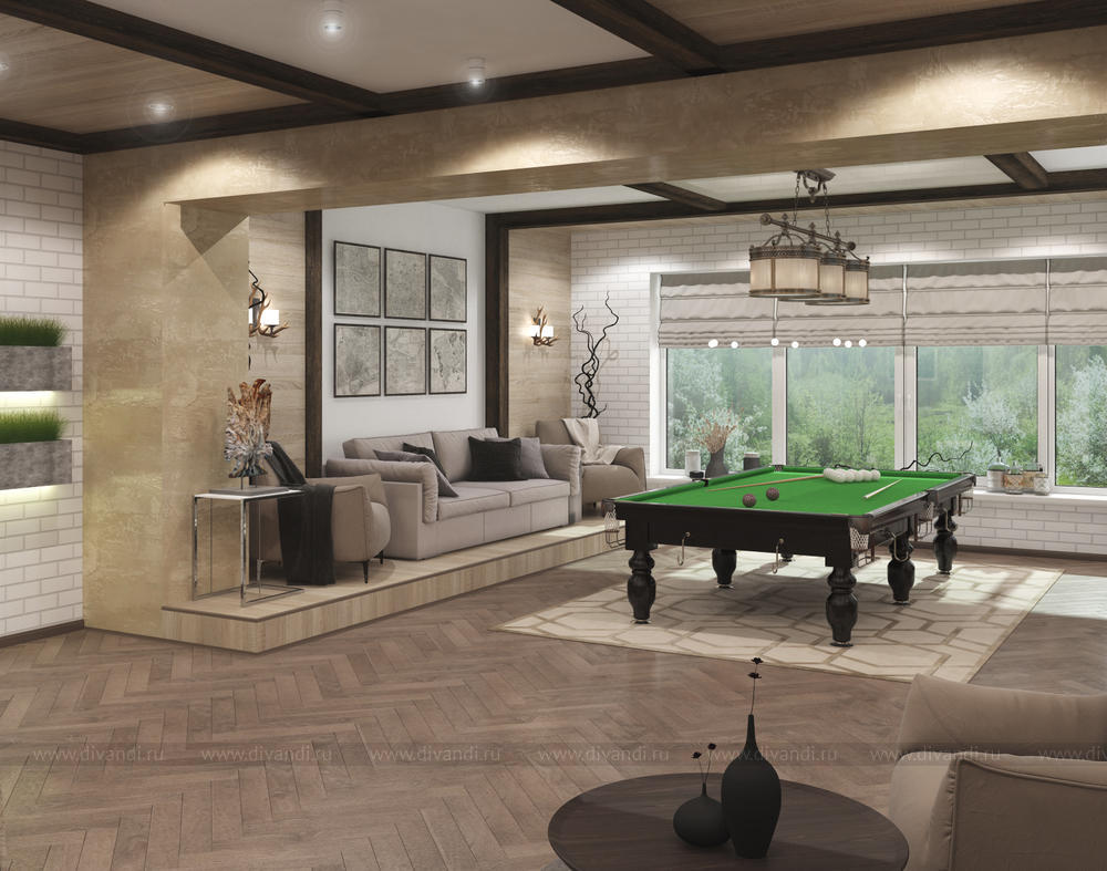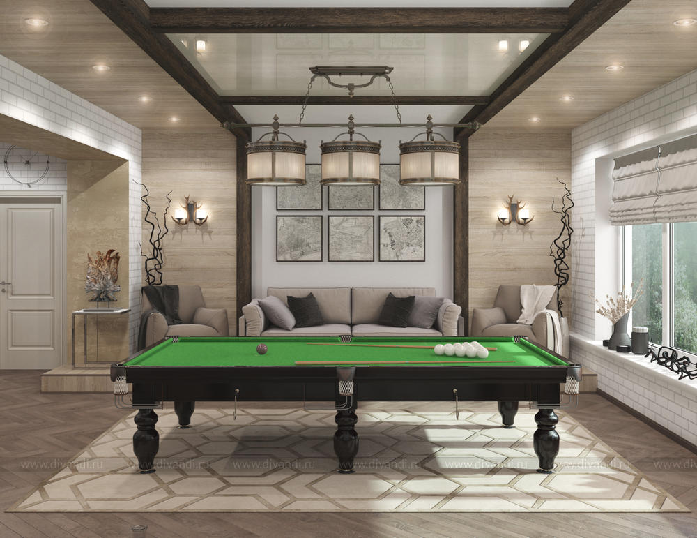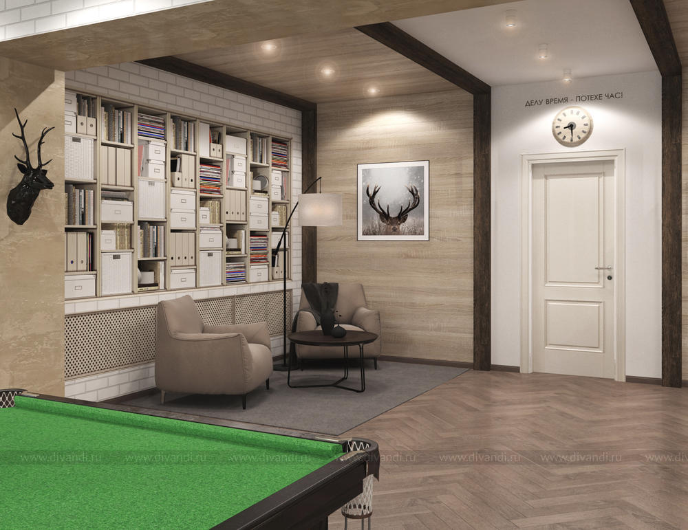 Дизайн бильярдного зала спроектирован для завода Малышевского рудоуправления (ОАО «МРУ»). Просторное помещение рассчитано для проведения досуга игрой в бильярд и легким чтением литературы.