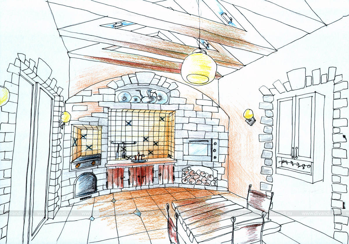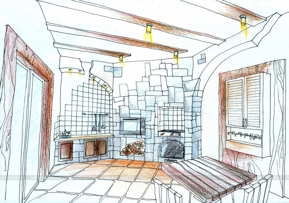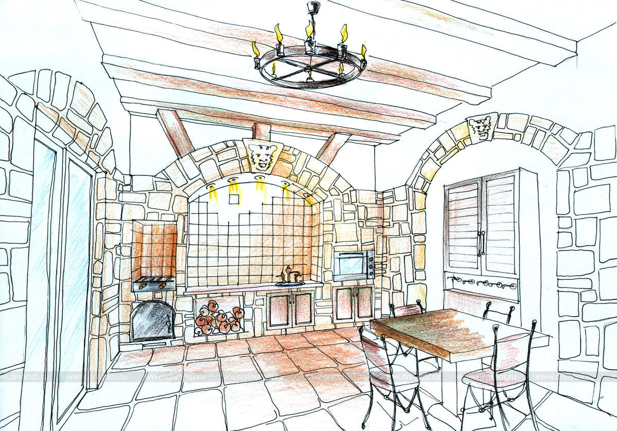 Проект домика для барбекю включает в себя "летнюю" кухню и большой обеденный стол. Интерьер оформлен с элементами классического стиля. Состаренные деревянные балки, кованные декоративные элементы присутствуют в мебели и светильниках, глазурованная плитка с неровными краями, все это создает уютное помещение для приема гостей.