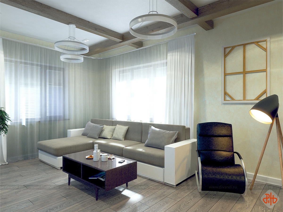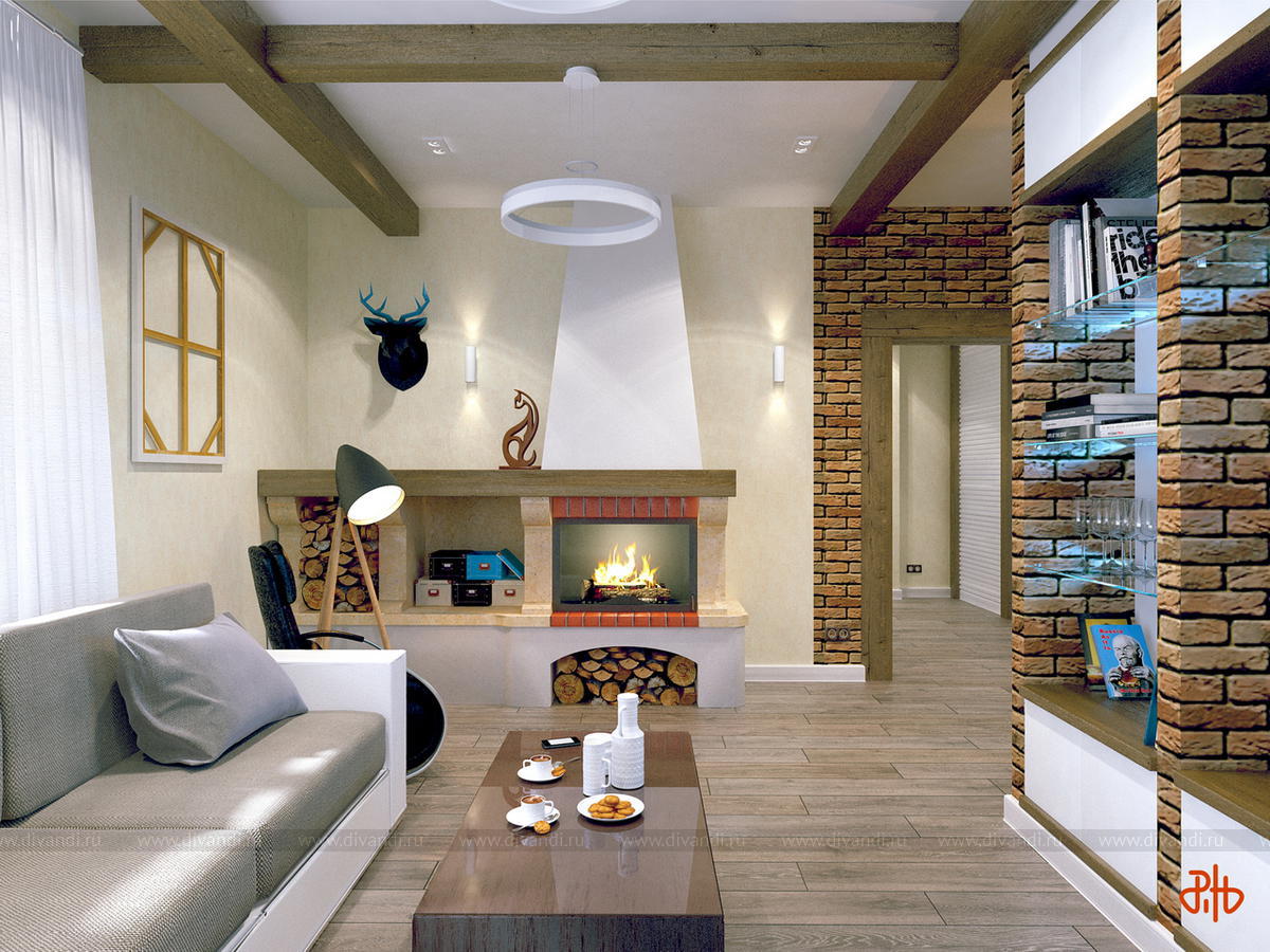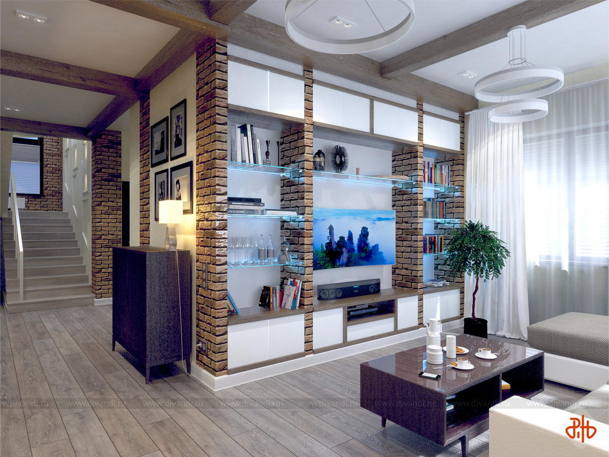 Гостиная открытой планировки в двухэтажном коттедже в КП Алексеевка (пригород г. Екатеринбурга). Мы сочетали современную мебель и аксессуары с традиционными элементами отделки, таких как деревянные балки, старый кирпич и штукатурка.