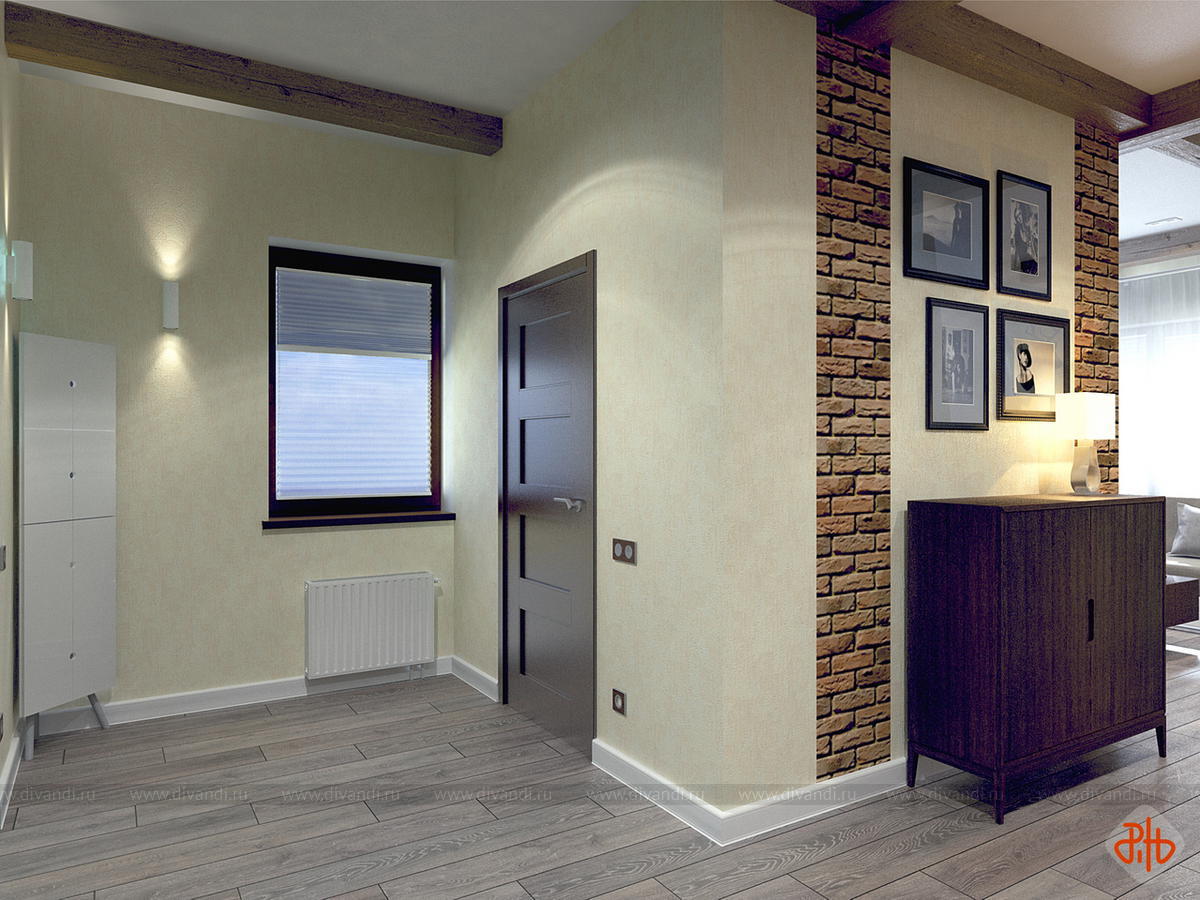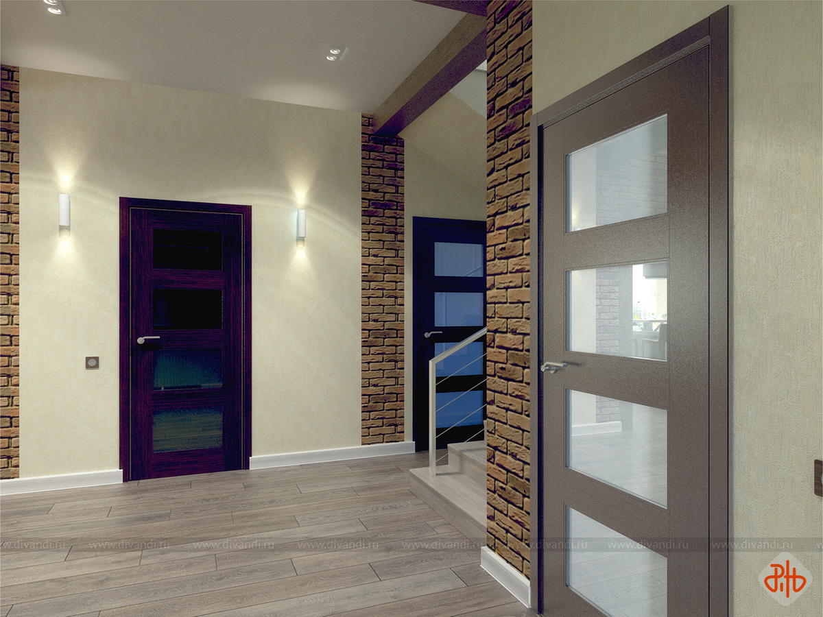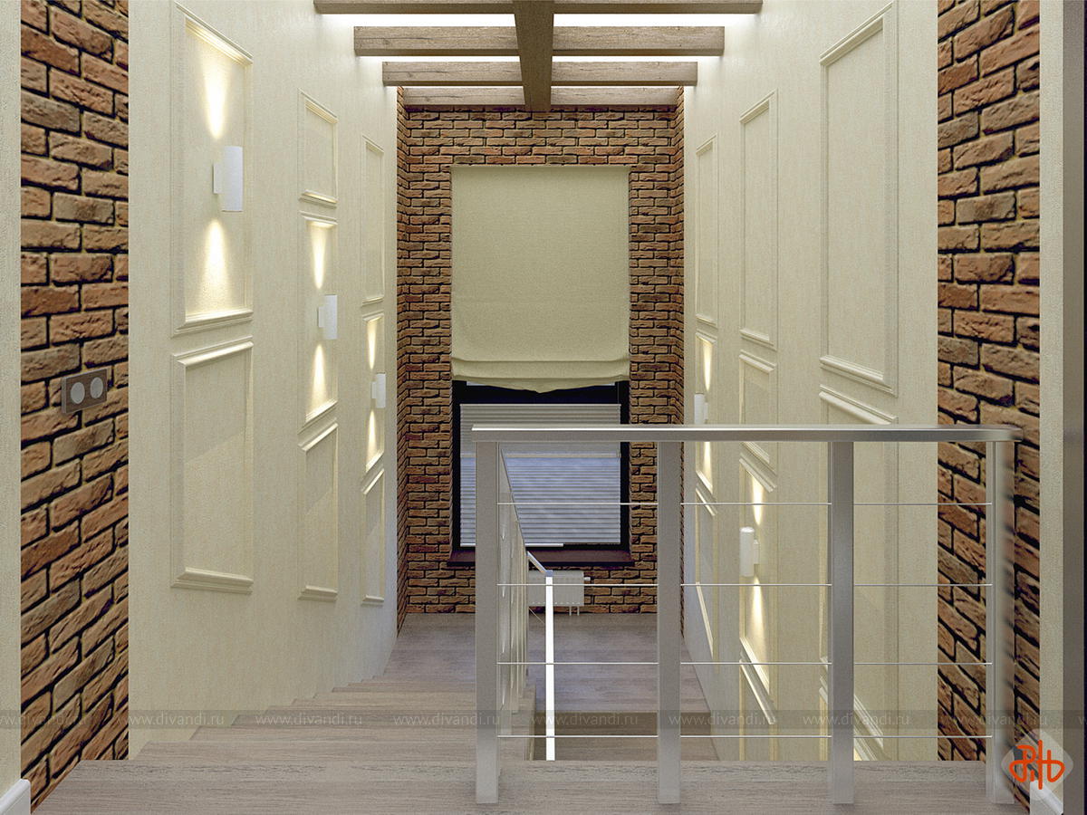 Интерьер лестницы и коридора в загородном доме с элементами немецкого стиля.