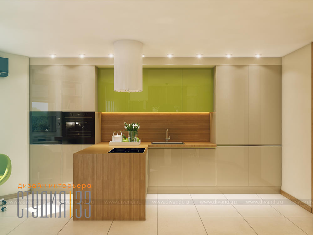 Проект кухни в современной стилистике. Приятные светлые цвета, атмосферно, комфортно. Всё что нужно современной хозяйке для приготовления еды в приятной обстановке