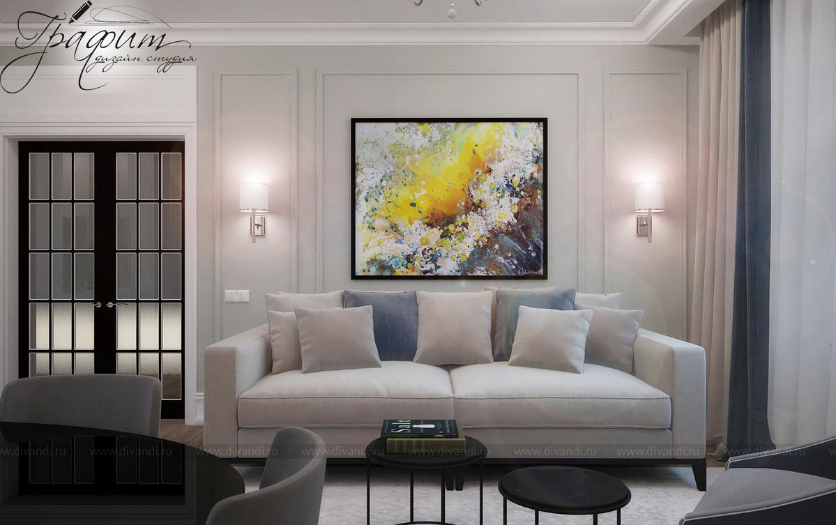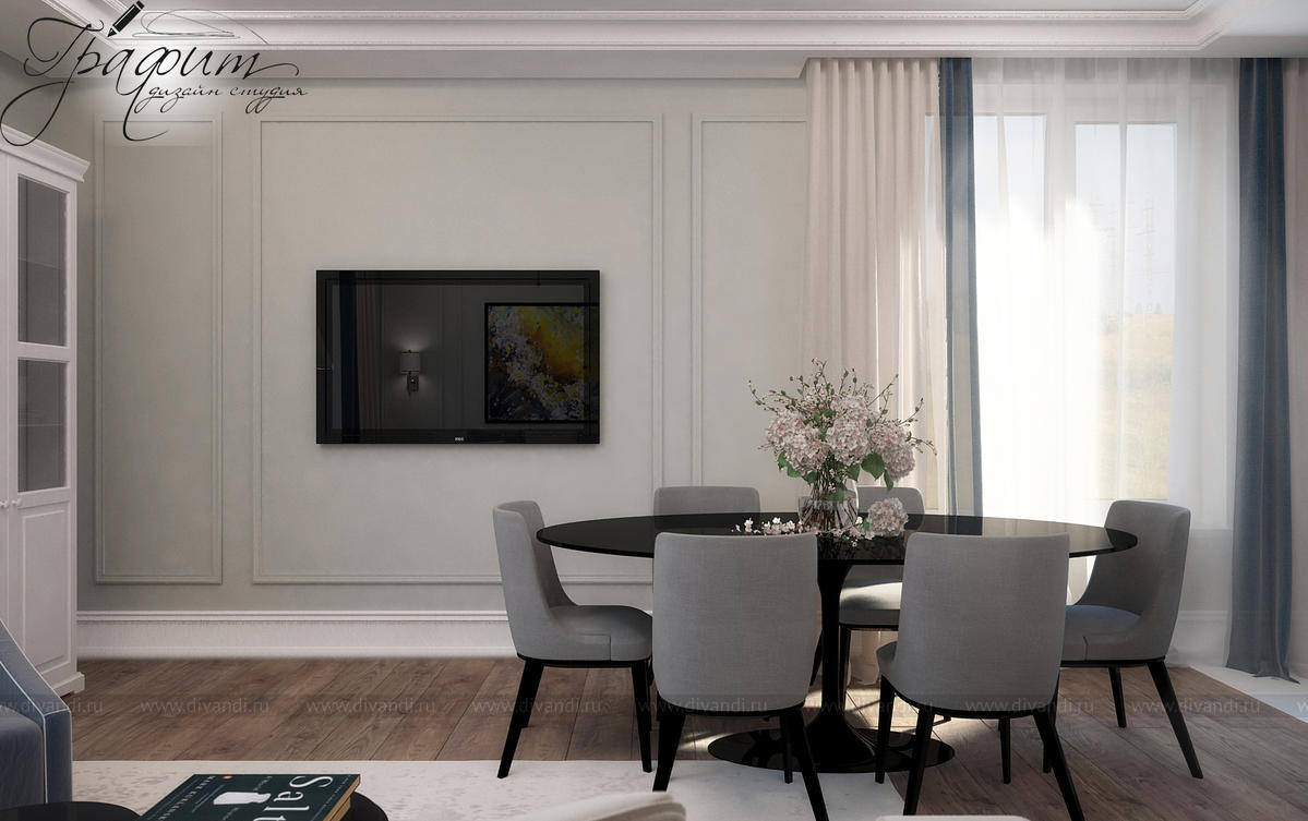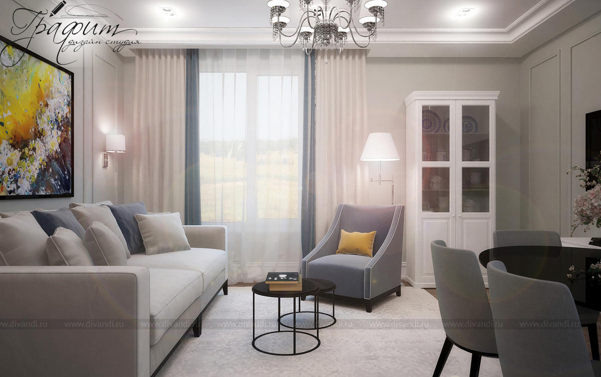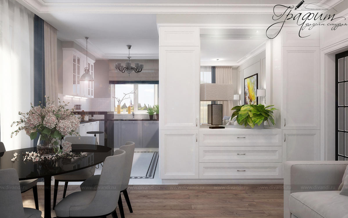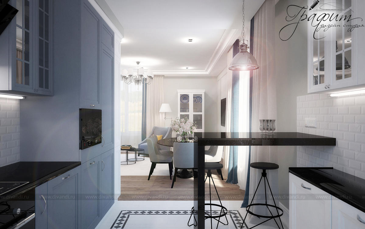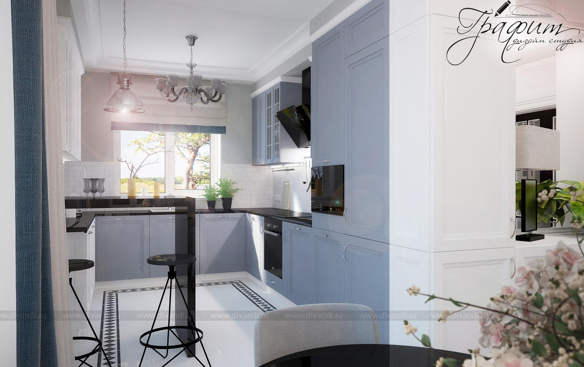 Проект кухни-гостиной в коттедже, г. Верхняя Салда. Выполнен в стиле современная классика.