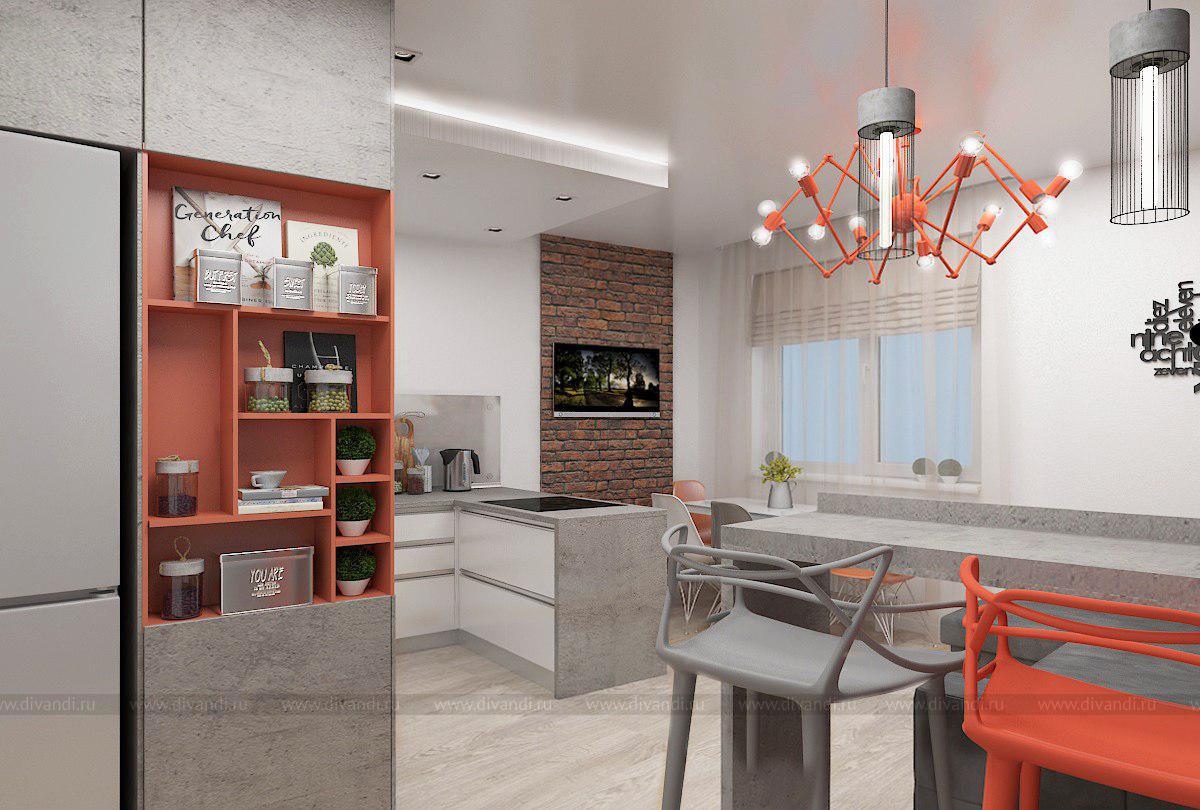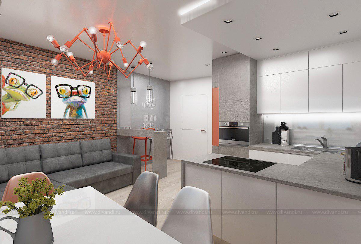 Интерьер для молодой пары в стиле "Лофт" с разными зонами для готовки, столовой и гостевой.