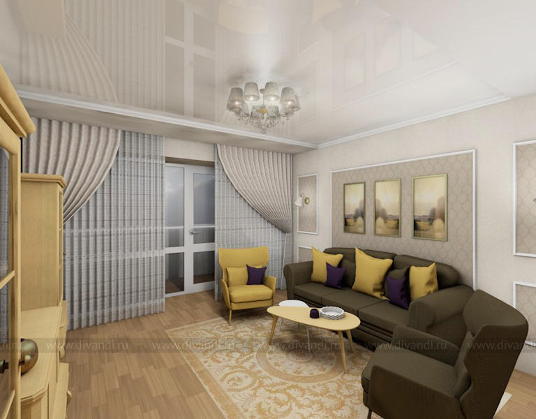 Цветовую гамму интерьера квартиры для семьи с детьми, в стиле "современной" классики, я построила на сочетании разных оттенков бежевого, теплого желтого и темно-фиолетового.