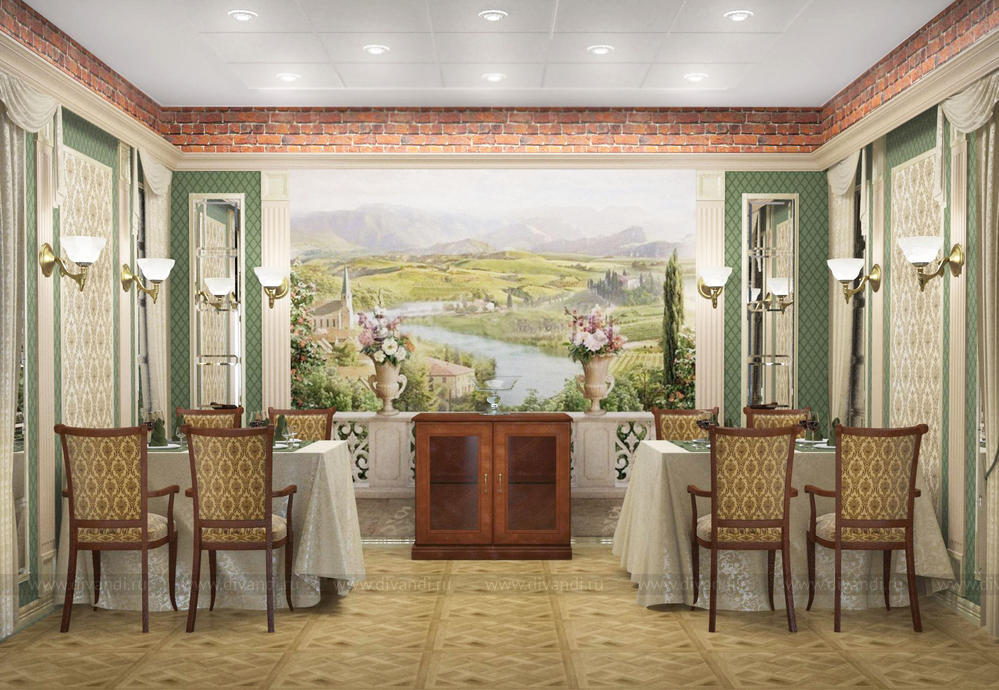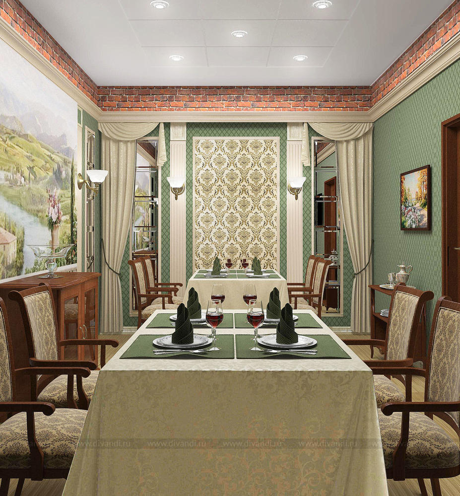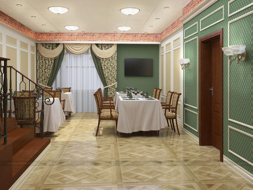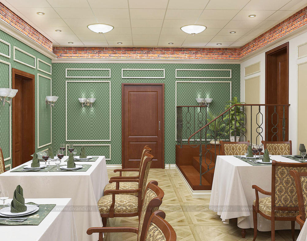 Проект ресторана в гостинице Екатеринбурга. Камерная обстановка небольшого ресторана создает особую атмосферу доверия и избранности.