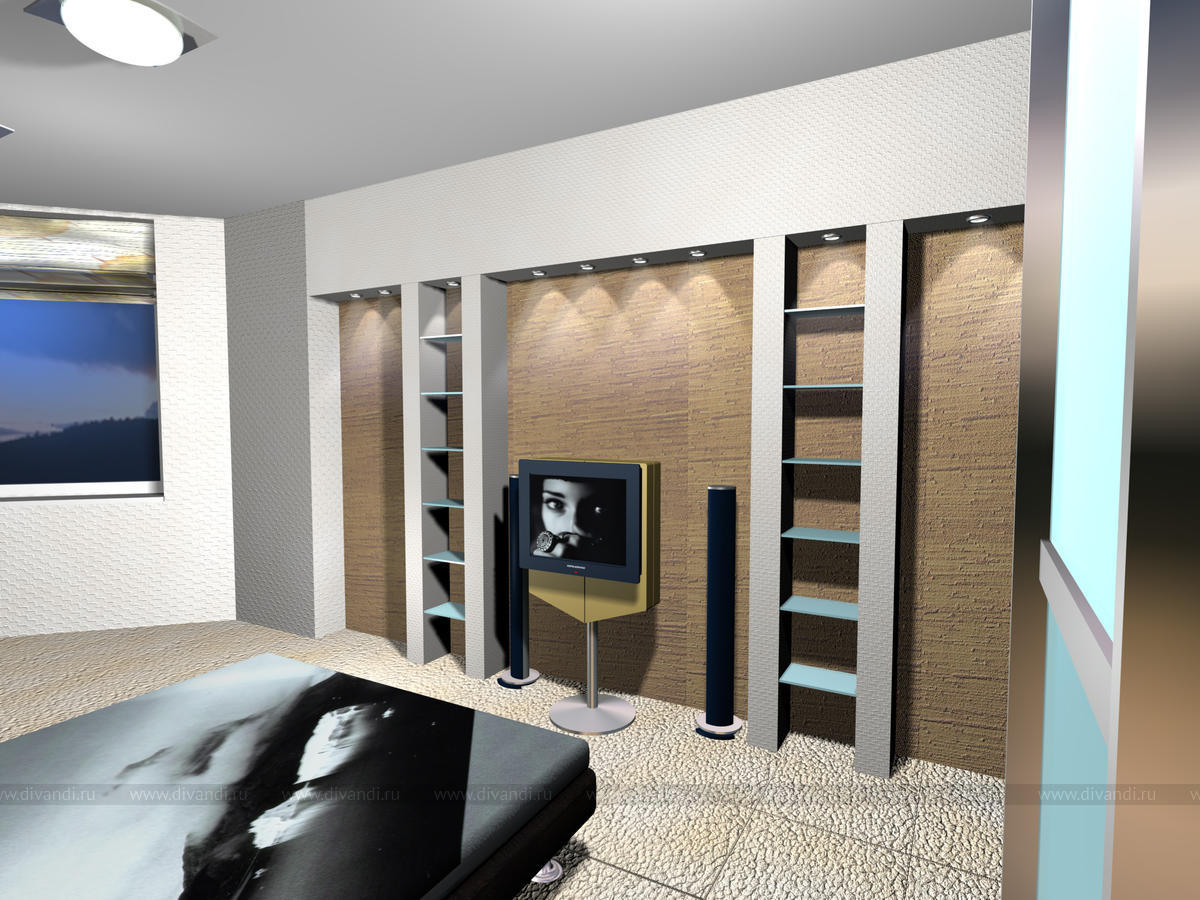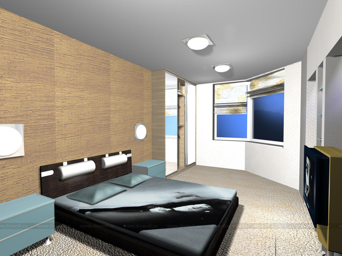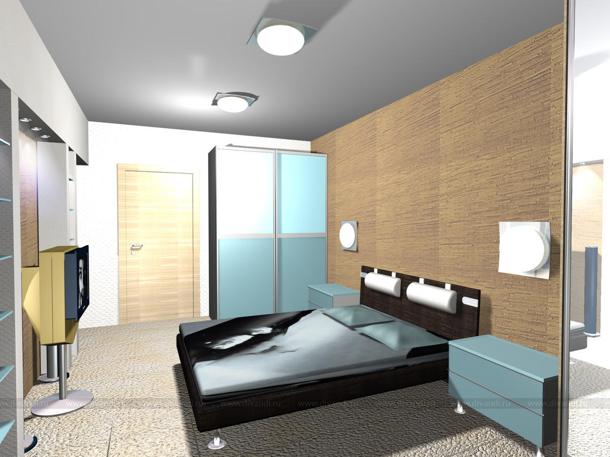 Гармоничное сочетание светлых стен с акцентной стеной теплых охристых тонов и мебели цвета Тиффани, позволяет хорошо отдохнуть и предаться мечтам в этой спальне.