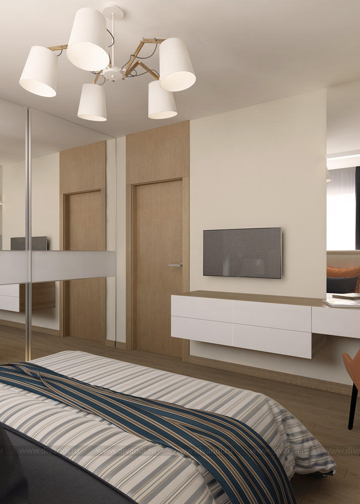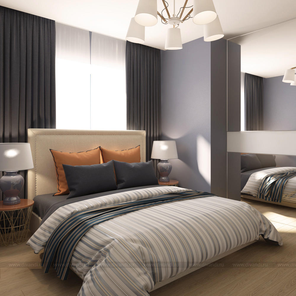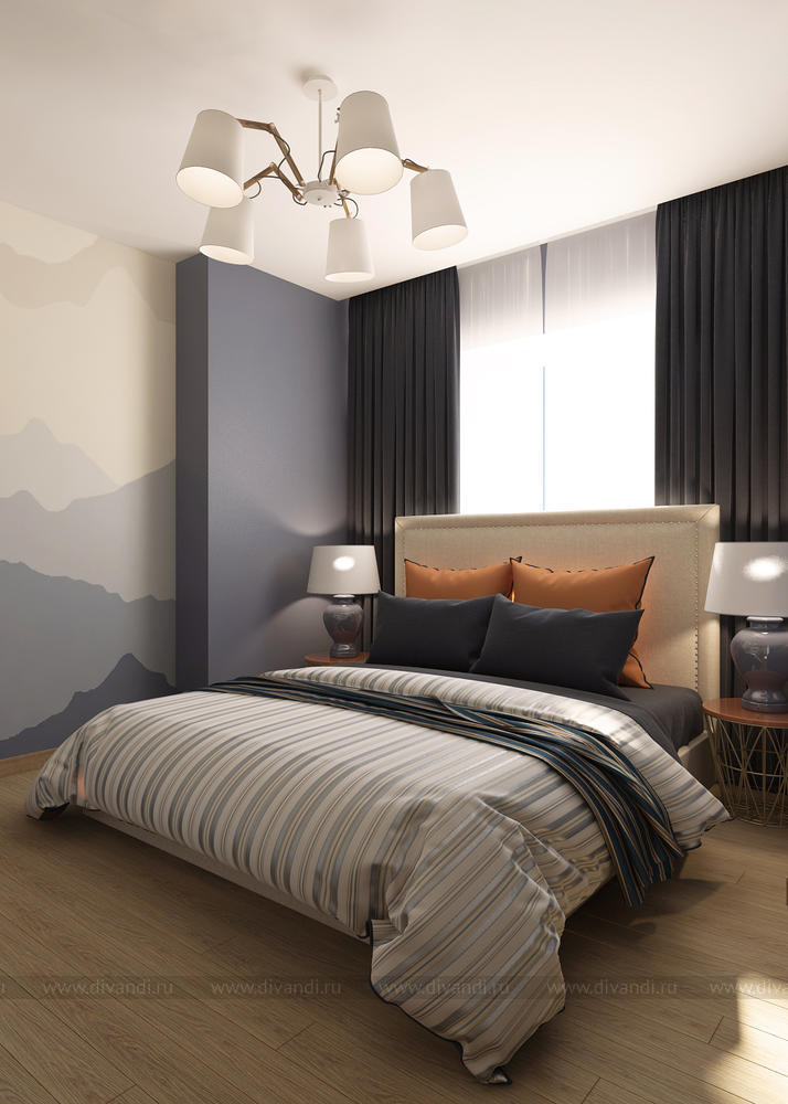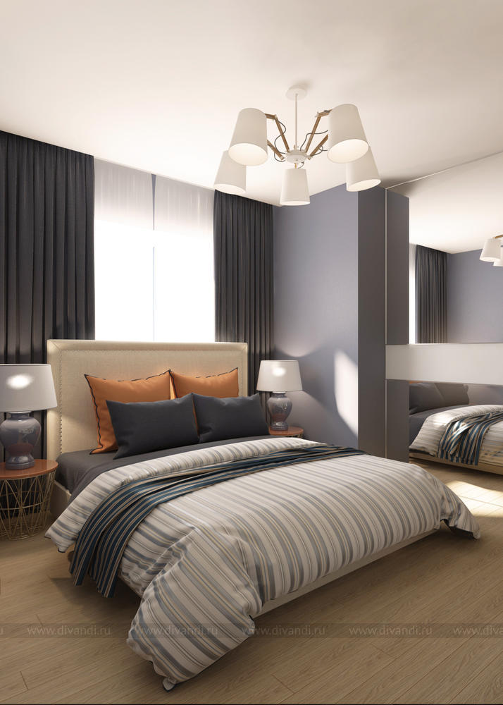 Приятная спальня, в которой гармонично сочетаются теплые и холодные цвета, светлые и темные оттенки. Уютная спальня для сладких и приятных снов