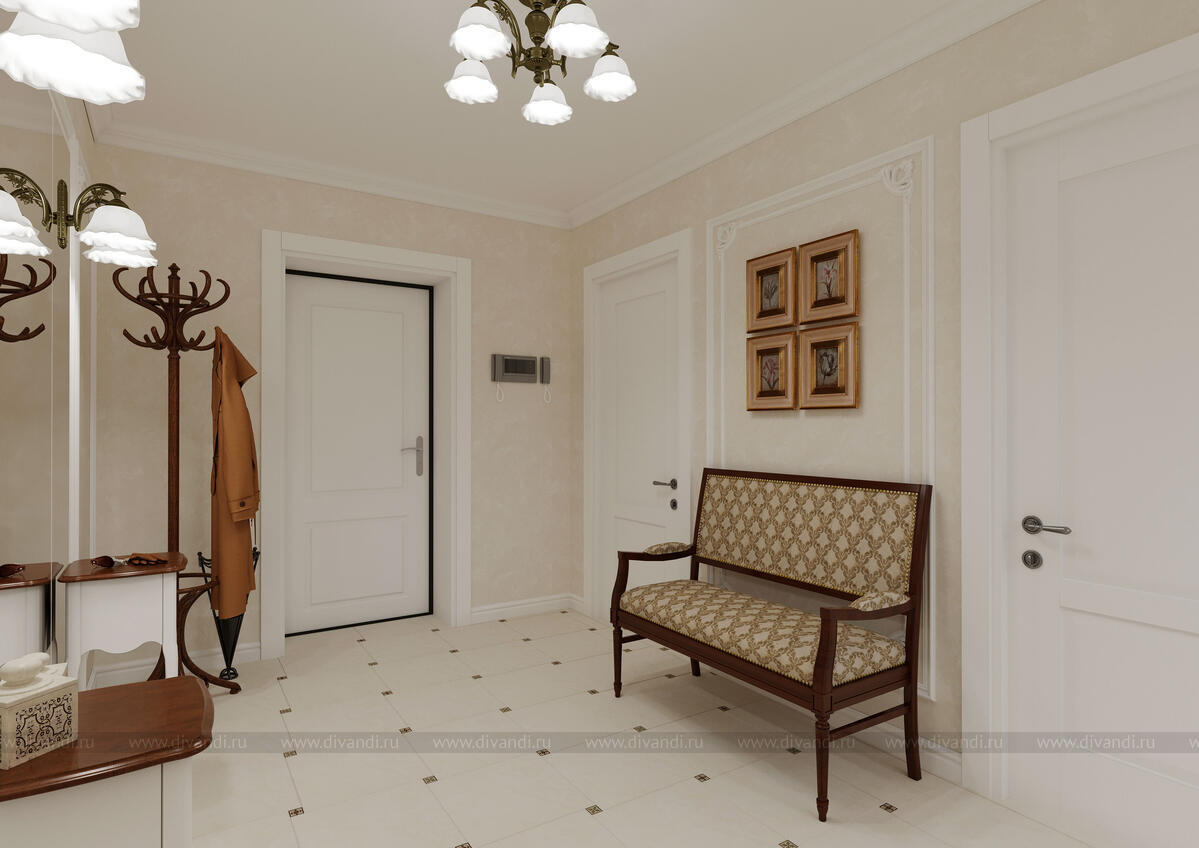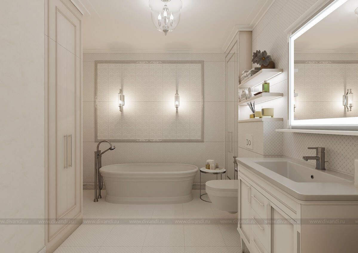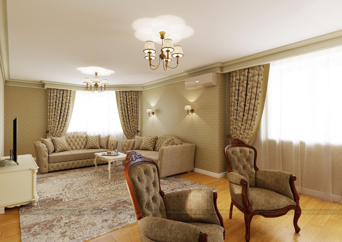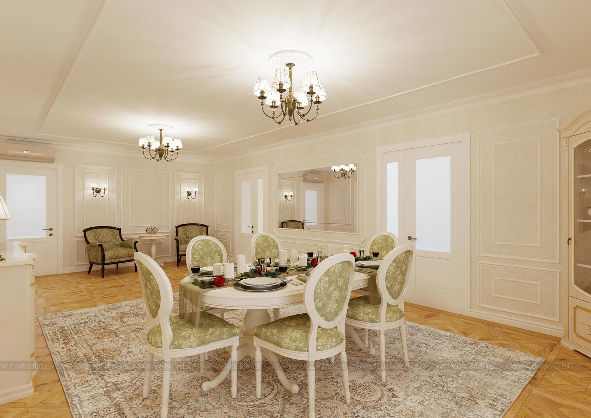 Заказчики этой большой и просторной квартиры точно знали как должен выглядеть интерьер их мечты. Вся мебель, освещение, отделка стен выбирались сразу на этапе визуализации, поэтому эскизы четко передают пожелание хозяев. Интерьер выполнен в классическом стиле в светлых тонах, стены оформлены декоративной штукатуркой с рамками из молдингов, на полу использован дубовый паркет. Акцентами в помещениях стали зеркала, фреска и роспись по трафарету. Хозяйка квартиры занимается вышиванием картин, поэтому после реализации проекта, они дополнят интерьер, и внесут особый уют и атмосферу.