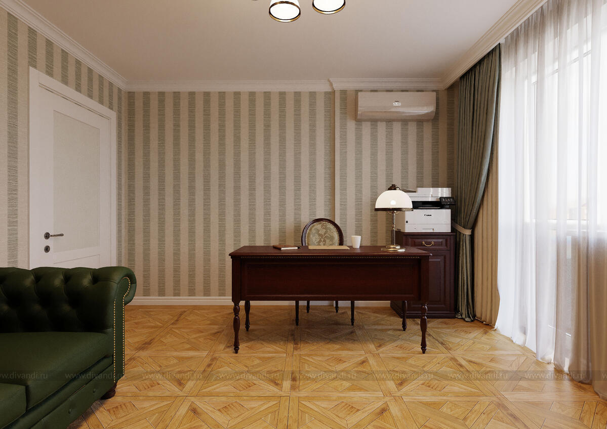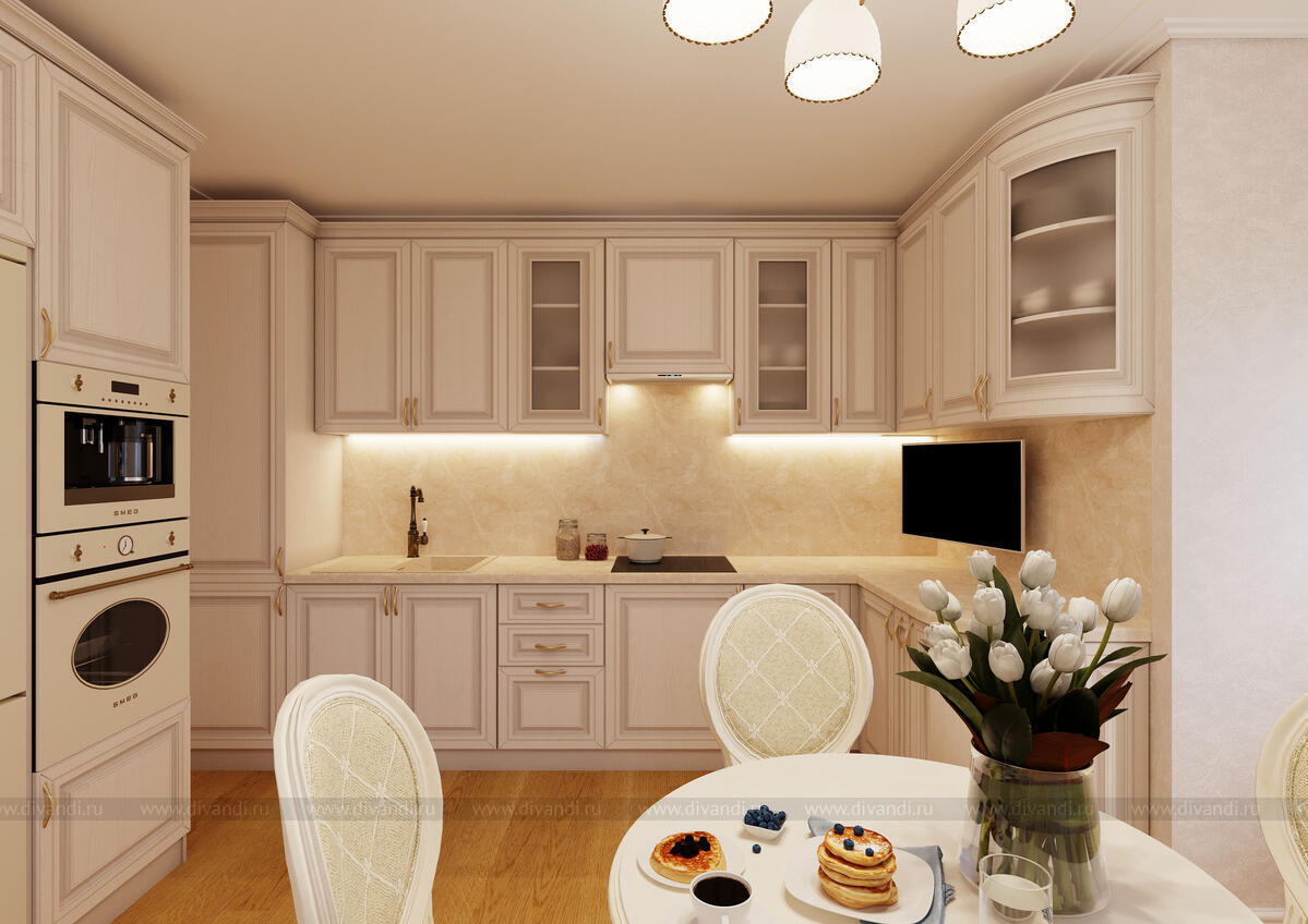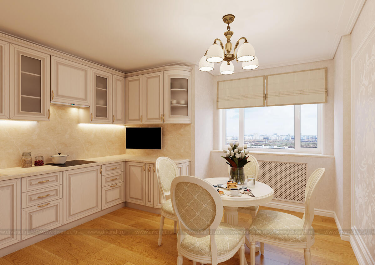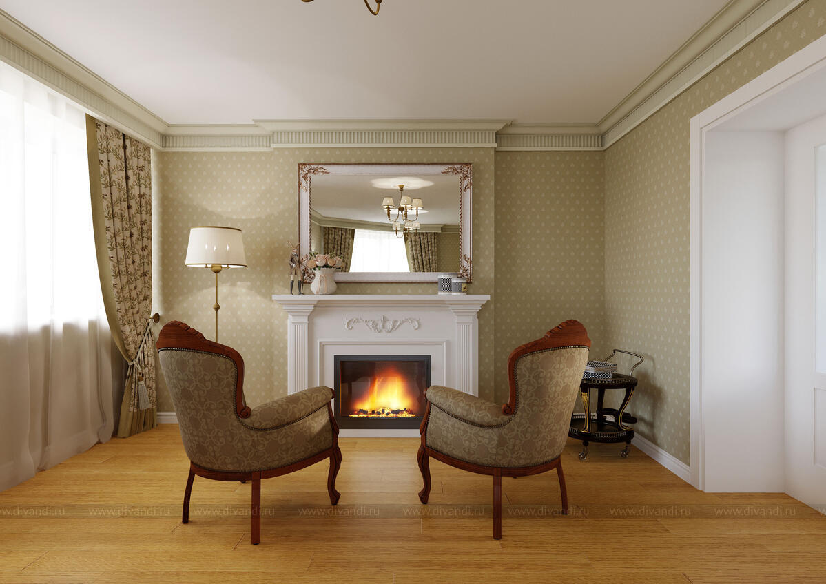 Заказчики этой большой и просторной квартиры точно знали как должен выглядеть интерьер их мечты. Вся мебель, освещение, отделка стен выбирались сразу на этапе визуализации, поэтому эскизы четко передают пожелание хозяев. Интерьер выполнен в классическом стиле в светлых тонах, стены оформлены декоративной штукатуркой с рамками из молдингов, на полу использован дубовый паркет. Акцентами в помещениях стали зеркала, фреска и роспись по трафарету. Хозяйка квартиры занимается вышиванием картин, поэтому после реализации проекта, они дополнят интерьер, и внесут особый уют и атмосферу.