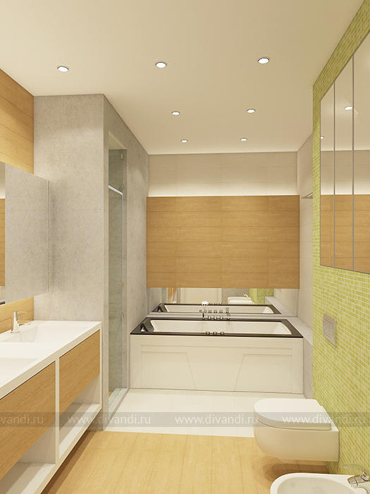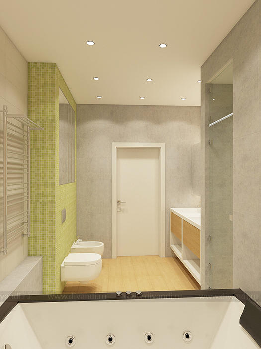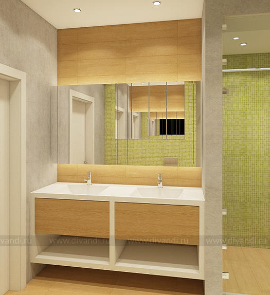 Современная, просторная, светлая ванна с уклоном к эко стилистике: бетон, текстура дерева и естественные природные цвета. Общее ощущение свежей и приятной ванны со всеми современными элементами комфорта и удобства.