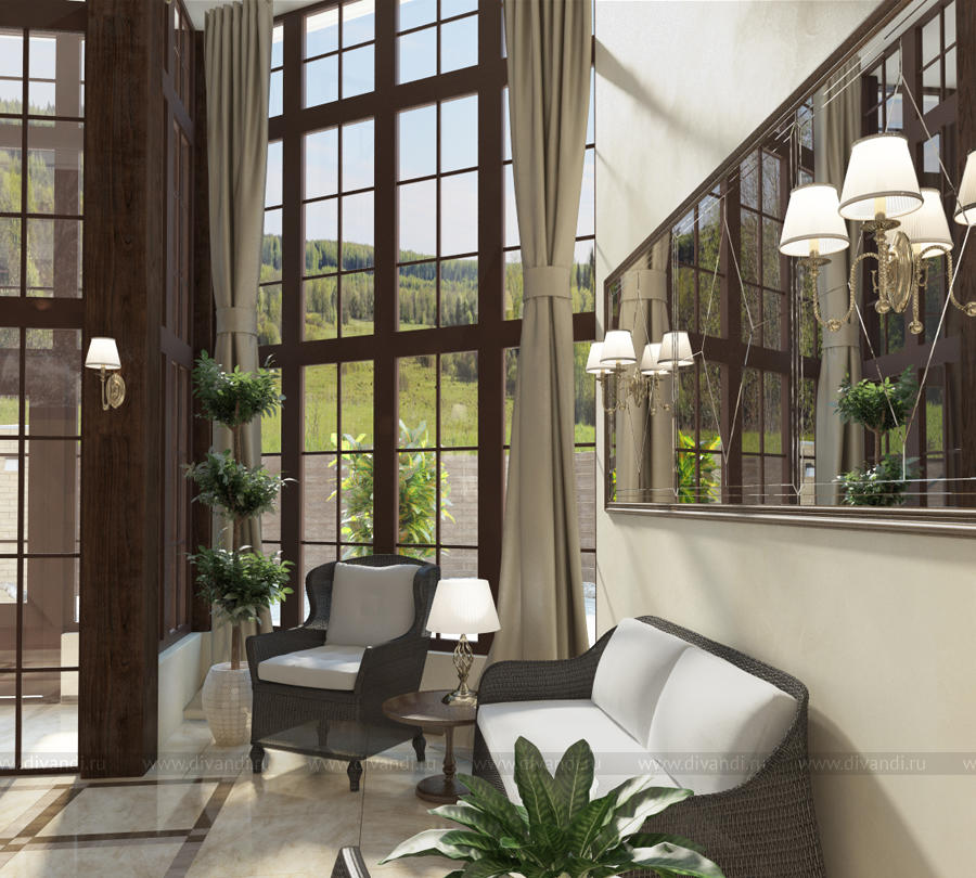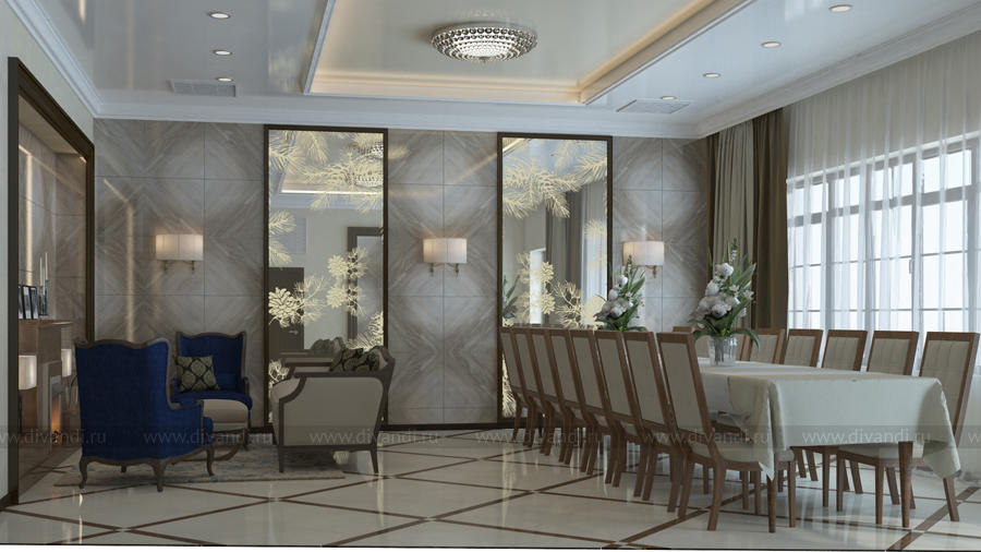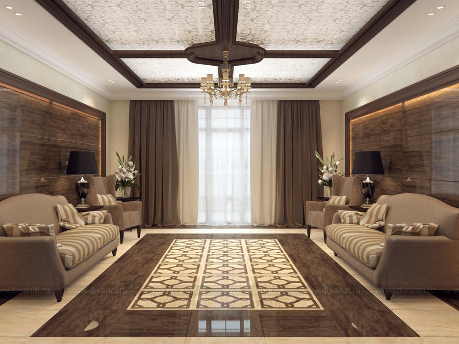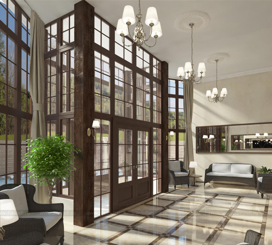 Гостиница начинается с парадного входа с панорамным остеклением, использовано контрастное сочетание цветов – светло-бежевого и благородного коричневого, на стенах классические бра с зеркальными панно-картинами, на потолке спущенные на цепочке люстры с резными розетками. Из парадного входа мы попадаем в центральный холл. Отделка стен и пола центрального холла первого и второго этажа выполнены в керамограните. Акценты в интерьере: две ниши оформленные темным молдингом и скрытой подсветкой, на потолке декоративное стекло с рисунком и подсветкой также оформленное темным молдингом. Респектабельность и размеренность интерьеру помещений придают светильники в стиле арт-деко.