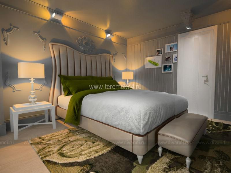 Сочетание барочных классических элементов в сочетании с деревенской вагонкой на стенах и природной темой текстуры ковра создали необыкновенную атмосферу простой роскоши. Интересное размещение осветительных приборов дает возможность создавать различные сценарии, включающиеся в себя как мягкое интимное освещение, так и концентрированное акцентное. На стенах декоративная деревянная вагонка, окрашенная в благородный серый цвет, возле кровати лепные элементы создающие настроение легкой незавершенности