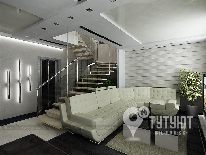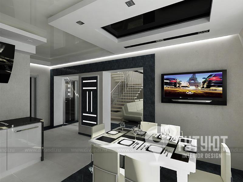 Современный интерьер создавался для молодой семьи. Интерьер построен на контрасте цветов и игры фактур. Эффектная лестница на тросах играет центральную роль в общем пространстве квартиры. Благодаря ее легкой конструкции удалось поддержать тему лаконичности линий в интерьере и функционально мебелировать диванную зону общественного пространства. Кухня столовая решена в черно-белой гамме. Кухня выполнена из каленого белого стекла с черной столешницей из искусственного камня.