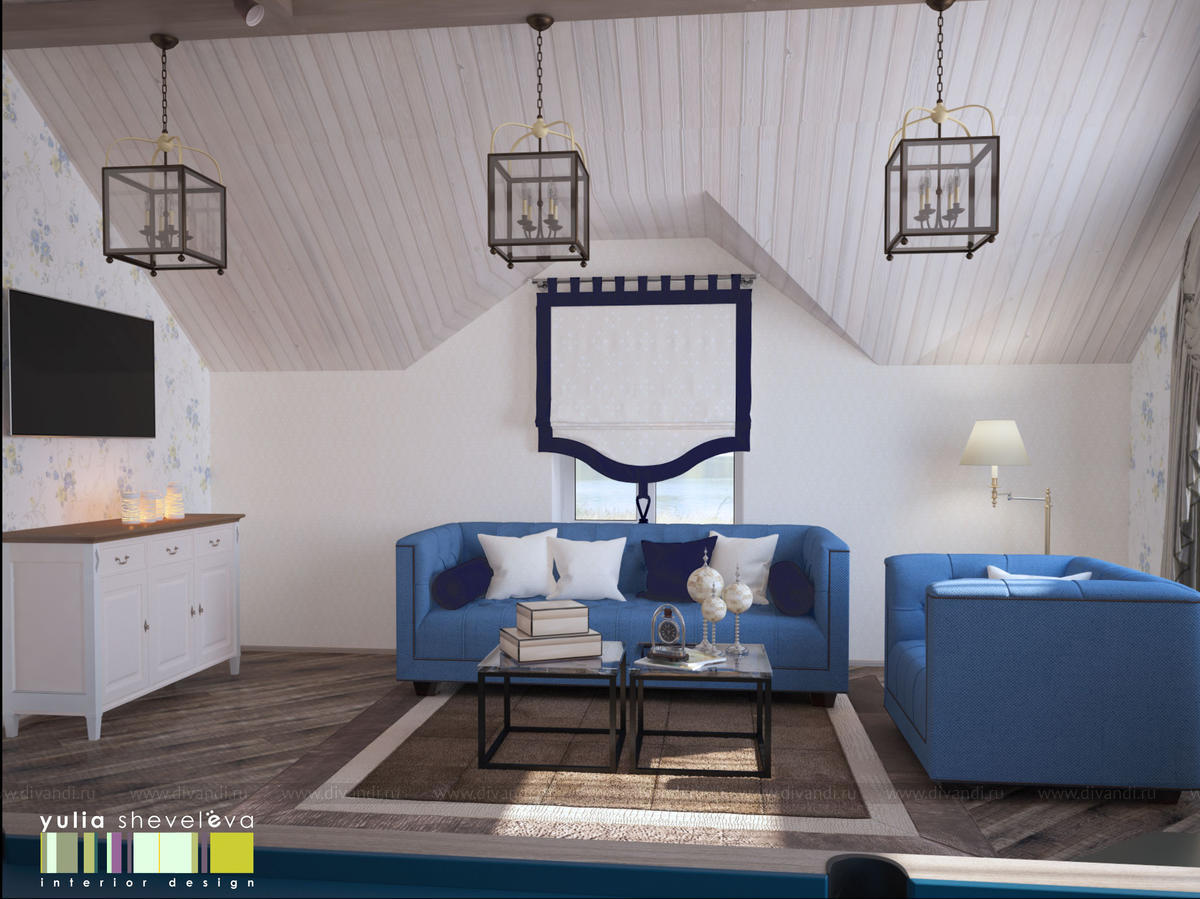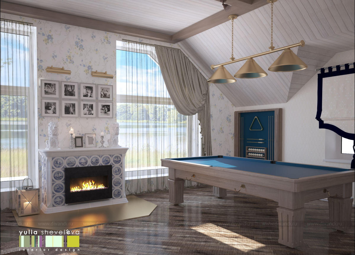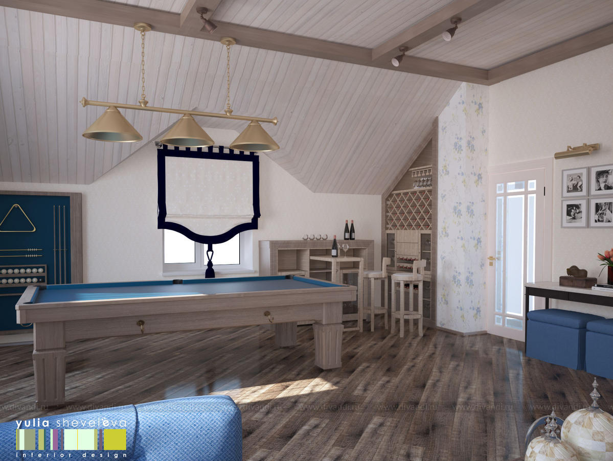 Дизайн-проект мансарды двухэтажного дома. Хозяева не знали, как поступить с этим помещением: то ли сделать спальню или гостиную, бильярдную или кинозал. В результате сошлись во мнении, что это будет многофункциональное помещение: зона для сна и отдыха, просмотра телевизора, а также бильярдная. Барную зону решили сделать со складной столешницей, чтобы освободить место для игры в бильярд. По стилю клиентам хотелось совместить два стиля: "прованс" и "лофт". Казалось бы, что общего у этих двух совершенно разных направлений? За основу был взят стиль "прованс", с его цветовой гаммой и элементами декора и оформления. Из стиля "лофт" были заимствованы светильники и некоторые элементы декора.