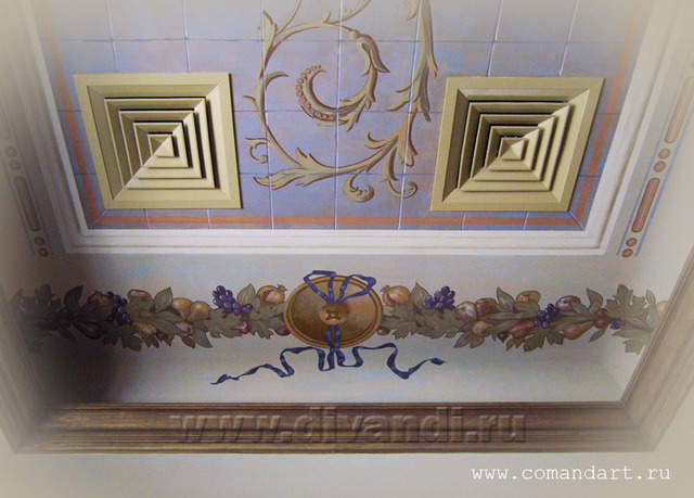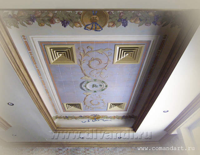 В кухне-столовой царит атмосфера Прованса. На потолке с помощью росписи создана иллюзия керамики.