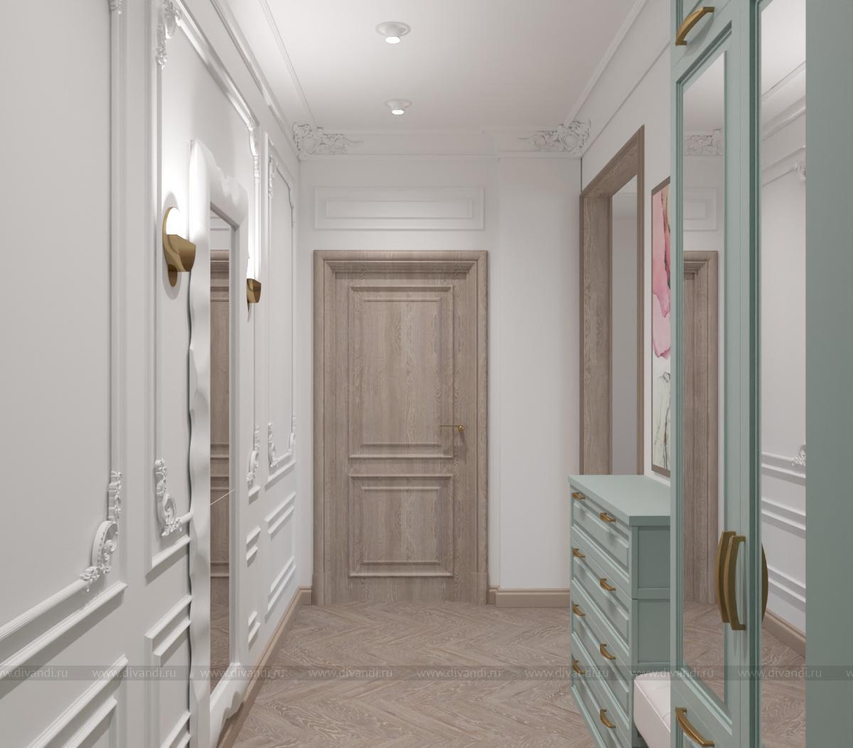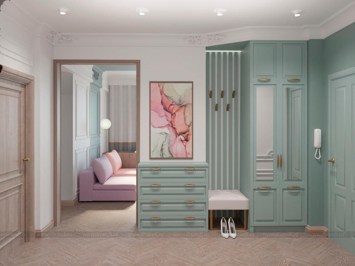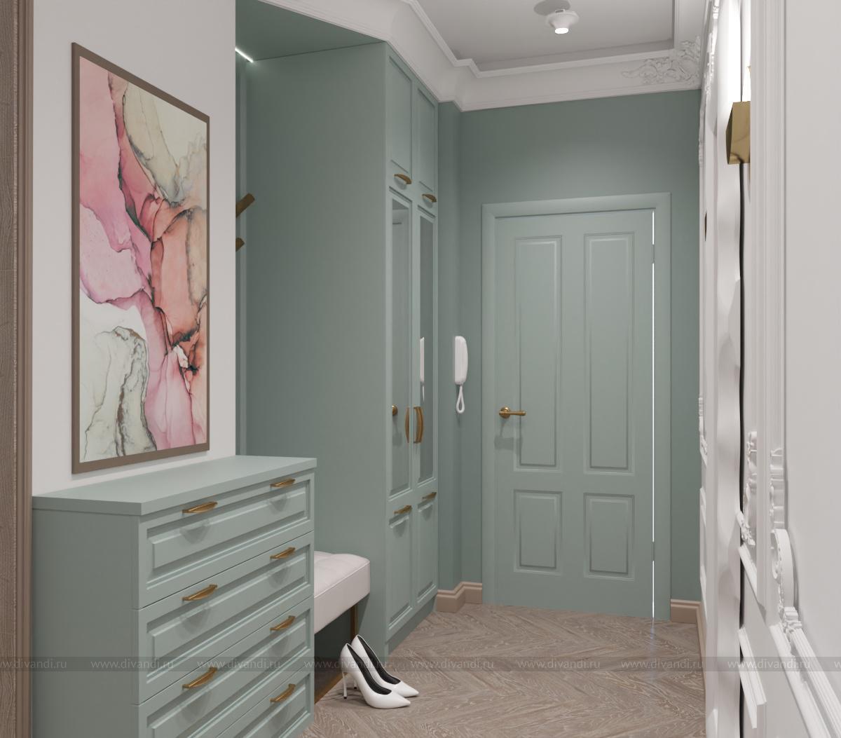 Клиентка просила сохранить архитектуру, настроение времени= нео классику, с элементами лепного декора. И добавить современных сочных красок, заявлено было: бирюза+коралл. Так немного трансформировав бирюзу в модный оттенок припыленного зеленого получилась такая светлая и веселая квартира.