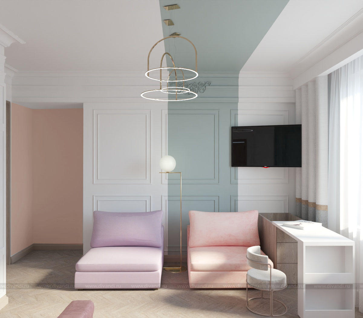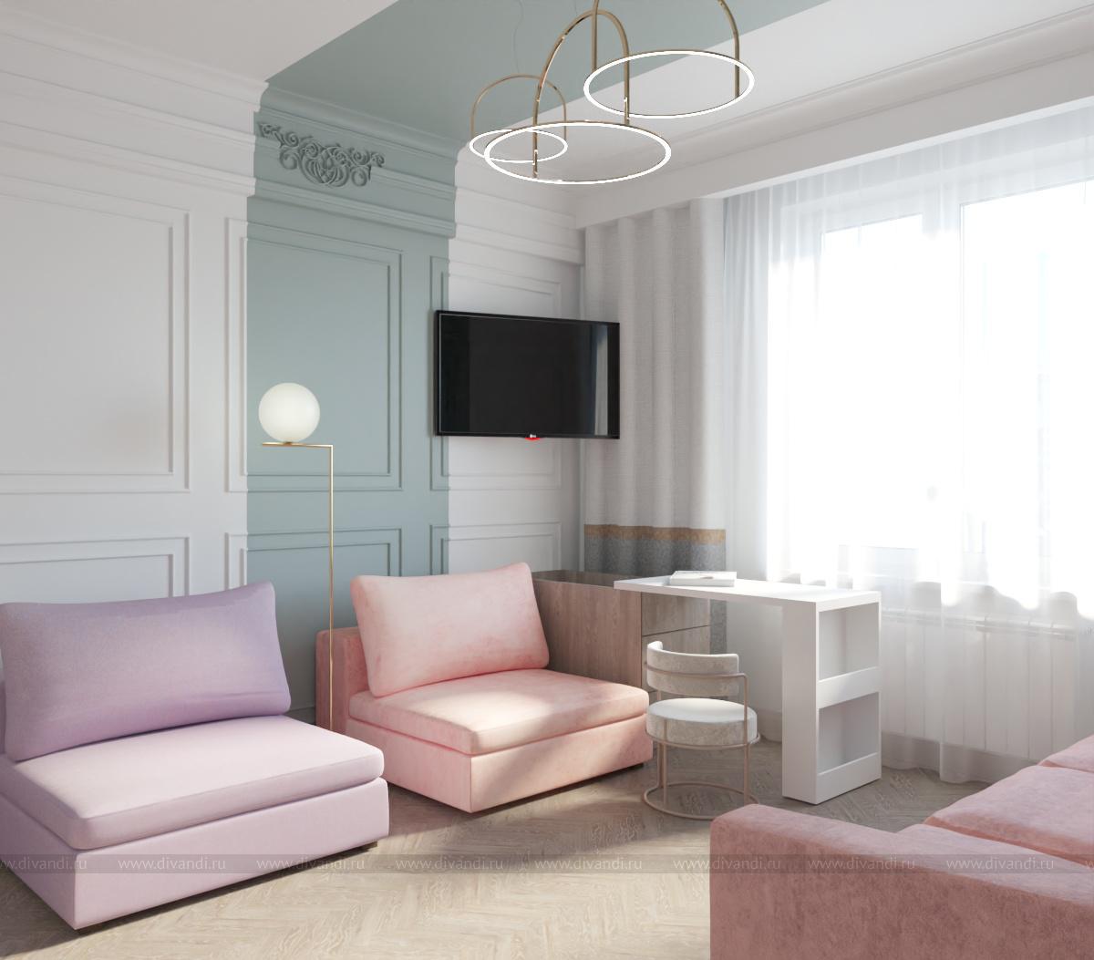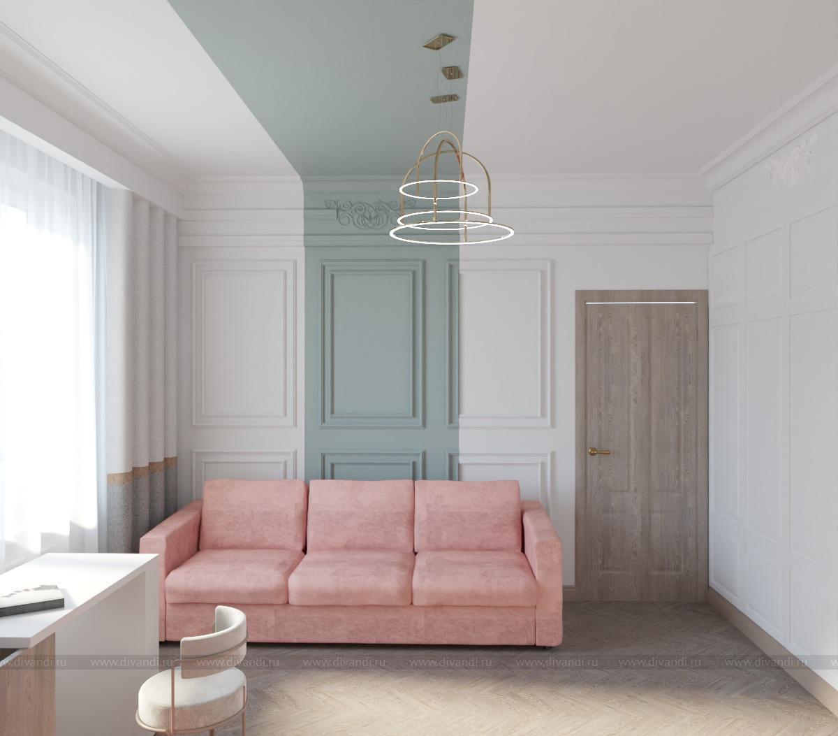 Клиентка просила сохранить архитектуру, настроение времени= нео классику, с элементами лепного декора. И добавить современных сочных красок, заявлено было: бирюза+коралл. Так немного трансформировав бирюзу в модный оттенок припыленного зеленого получилась такая светлая и веселая квартира.