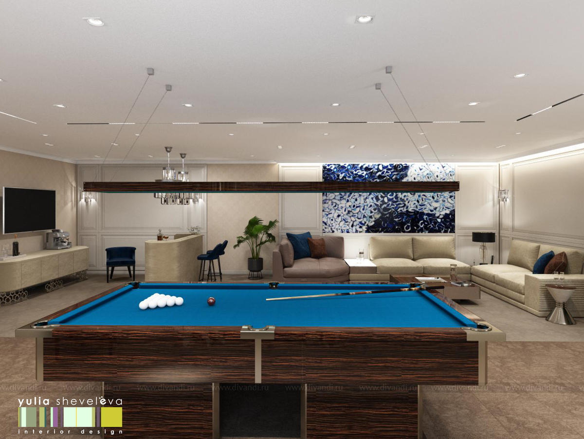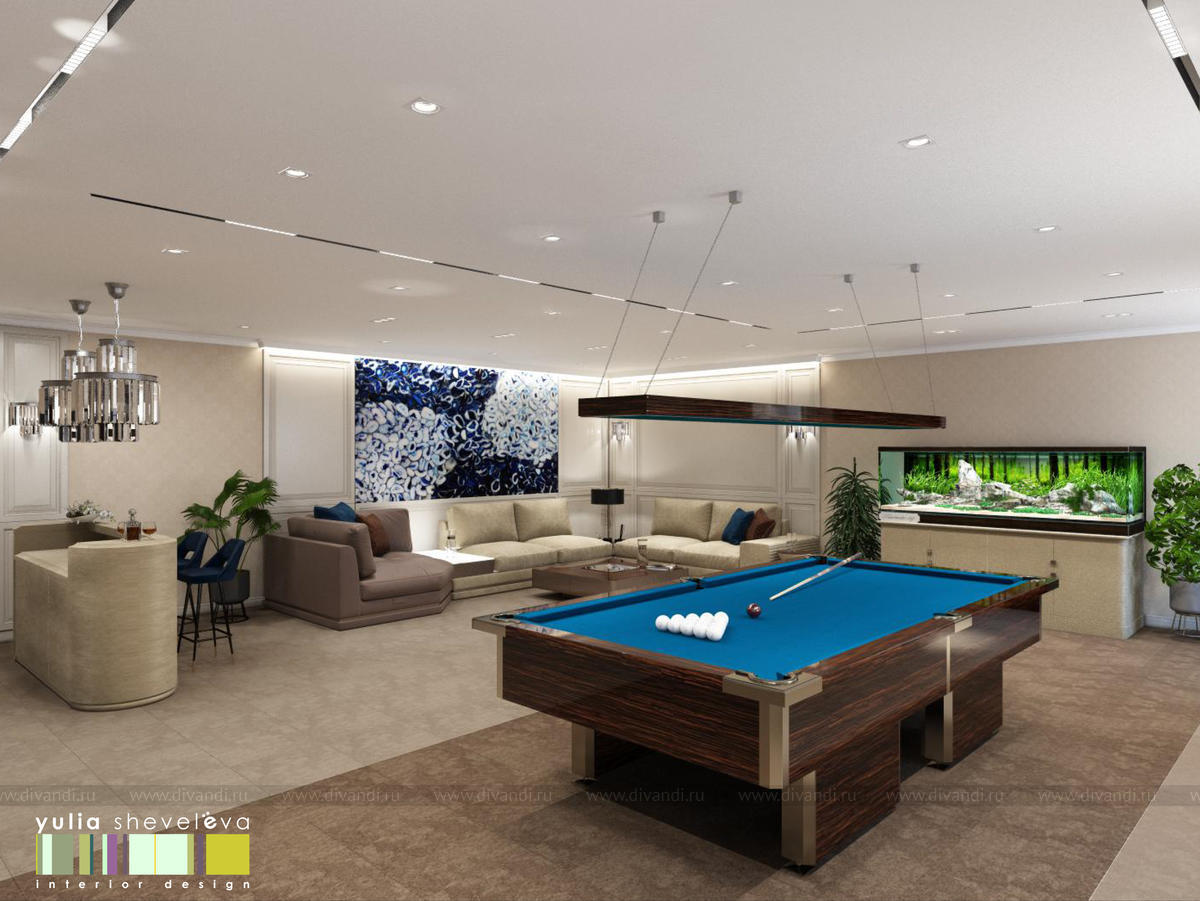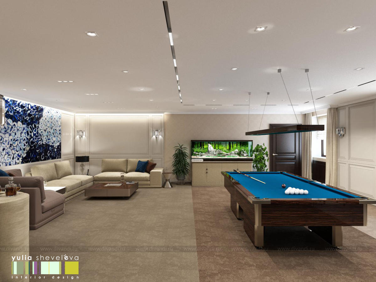 В бильярдной центральное место занимает игровой стол, который выполнен на заказ. Стены также оформлены деревянными панелями, за зоной дивана расположено авторское панно из натурального агата. Стулья и торшер голландской фабрики Eichholtz, тумба под аквариум и диваны выполнены на заказ из итальянской алькантары.