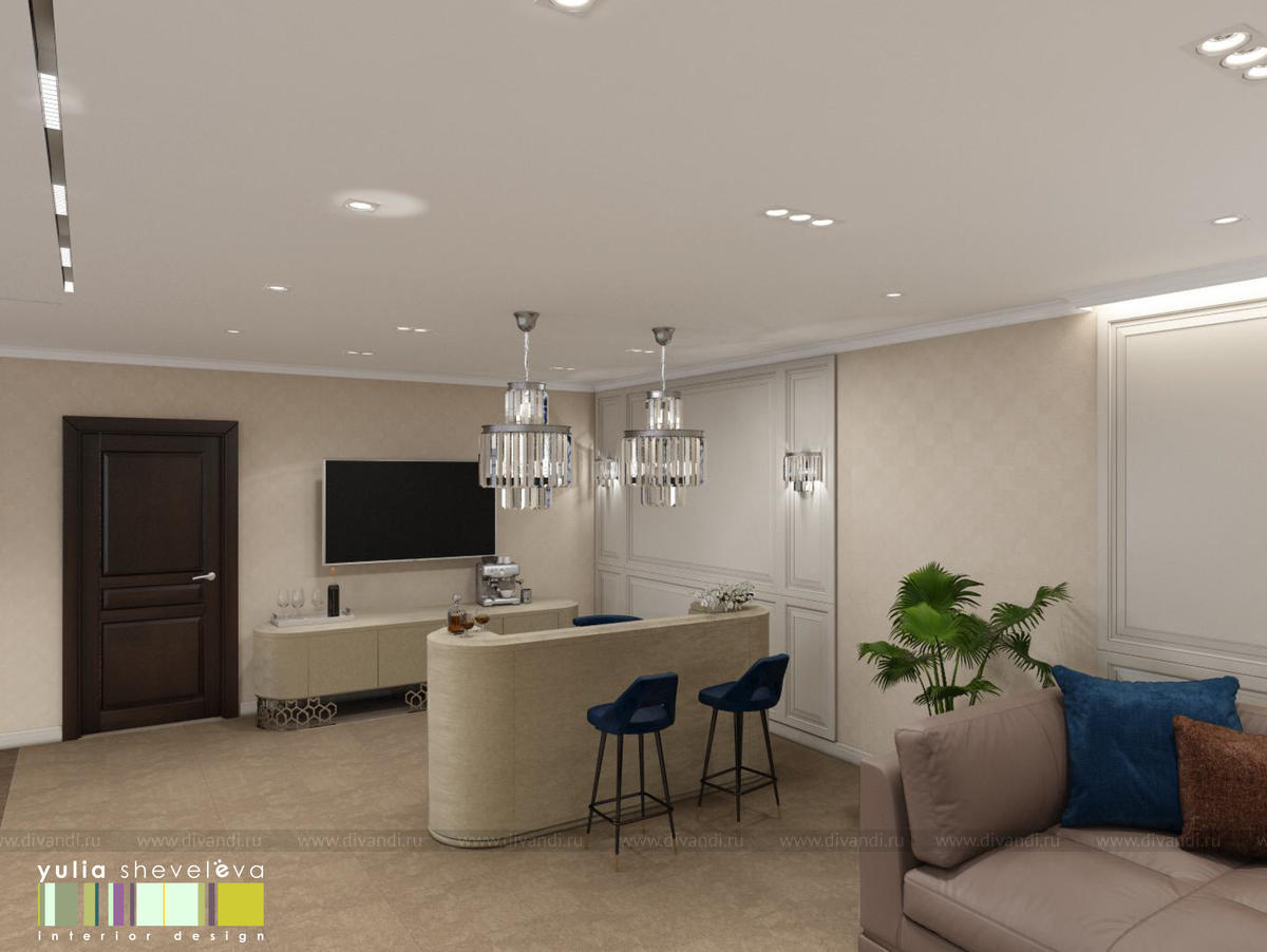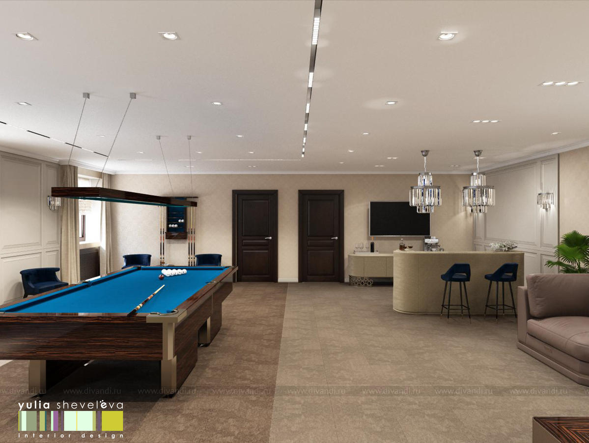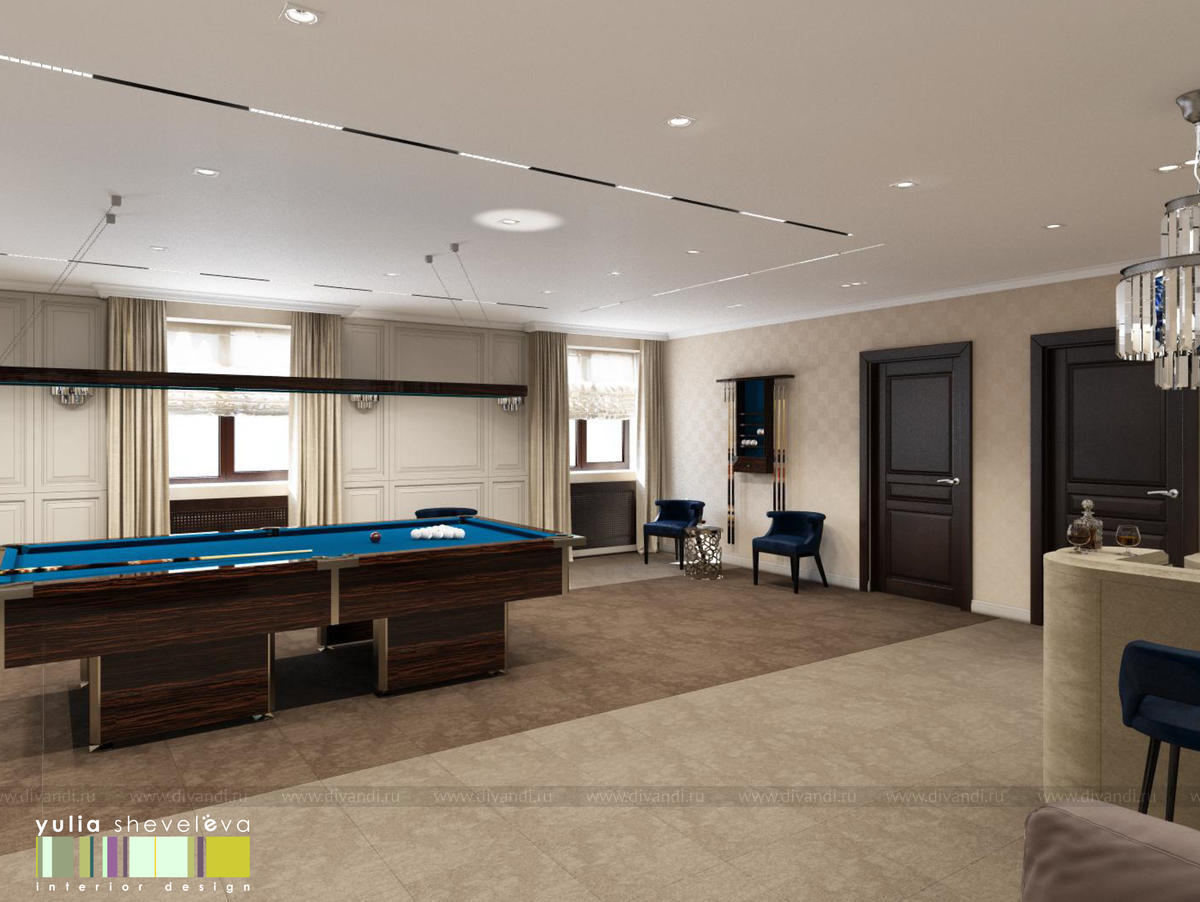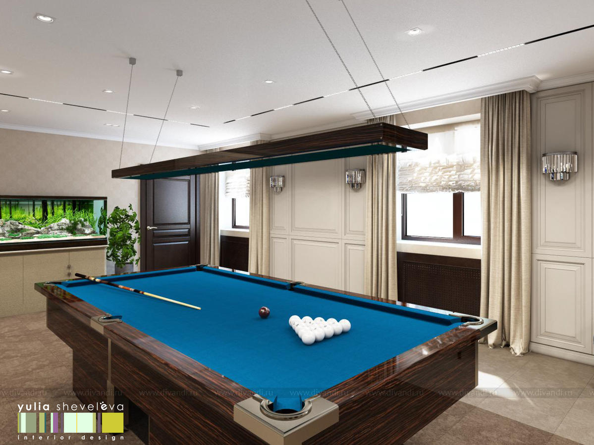 В бильярдной центральное место занимает игровой стол, который выполнен на заказ. Стены также оформлены деревянными панелями, за зоной дивана расположено авторское панно из натурального агата. Стулья и торшер голландской фабрики Eichholtz, тумба под аквариум и диваны выполнены на заказ из итальянской алькантары.