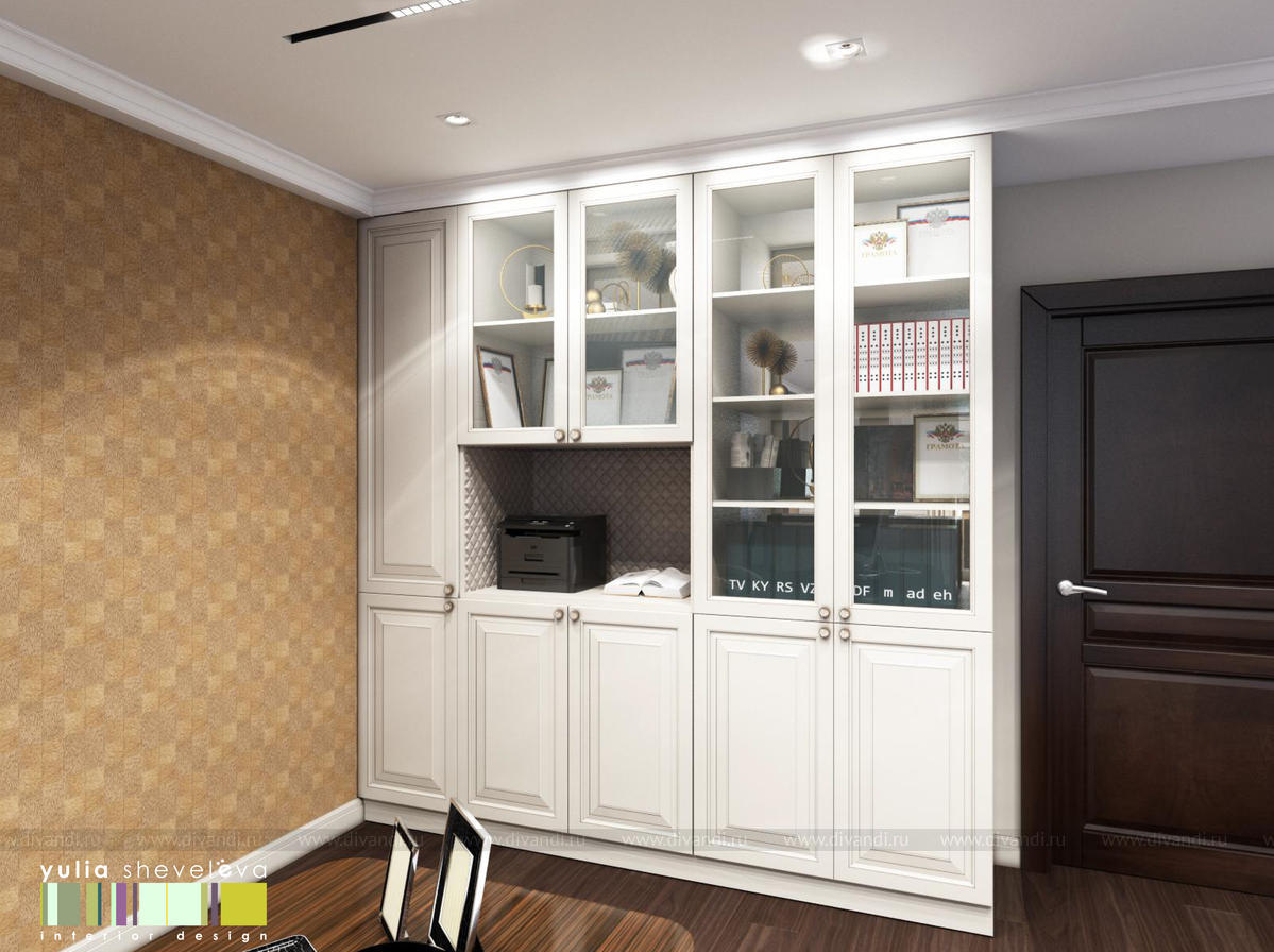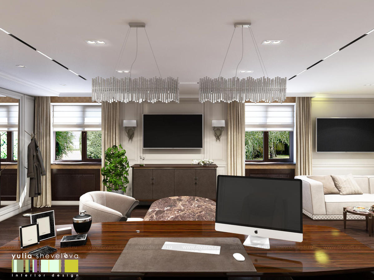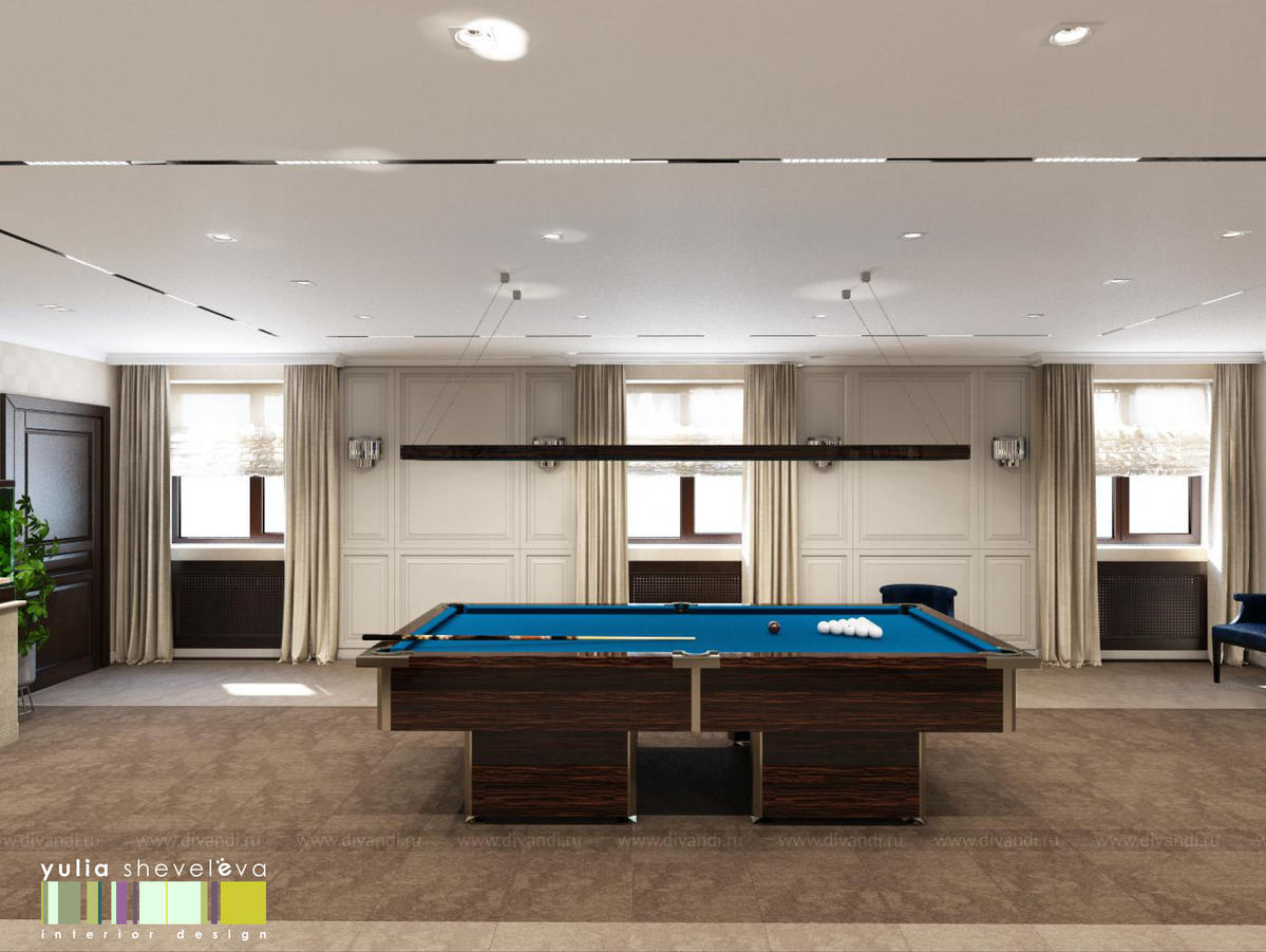 Помещения кабинета и бильярдная - смежные, поэтому стилистически выдержаны, цветовая палитра немного отличается. Стены декорированы деревянными панелями, на полу в кабинете - дубовая паркетная доска. Потолок небольшой по высоте, поэтому максимально использовано встроенное освещение. Стол руководителя использован фабрики Longhi, комод и шкаф для документов спроектирован на заказ.