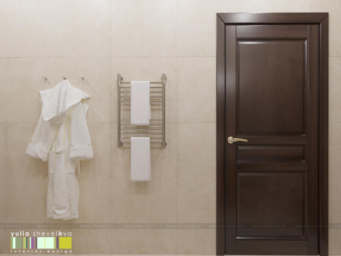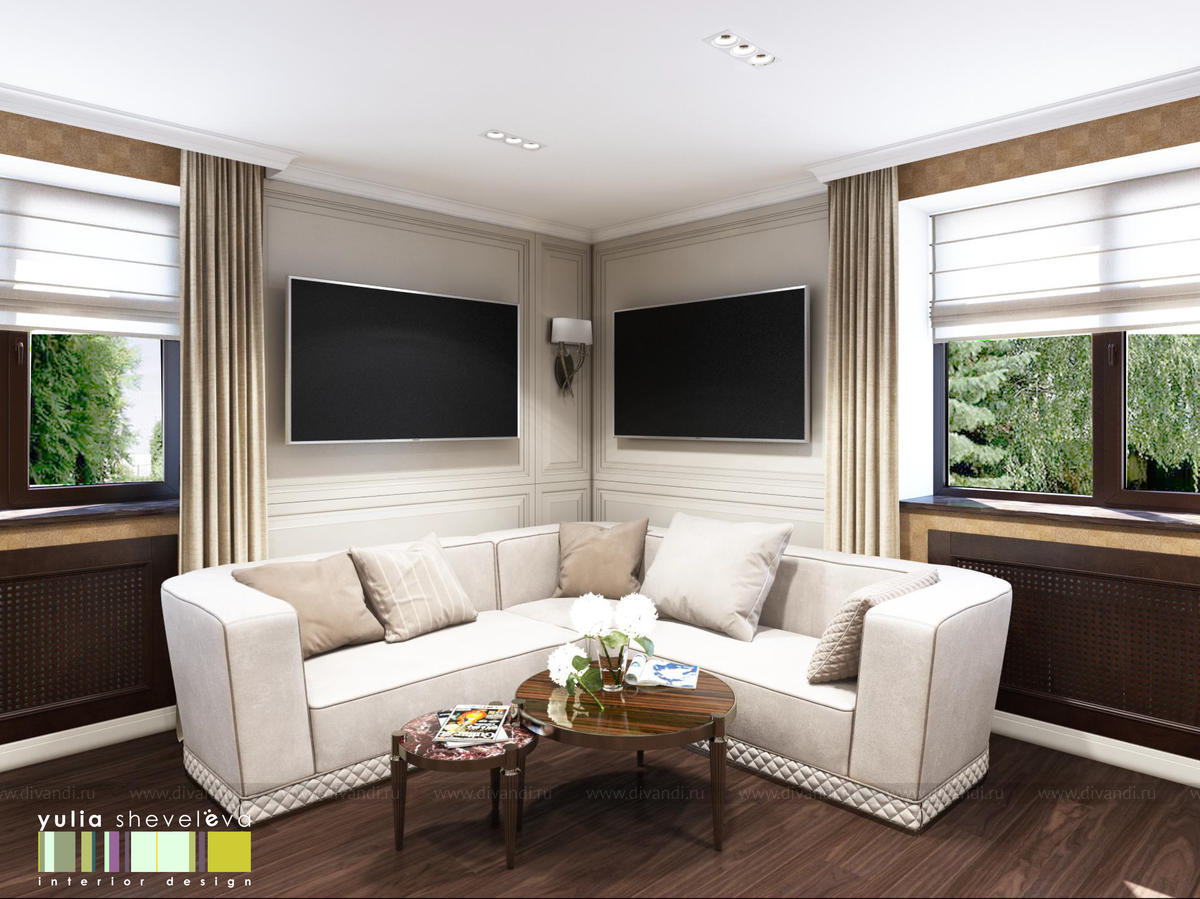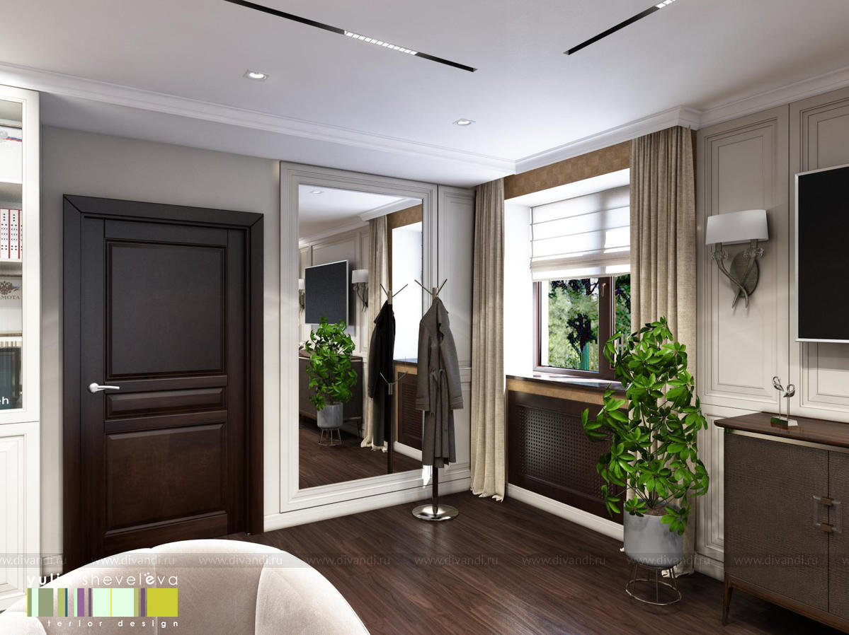 Помещения кабинета и бильярдная - смежные, поэтому стилистически выдержаны, цветовая палитра немного отличается. Стены декорированы деревянными панелями, на полу в кабинете - дубовая паркетная доска. Потолок небольшой по высоте, поэтому максимально использовано встроенное освещение. Стол руководителя использован фабрики Longhi, комод и шкаф для документов спроектирован на заказ.