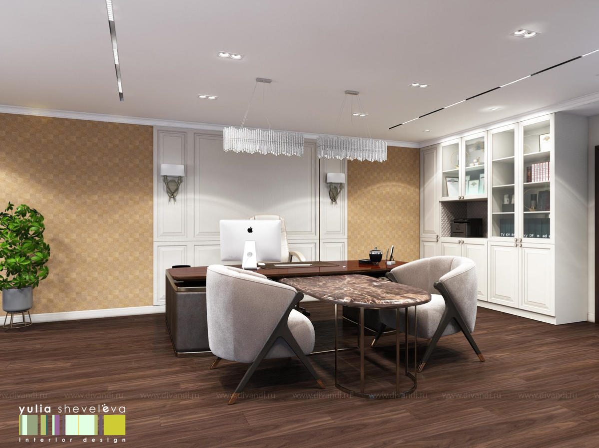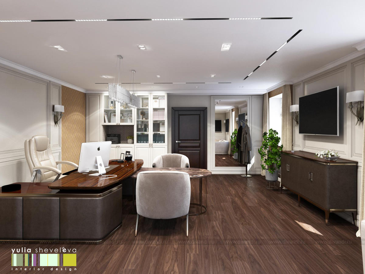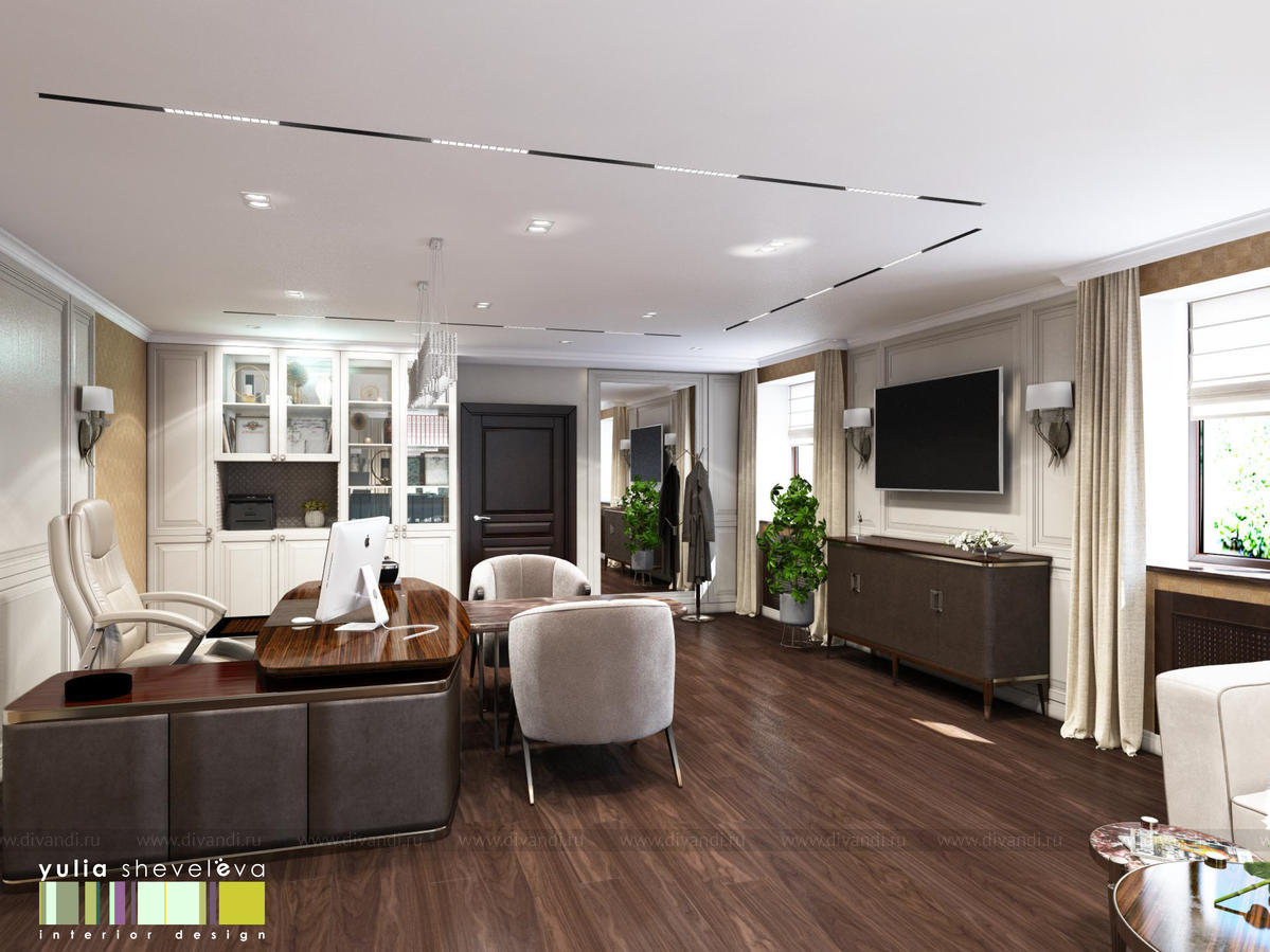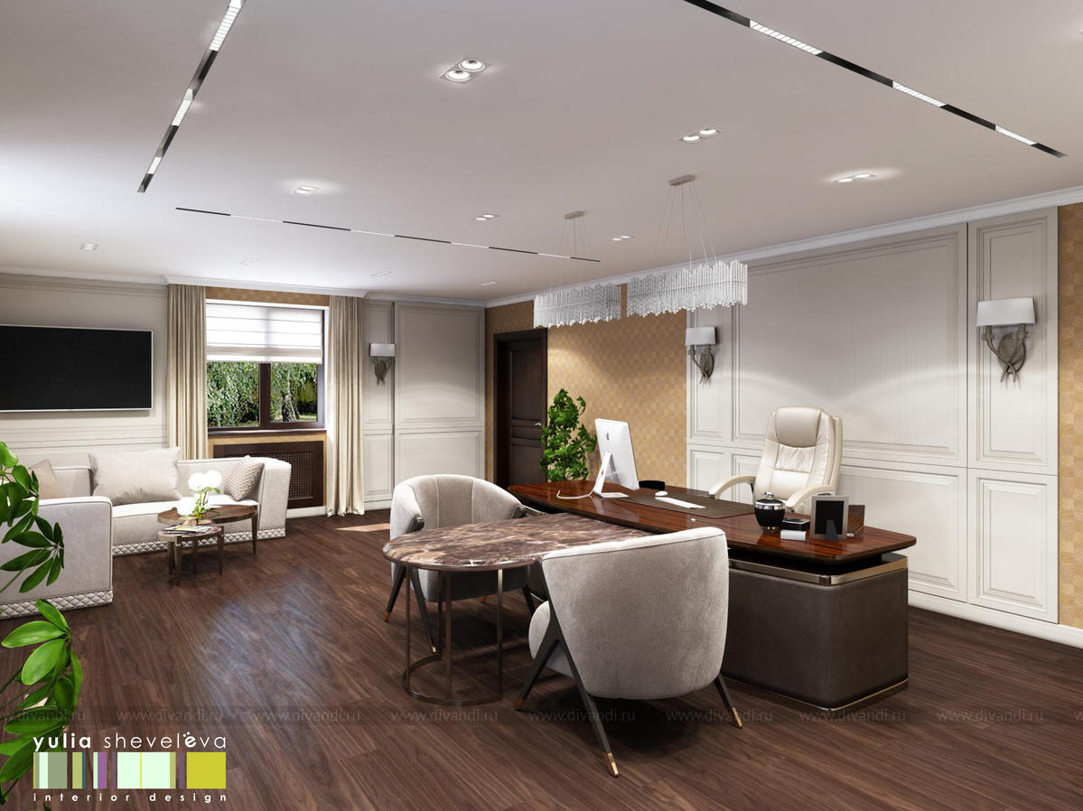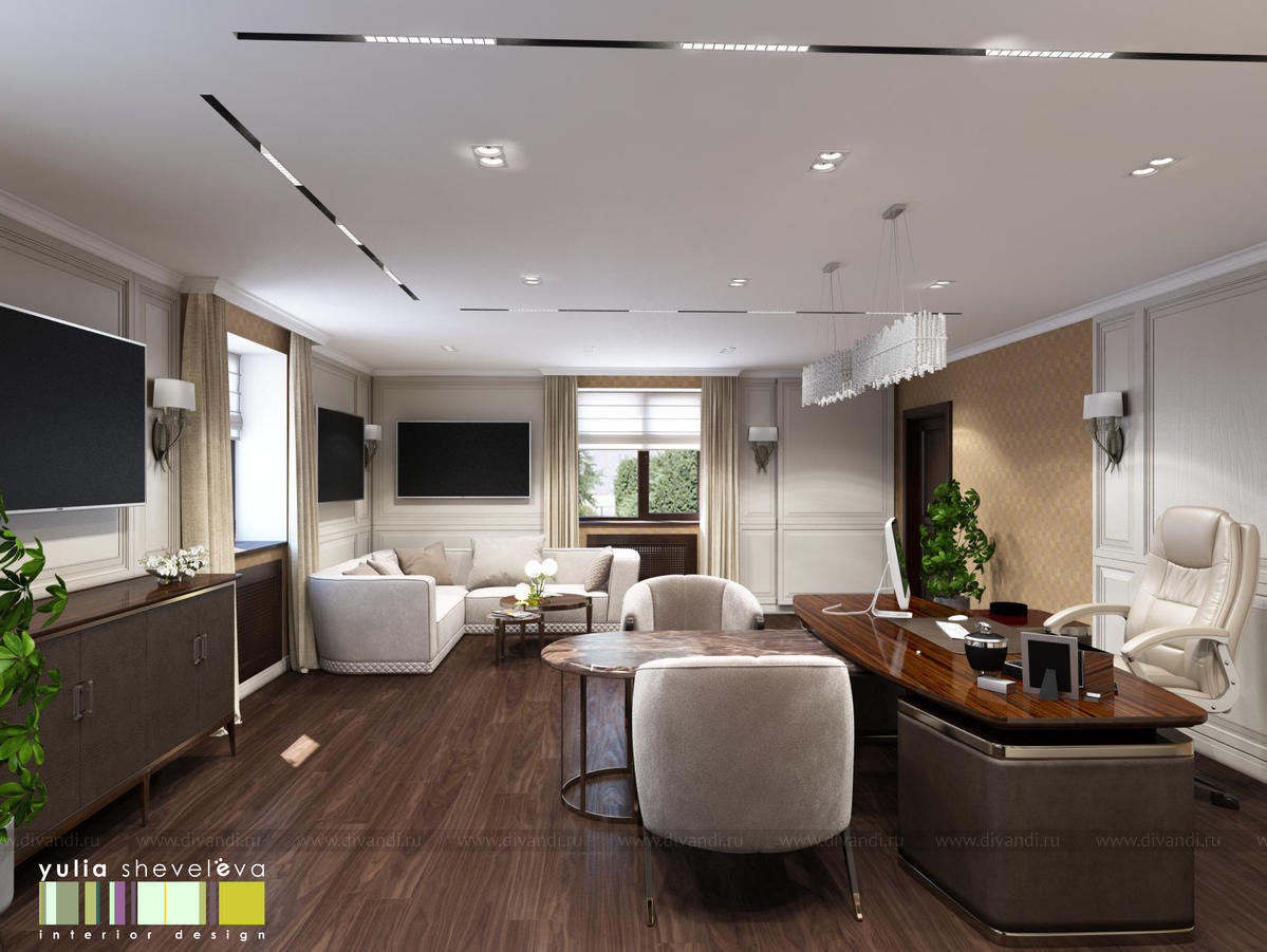 Задача стояла спроектировать респектабельный, но в тоже время уютный интерьер для руководителя предприятия. Предпочтение было отдано спокойной цветовой палитре, дорогим и тактильно-приятным материалам, известным мебельным брендам. Словом, интерьер должен не только радовать хозяина, но оставлять под большим впечатлением каждого посетителя, ведь кто знает, какой крупный договор или сделку способствует совершить новая обстановка.