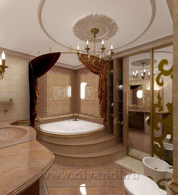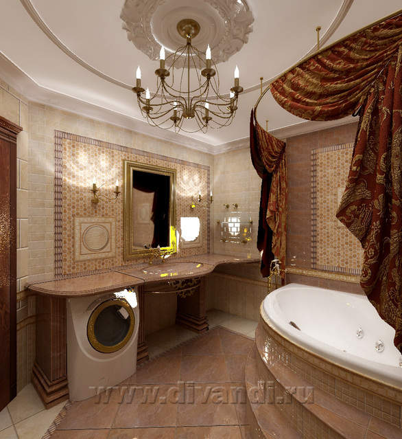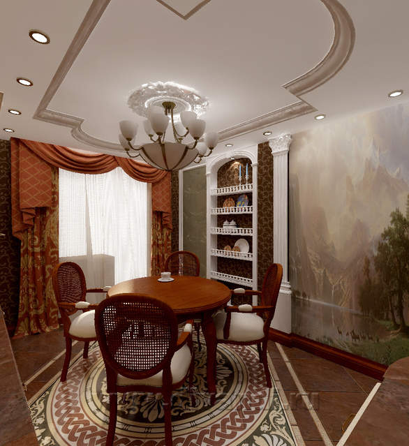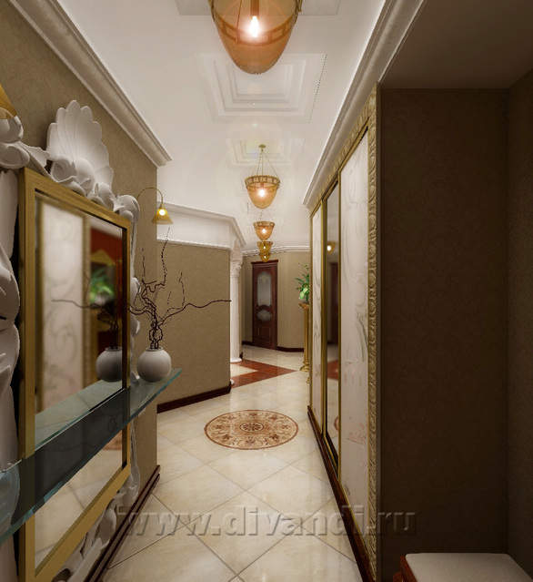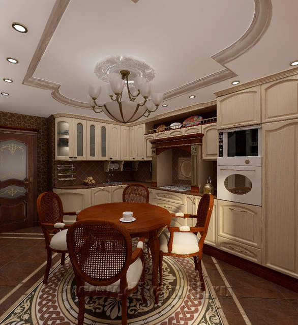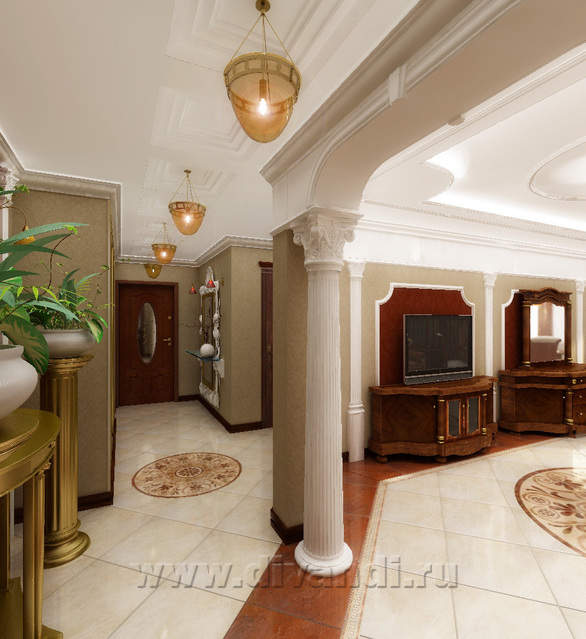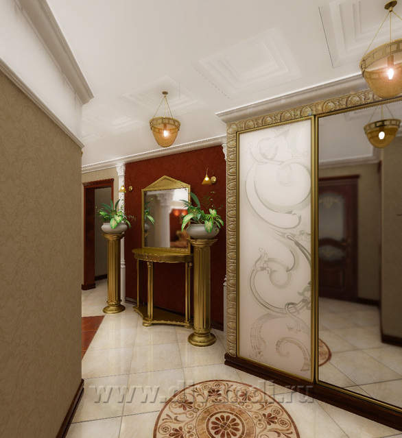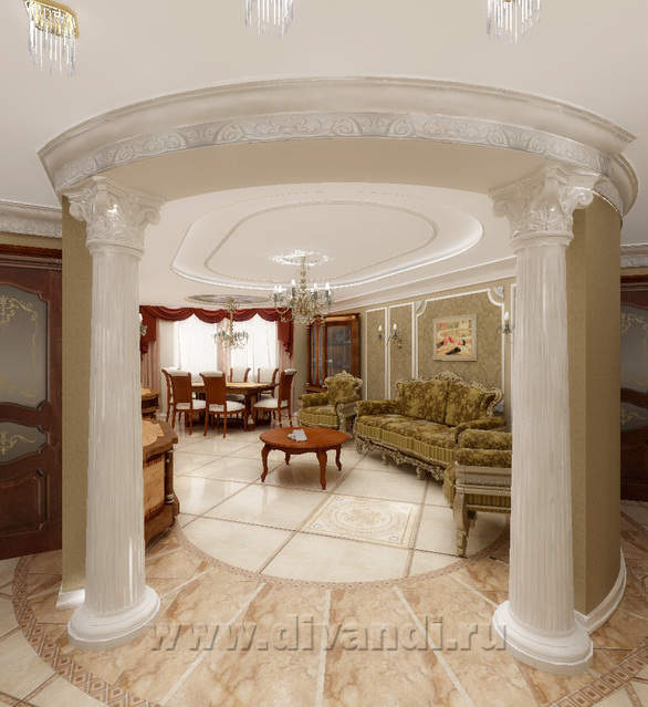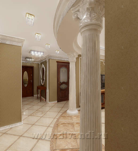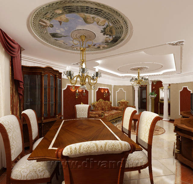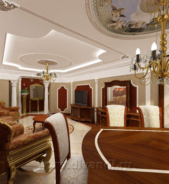 Заказчику ,респектабельному мужчине с большой семьей, очень хотелось роскошный интерьер с дорогими и надежными материалами,массивной мебелью и элементами борокко. Поэтому в интерьере применена лепнина, тканевые обои, фрески и расписные потолки.Полы-керамогранит из серии "Ониск" с резными розанами. Многочисленные подсветки и роскошная мебель создают уют и комфорт.