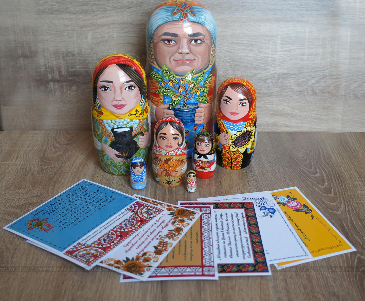 Роспись подарочных матрёшек (лица по фото). Кроме памятного семейного смысла, матрёшки расскажут об основных направлениях русской росписи. Каждая фигура выполнена в своём стиле: Урало-сибирская, Северодвинская, Хохлома, Мезенская, Жостовская, Гжель и городецкая. Фигурки снабжены фетровыми донышками и поясняющими открытками