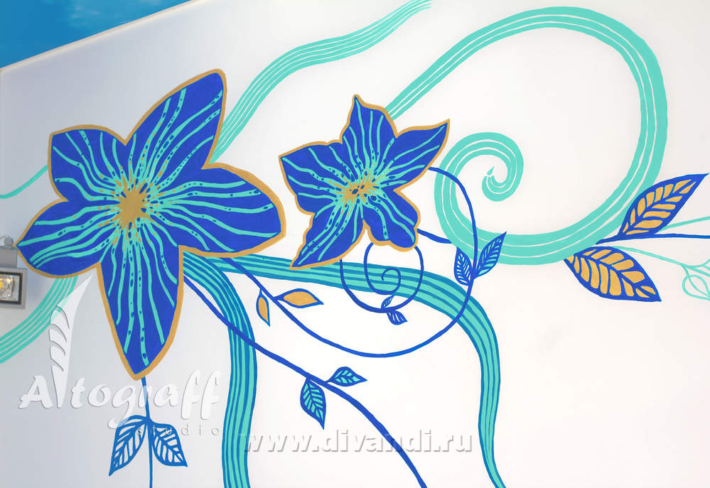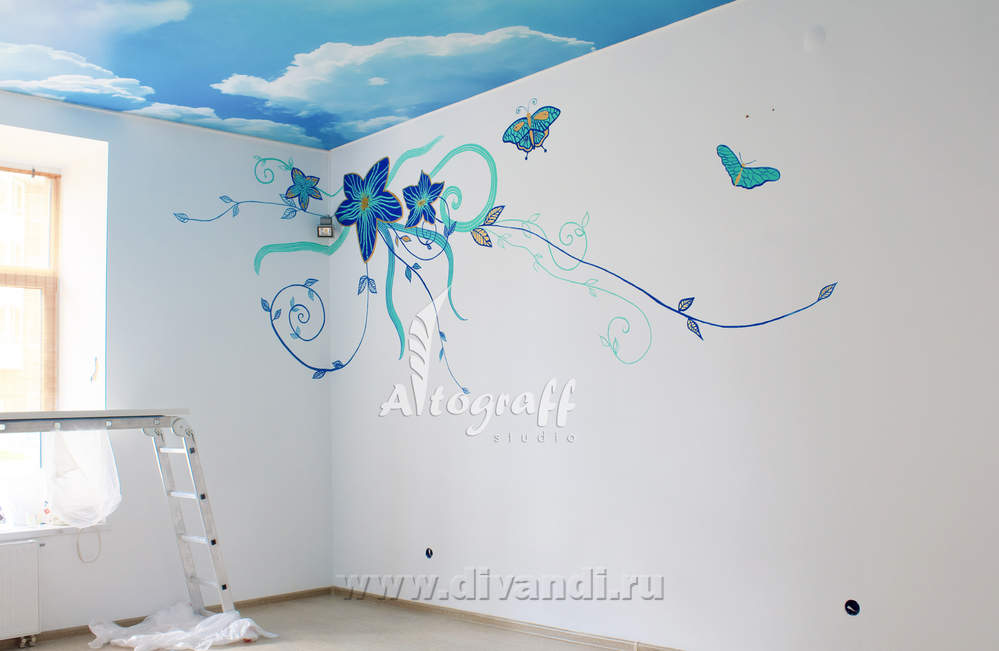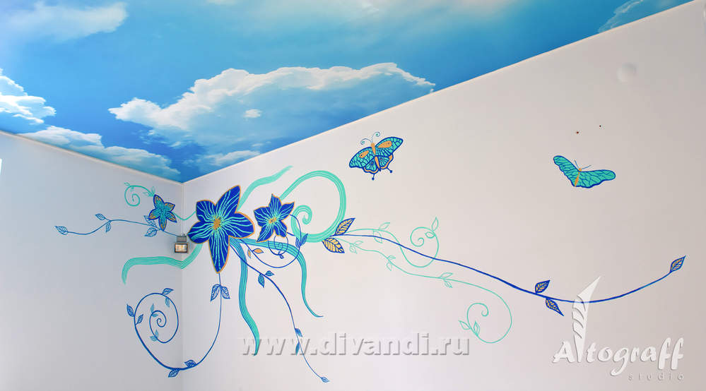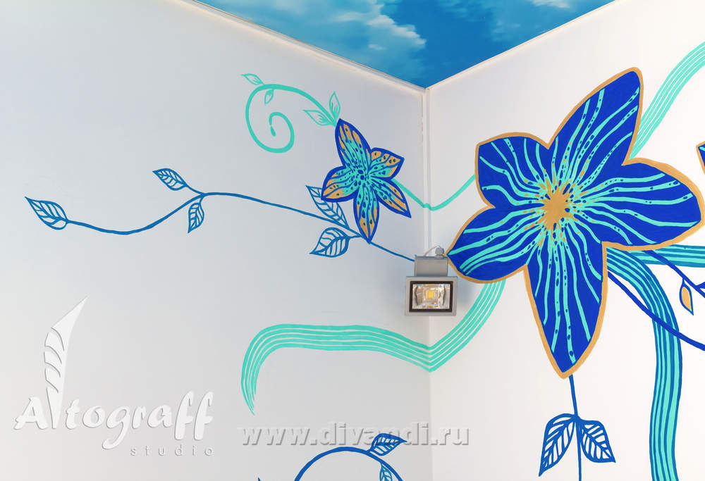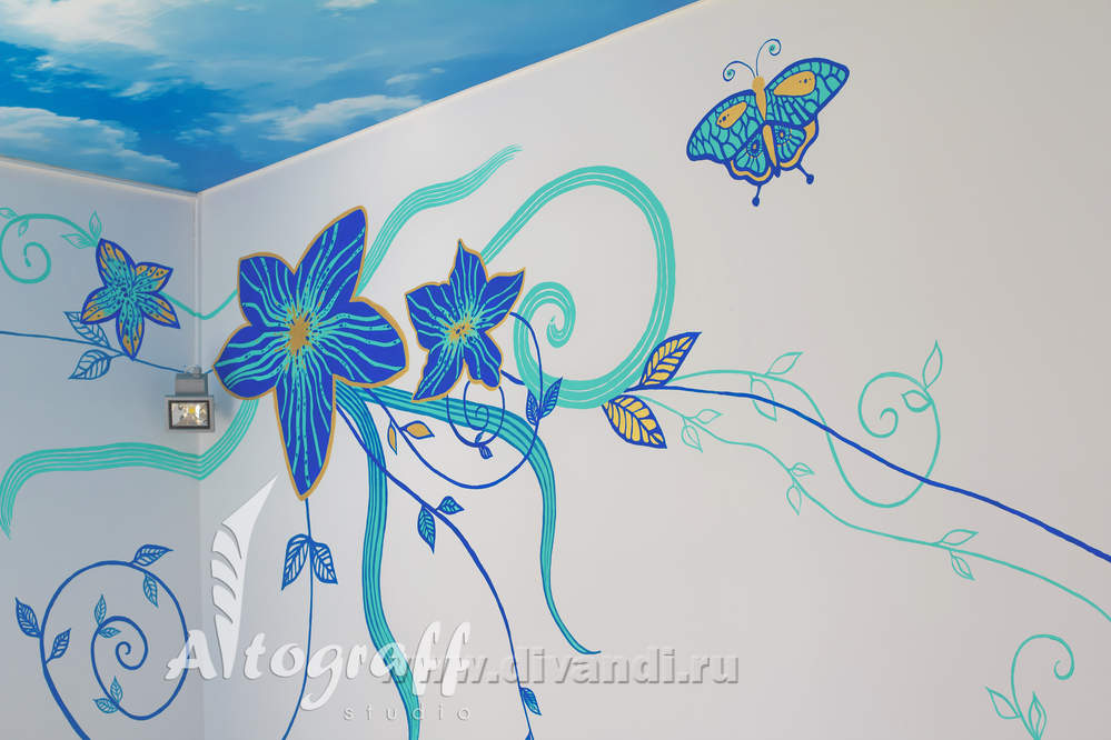 Роспись создавалась по нашему эскизу, заказчица просила "оживить" зал в центре развития для женщин, привнести элемент творчества и женственности. Колорит росписи подбирался к уже существующему натяжному потолку с рисунком неба. В холодные оттенки добавлено немного золота.