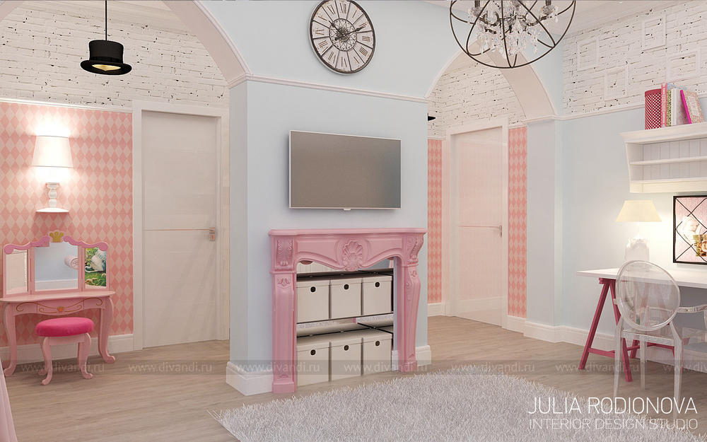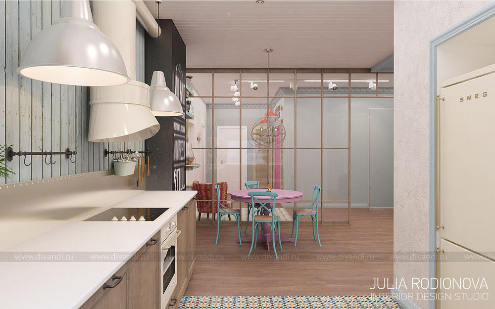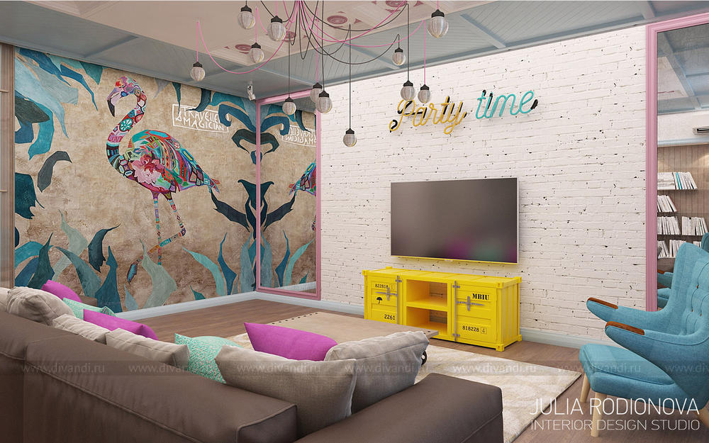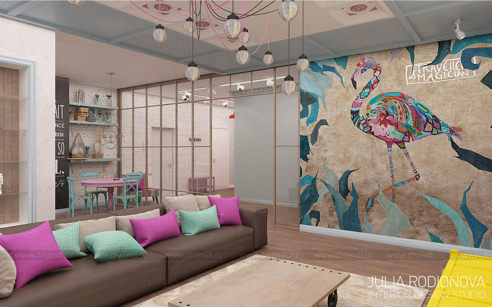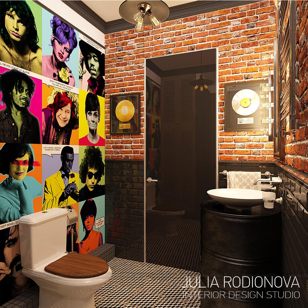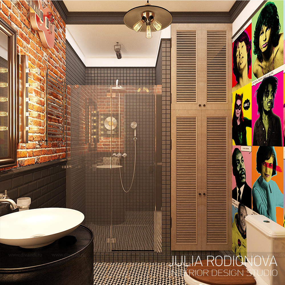Пентхаус в винтажном стиле в Екатеринбурге. С яркими, креативными заказчиками я работаю не в первый раз - на этот раз они попросили оформить городскую квартиру. В качестве перепланировки я предложила визуально объединить зону гостиной, прихожей и кухни, разграничив их лишь легкой стеклянной перегородкой, что позволило создать огромное, светлое, по настоящему лофт-пространство. Акцентом в гостиной стало яркое панно от итальянской фирмы Wall&Deco. Гостевой санузел выполнен в "музыкальном" духе: стену украшает панно с портретами культовых личностей эпохи 70х, в качестве тумбы для раковины предложена обыкновенная бочка, а стену украшает настоящая гитара. При создании дизайна этого санузла меня вдохновлял музей группы Битлз в Ливерпуле. Спальня хозяев более уютная и камерная: теплый бежевый оттенок стен обволакивает и успокаивает после рабочего дня. Одна из стен декорирована стилизованной картой мира: на ней хозяева смогут отмечать уголки земного шара где они путешествовали, и где еще только предстоит побывать. Темой путешествий также навеяны орнаменты, выполненные по периметру стен. Украшением спальни является туалетный столик, сделанный из подстолья швейной машинки Зингер. Детская для девочки почти 5 лет придумана мною с легкой ноткой сказки "Алиса в стране чудес", которую так любит маленькая принцесса. Нестандартная форма комнаты не даст ребенку заскучать, ведь в ней найдется множество уголков для любимых занятий: за центральной колонной скрывается балетный станок и шведская стенка, а стилизованные проемы легко становятся сценой.