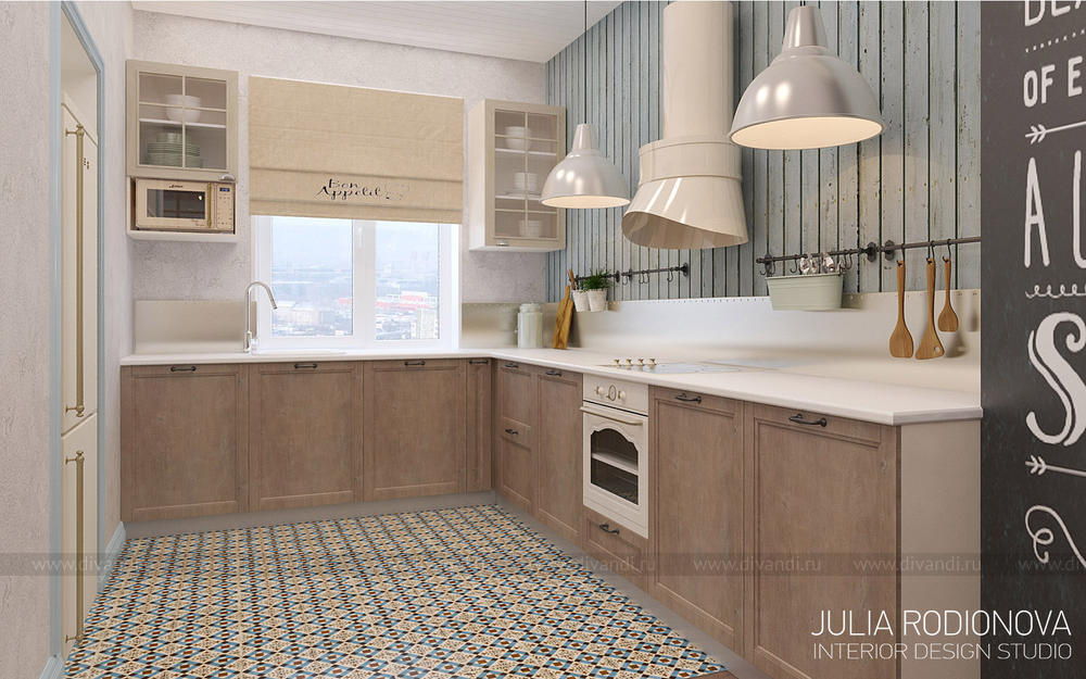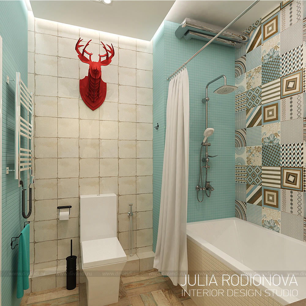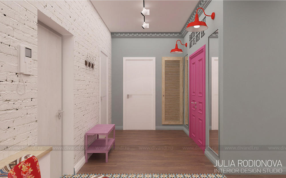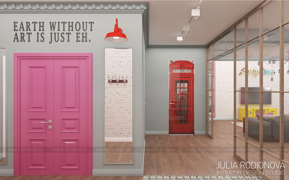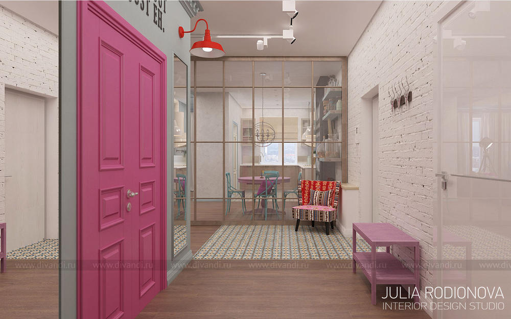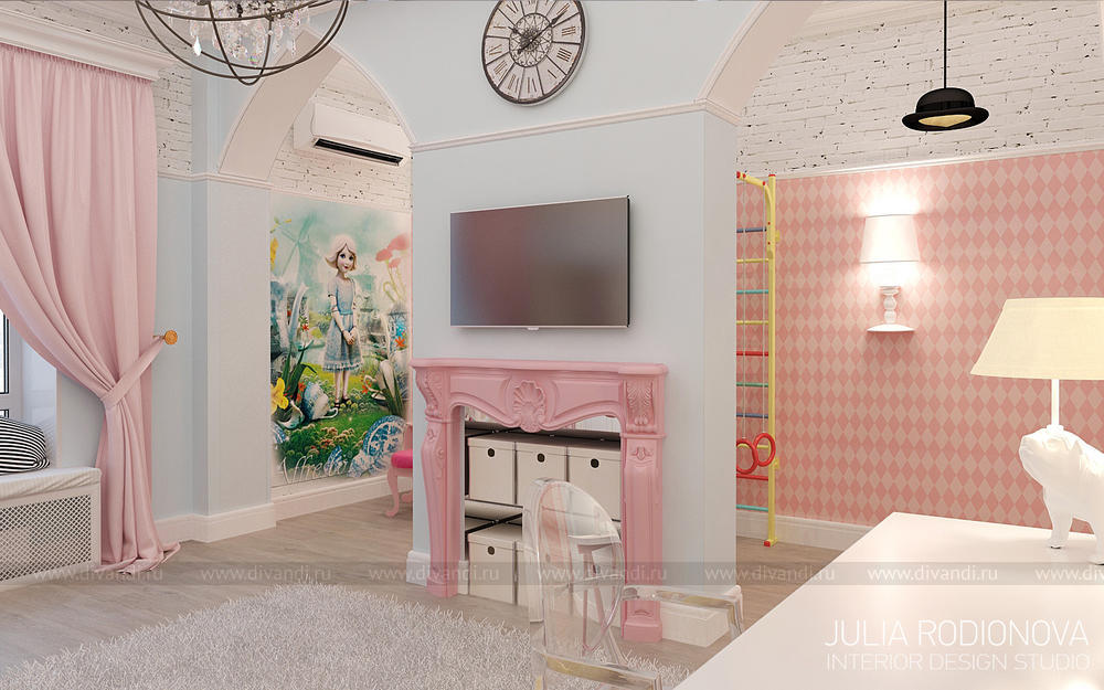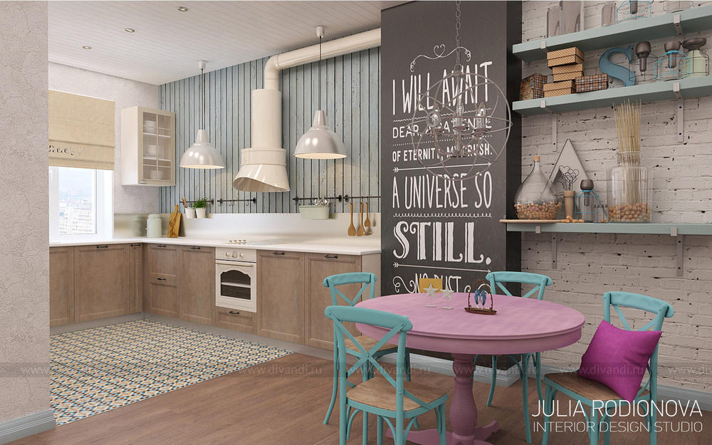 Пентхаус в винтажном стиле в Екатеринбурге. С яркими, креативными заказчиками я работаю не в первый раз - на этот раз они попросили оформить городскую квартиру. В качестве перепланировки я предложила визуально объединить зону гостиной, прихожей и кухни, разграничив их лишь легкой стеклянной перегородкой, что позволило создать огромное, светлое, по настоящему лофт-пространство. Акцентом в гостиной стало яркое панно от итальянской фирмы Wall&Deco. Гостевой санузел выполнен в "музыкальном" духе: стену украшает панно с портретами культовых личностей эпохи 70х, в качестве тумбы для раковины предложена обыкновенная бочка, а стену украшает настоящая гитара. При создании дизайна этого санузла меня вдохновлял музей группы Битлз в Ливерпуле. Спальня хозяев более уютная и камерная: теплый бежевый оттенок стен обволакивает и успокаивает после рабочего дня. Одна из стен декорирована стилизованной картой мира: на ней хозяева смогут отмечать уголки земного шара где они путешествовали, и где еще только предстоит побывать. Темой путешествий также навеяны орнаменты, выполненные по периметру стен. Украшением спальни является туалетный столик, сделанный из подстолья швейной машинки Зингер. Детская для девочки почти 5 лет придумана мною с легкой ноткой сказки "Алиса в стране чудес", которую так любит маленькая принцесса. Нестандартная форма комнаты не даст ребенку заскучать, ведь в ней найдется множество уголков для любимых занятий: за центральной колонной скрывается балетный станок и шведская стенка, а стилизованные проемы легко становятся сценой.