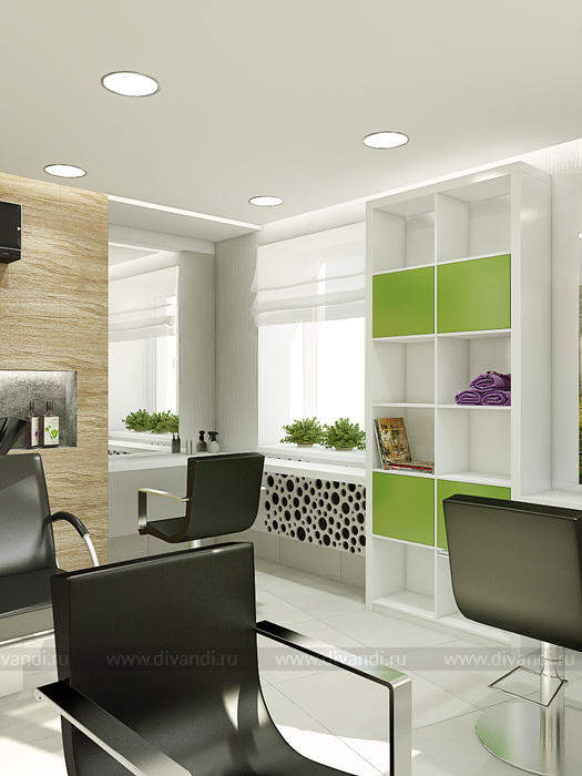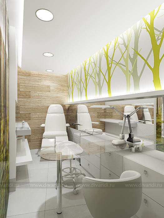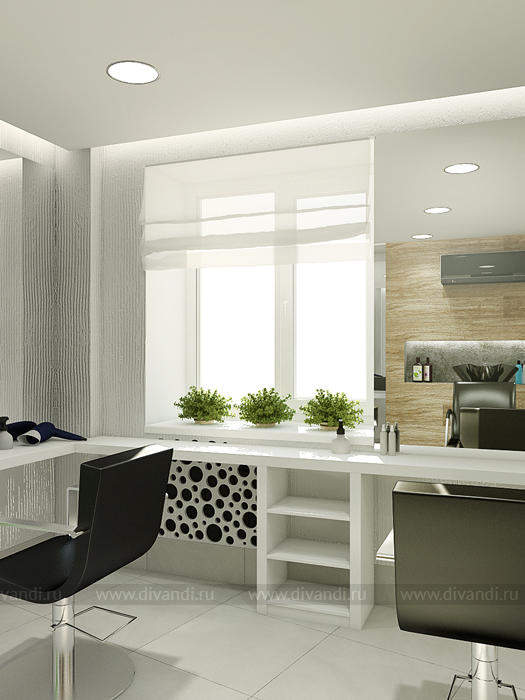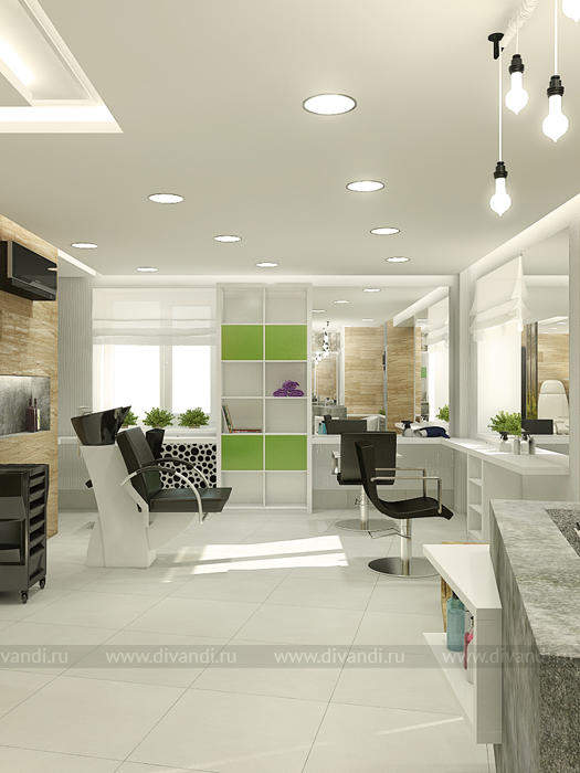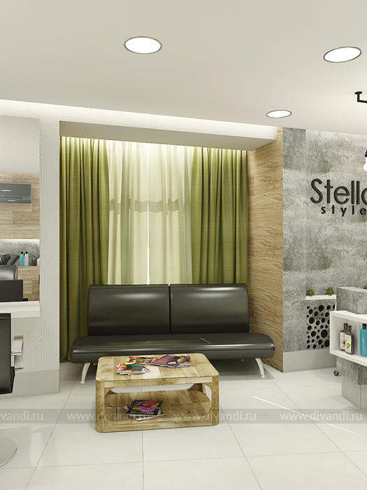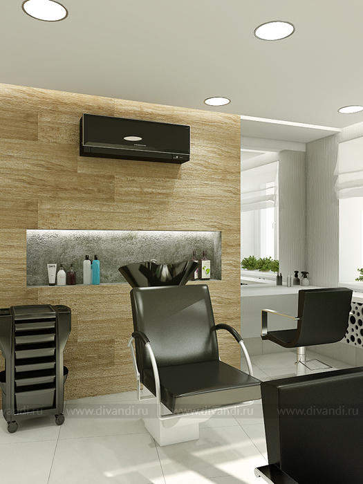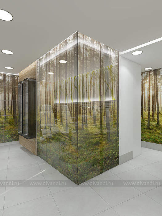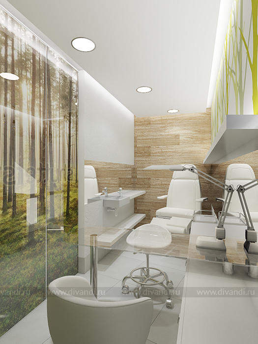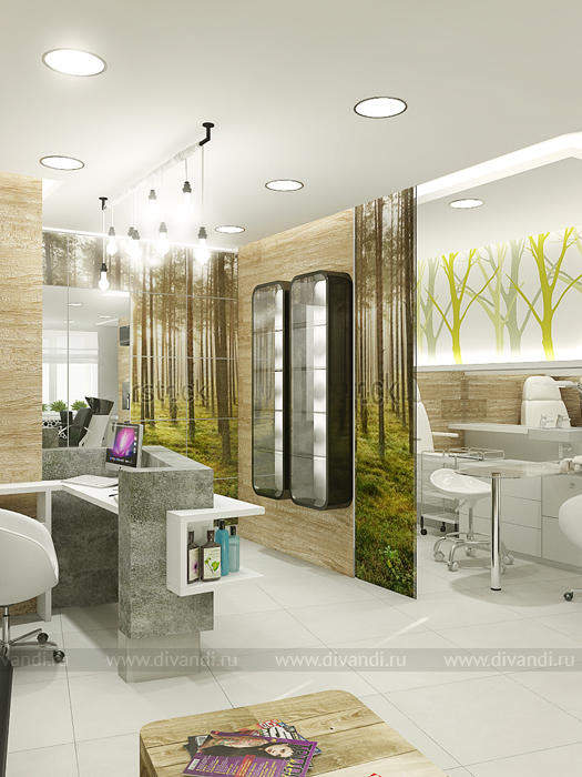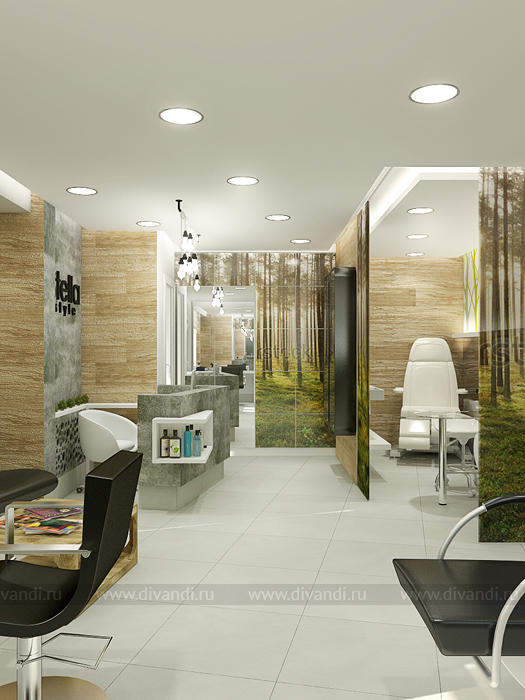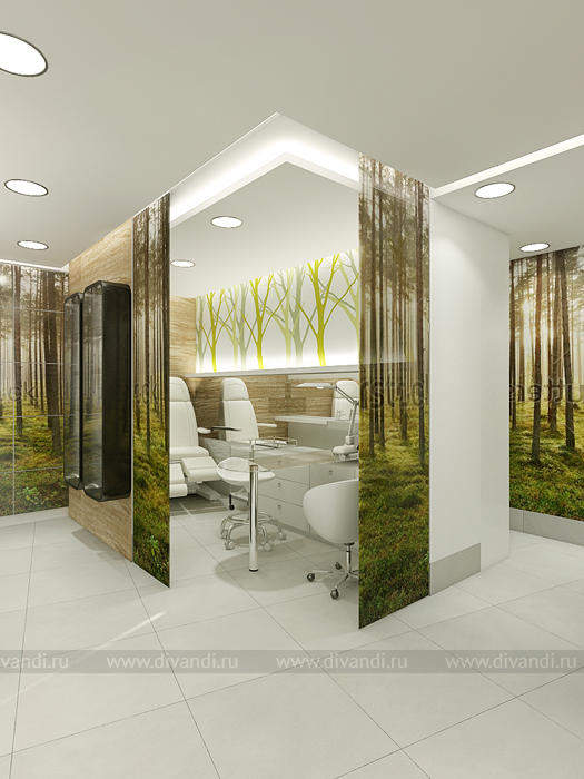 Идей дизайна этого салона красоты была отражение эко стиля в интерьере. Так как салон находиться у вокзала, там постоянное движение машин, пыль шум и грязь. Нахватает спокойствия и уединения чтобы расслабиться! Вот мы и решили сделать такой уголок природы и спокойствия в салоне красоты. Так как места не так было много, основная задача стояла разместить удобно рабочие места и подходы к ним, особенно к мойке, выделить в отдельную зону маникюрный кабинет. Но так же не потерять в местах для хранения! Все материалы и цвета взяты из леса, это дерево, кара дерева, активно мы вносим принты с изображением леса! За счет этого мы делаем иллюзию пространства, вносим воздух в интерьер! Кабинет маникюра трансформируемый, когда надо мы закрываемся, когда нет можно раздвинуть панели перегородки и это уже единое пространство зала.