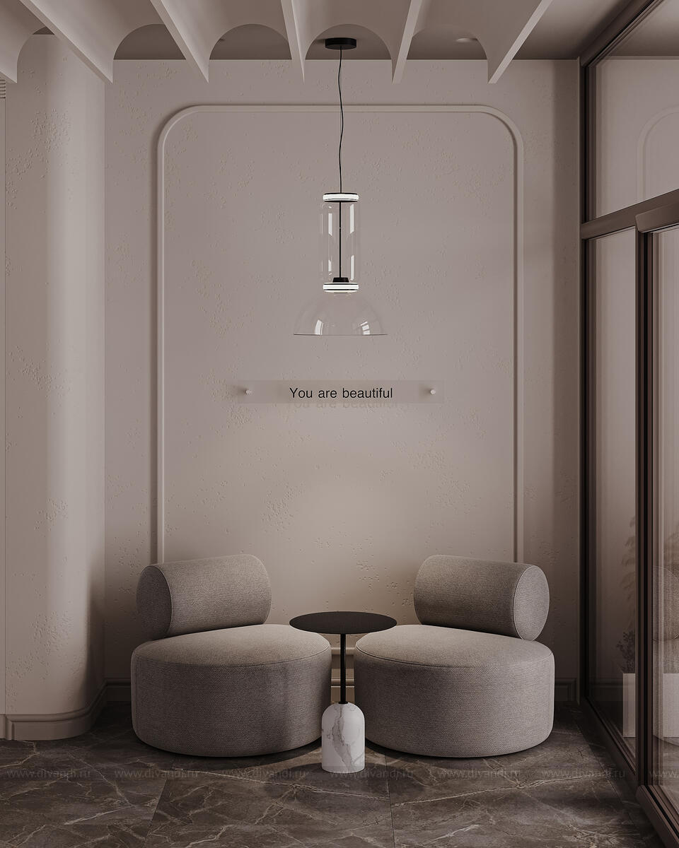 Проект выполнен в стиле минимализм с добавлением акцентного вишневого оттенка. Общий зал в себя включает: зону ожидания с вместительным шкафом, стойку администратора, два парикмахерских кресла с мойкой у окна и рабочее место бровиста. Так же в помещении оборудован санузел для посетителей и техническое помещение для сотрудников.