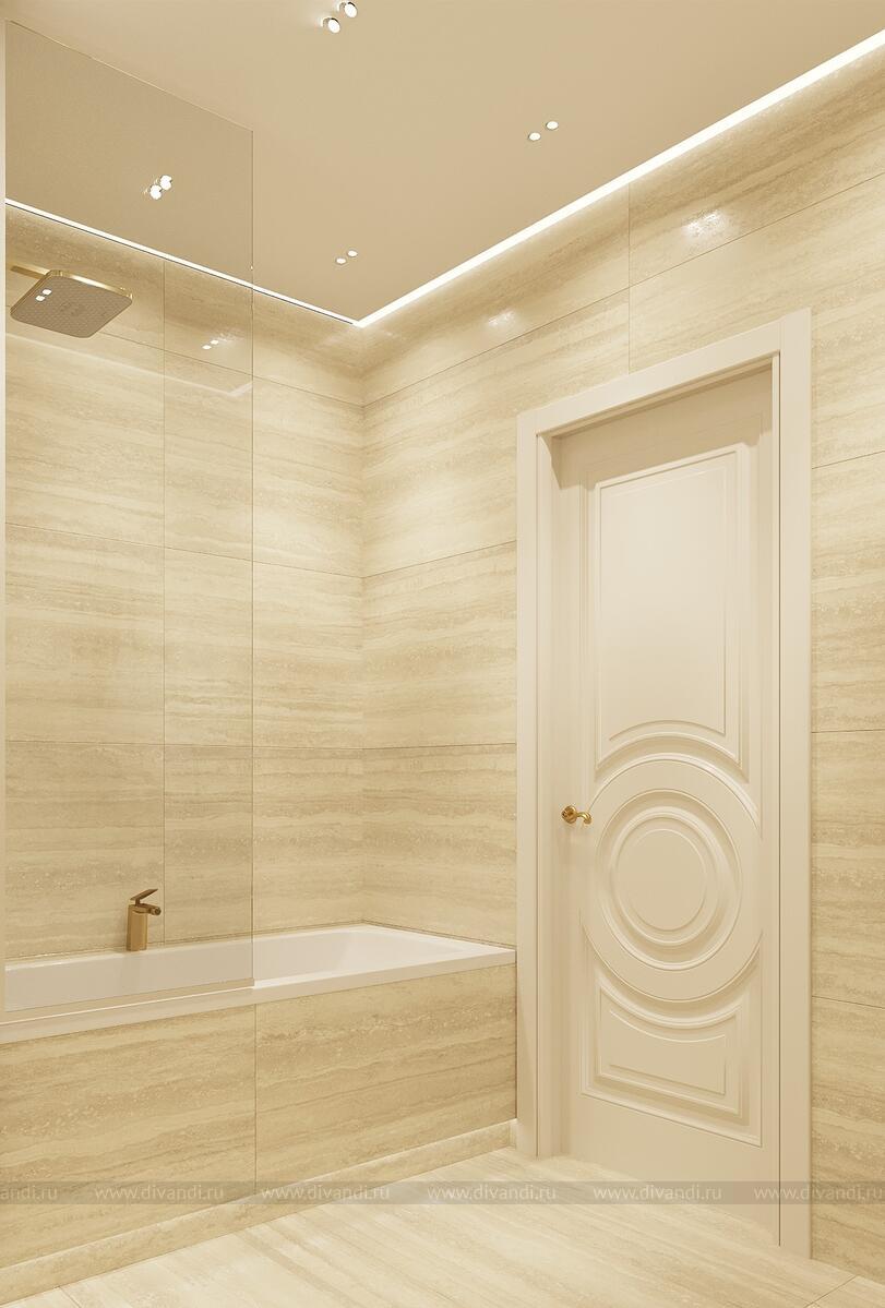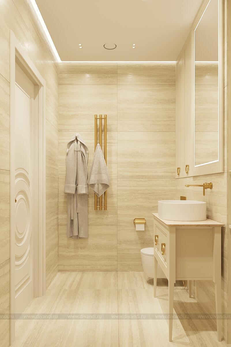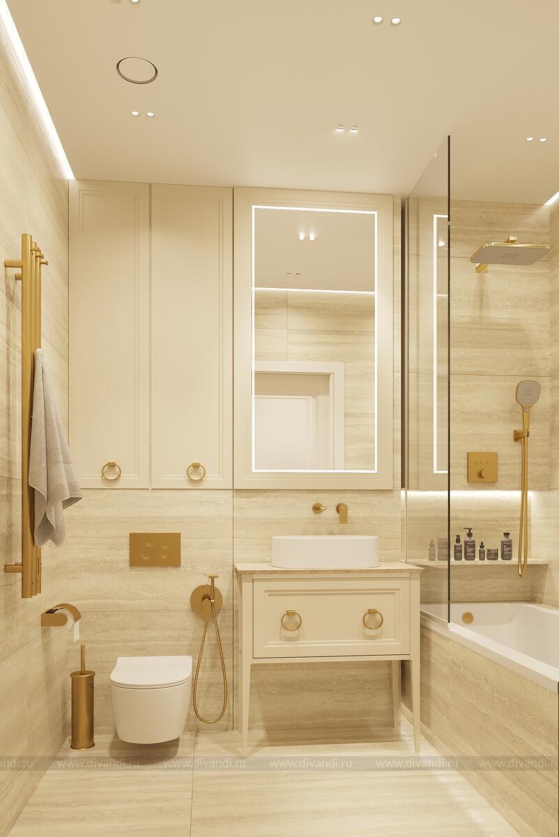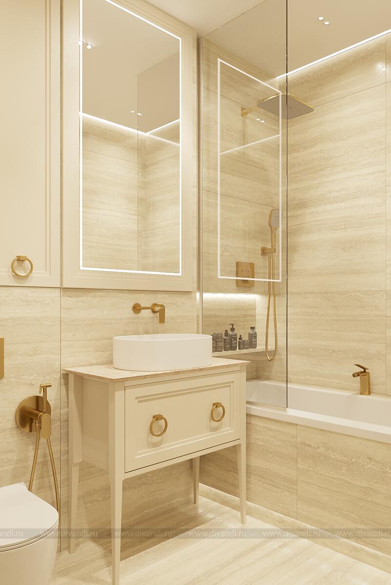 Ванная комната в современном стиле с элементами классики, выполненная в светлых бежевых тонах с золотыми акцентами.