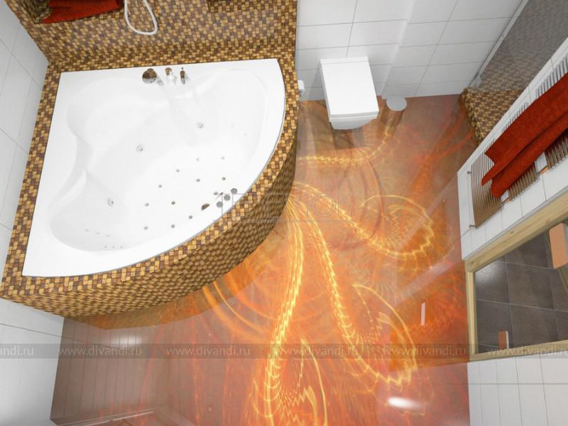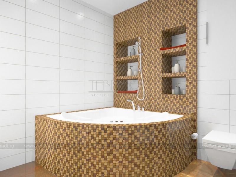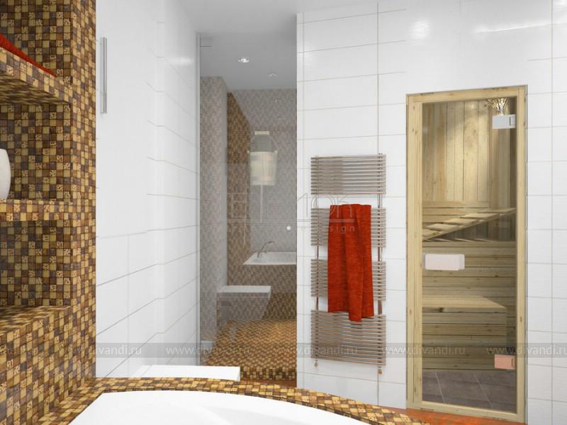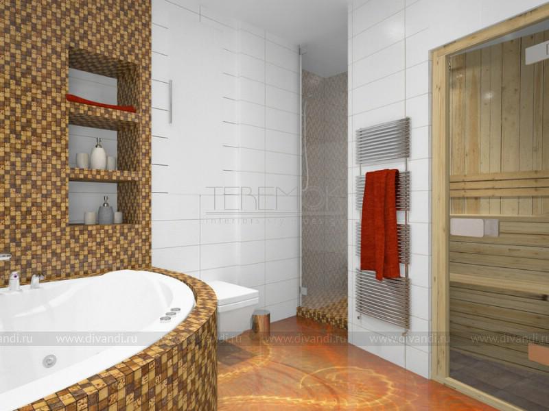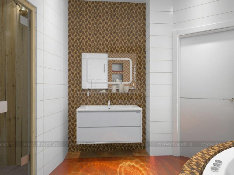 При перепланировки квартиры в ЖК "Александровский" были учтены пожелания заказчика, таким образом, образовался большой санузел, включающий в себя и зону сауны. При отделки большое джакузи и его зону выделили фактурной, золотистой мозаикой, фоном послужила вытянутая современная плитка. Напольное покрытие мы предложили в виде наливного полола с рисунком, оно более практичное для оформления санузлов, так не имеет расшивки, присущей кафелю, к тому же выглядит гораздо эстетичней других применяемых материалов.