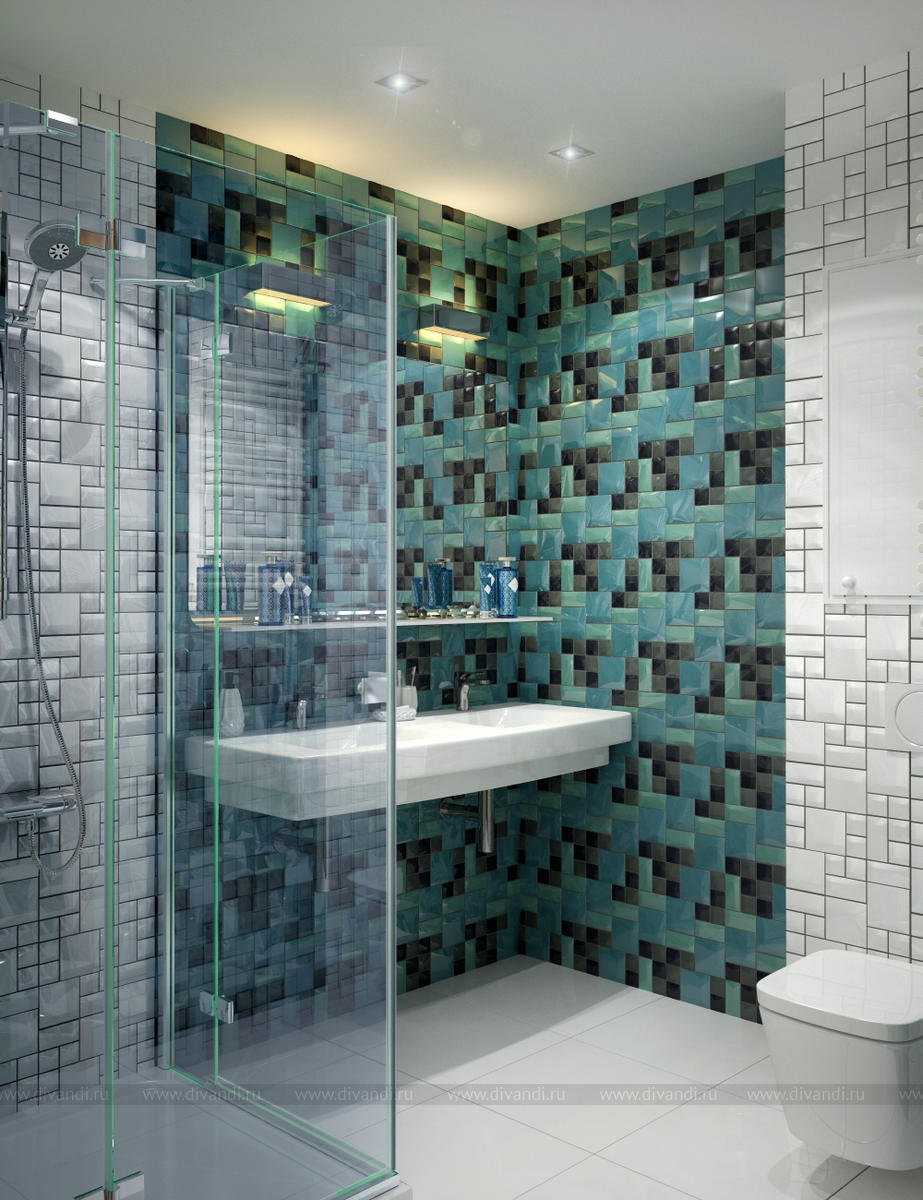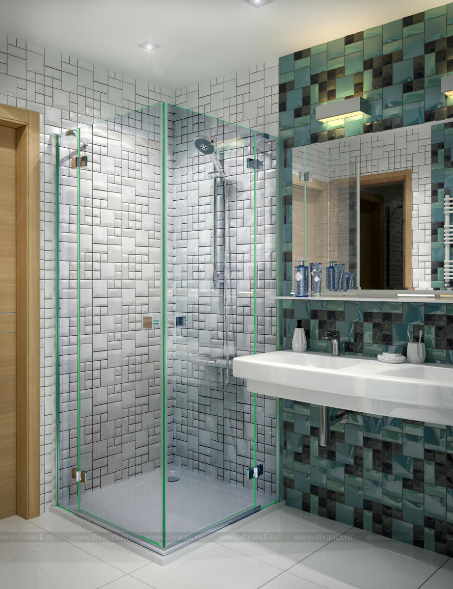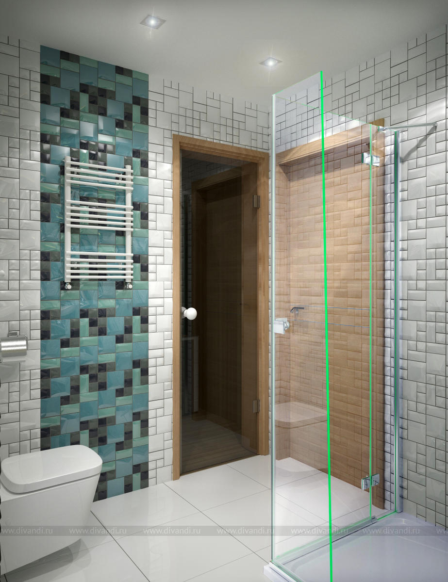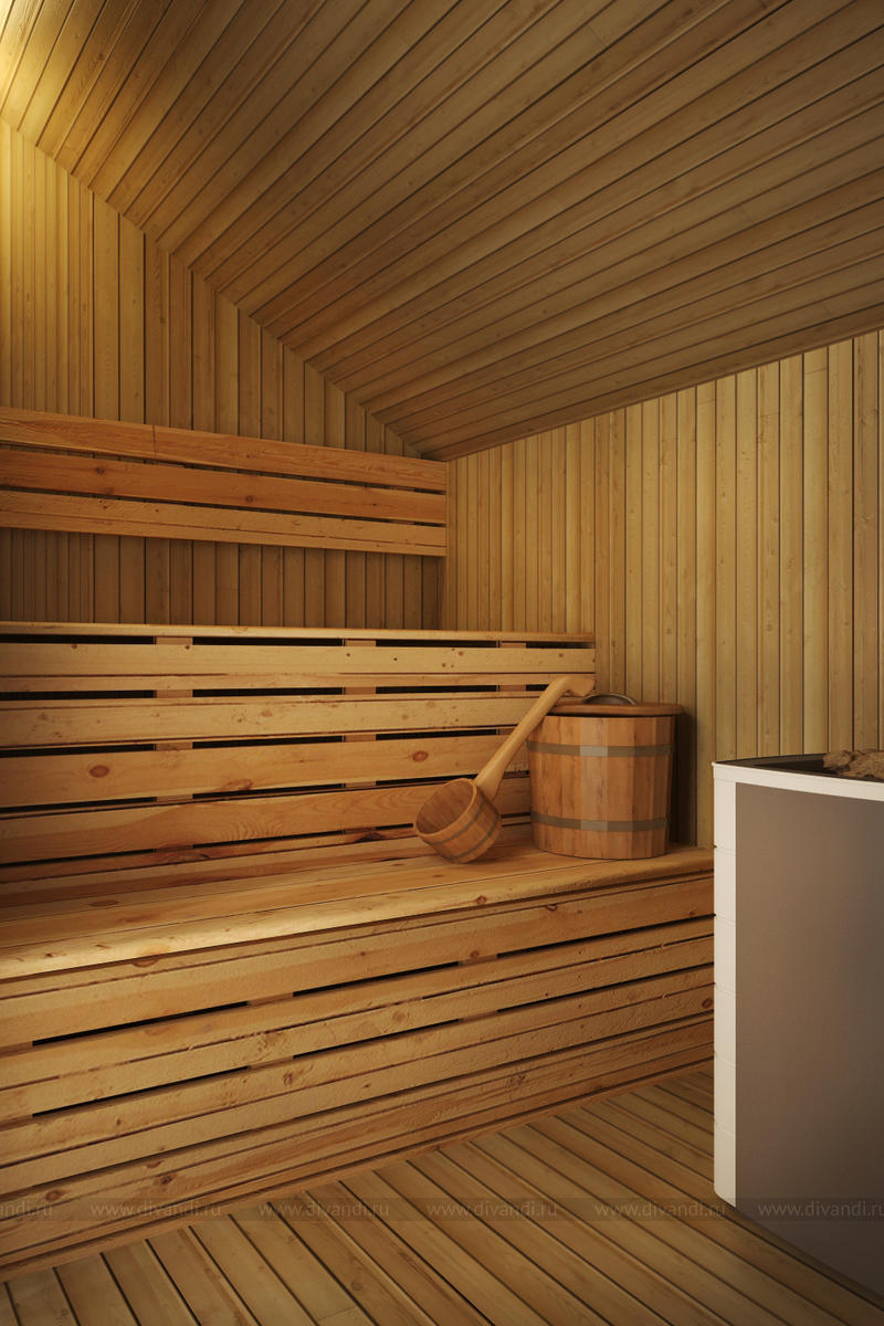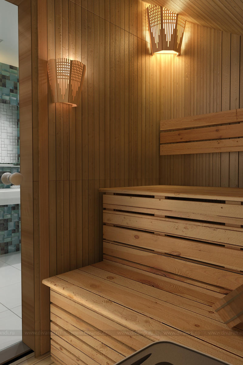 Это санузел из проекта таунхауса. Иногда в городских квартирах также есть возможность обустроить небольшую сауну.