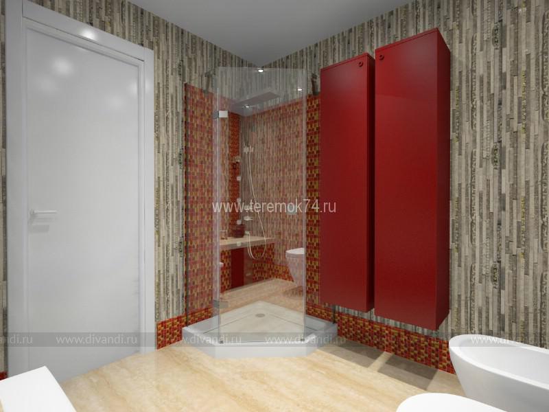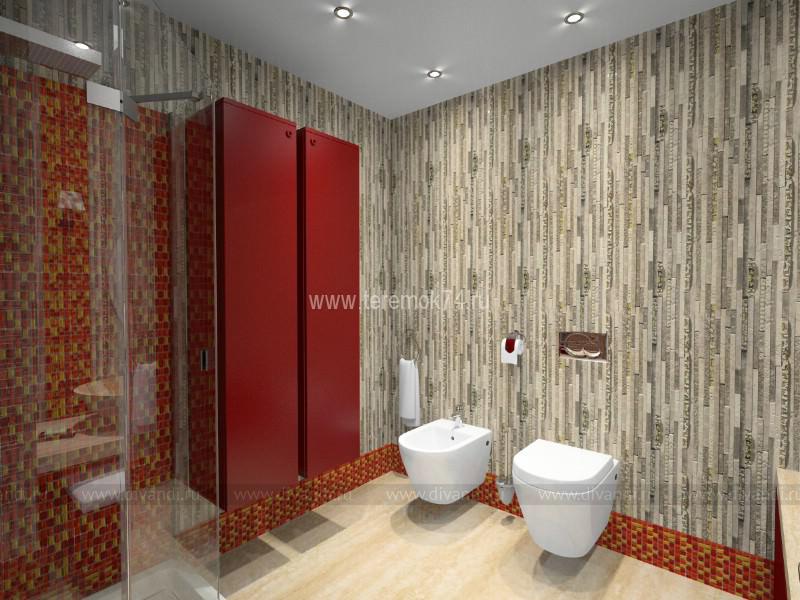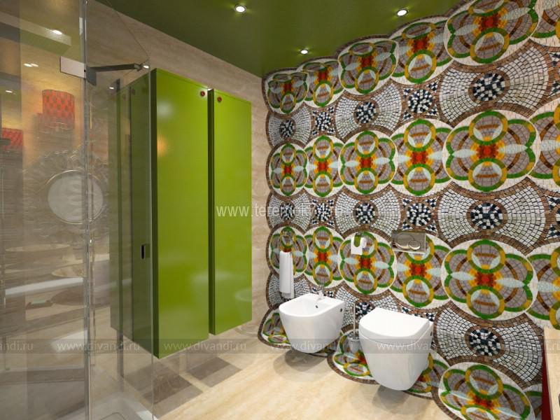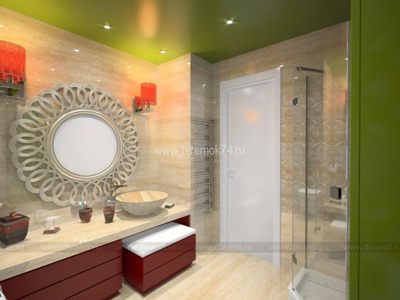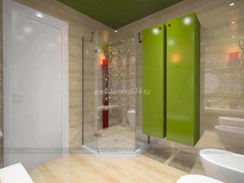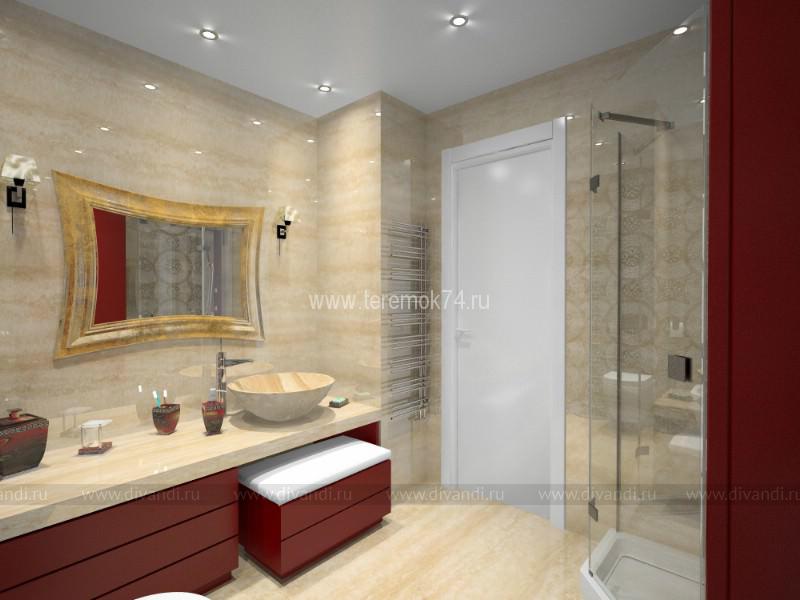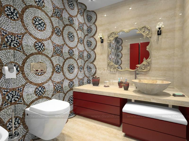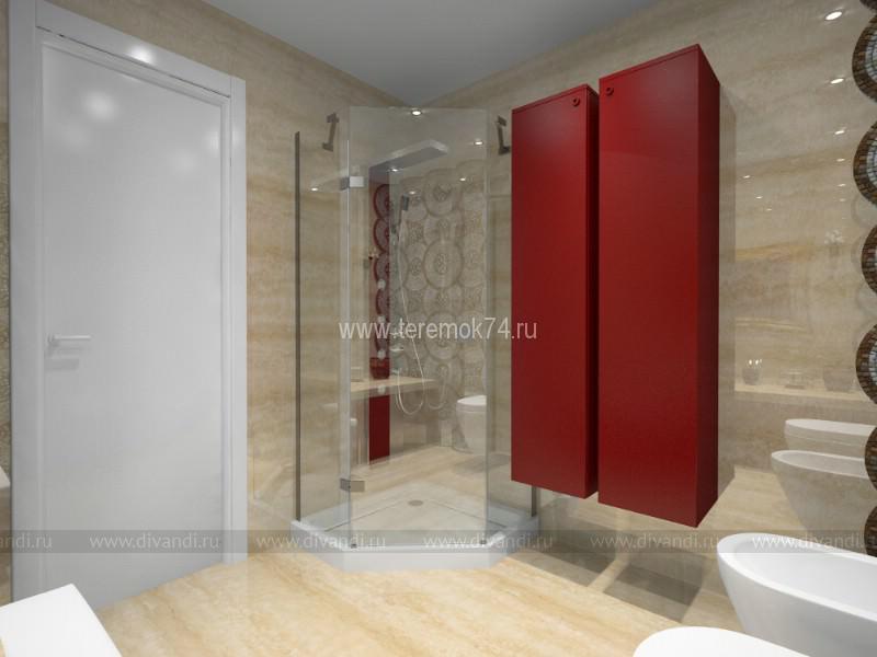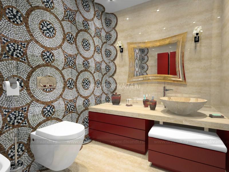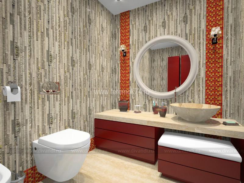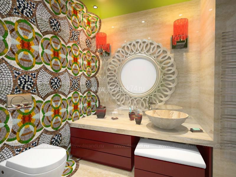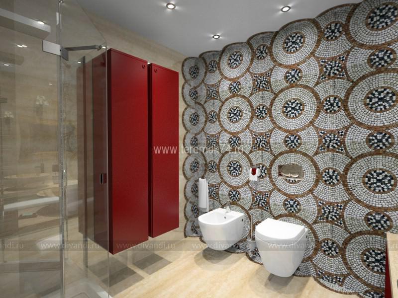В небольшом, по площади, санузле разместили: зону с раковиной и большой столешницей под парфюмерию, душевую кабину, зону хранения, и унитаз с биде. На фоне теплой и мягкой текстуры камня травертин. Центральное место занимает большое мозаичное панно, с коричневыми кругами плавно переходящее на потолок, стены и пол последние имеют глянцевую текстуру. Напольное покрытие из полимерного наливного пола, что является практичным вариантом для санузла, так как не имеет швов как кафель.