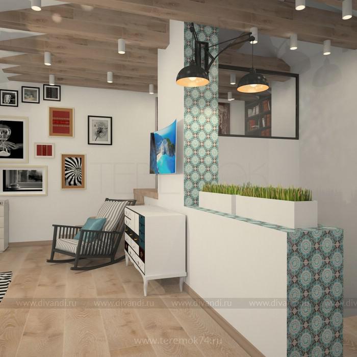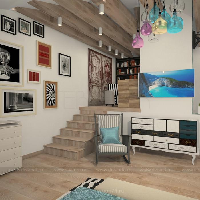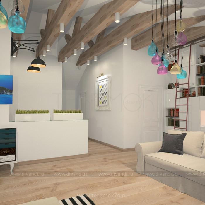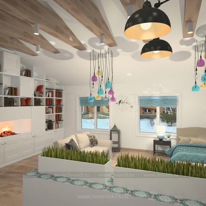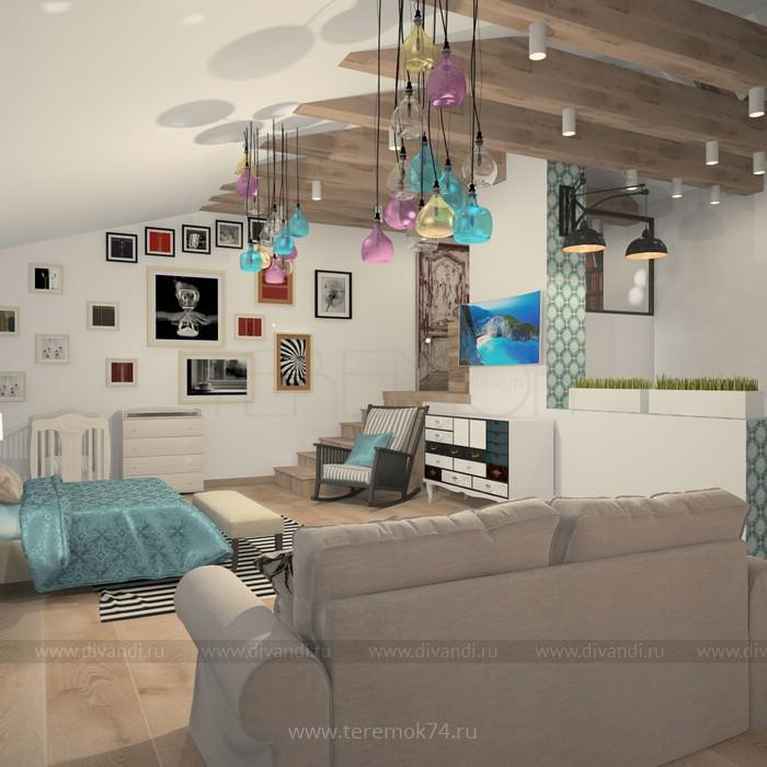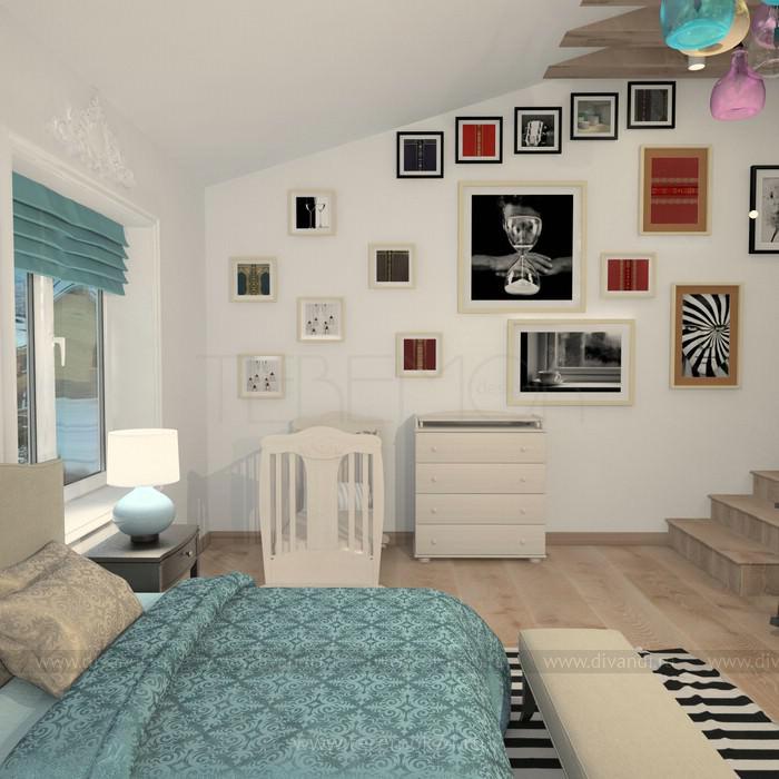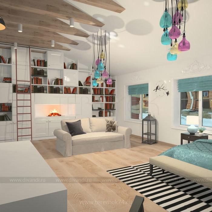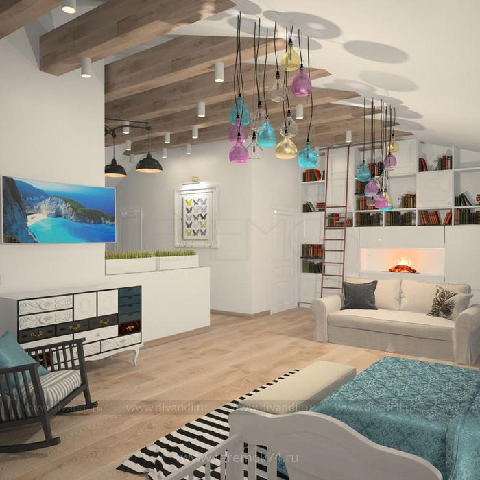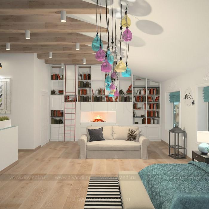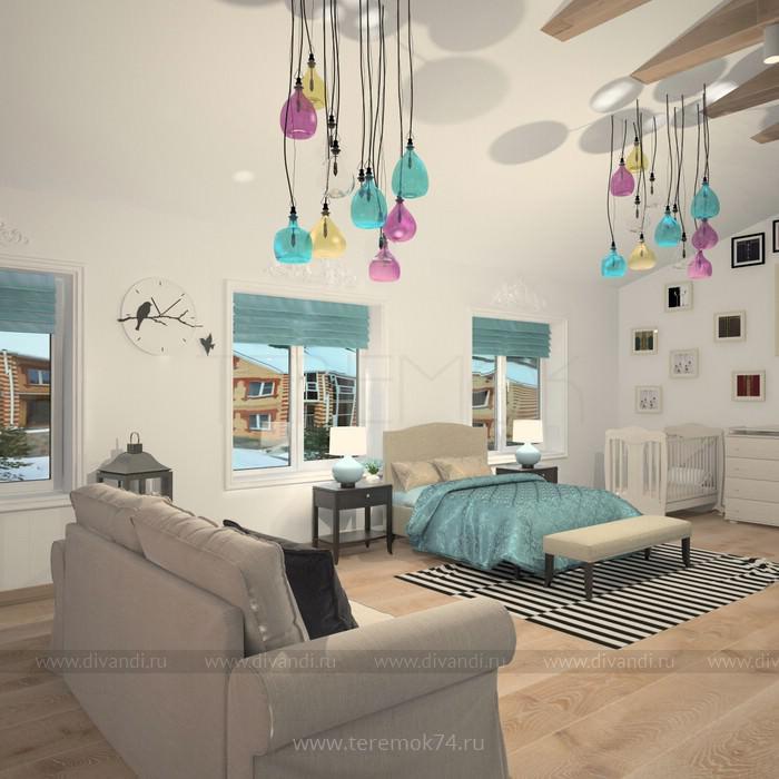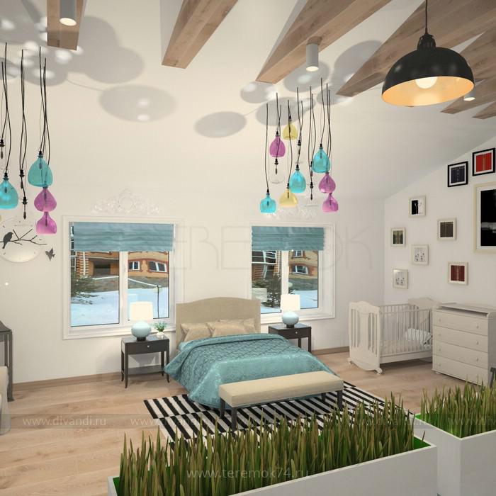 Мансардный этаж дома заняла большая спальня, которая была выполнена в скандинавском стиле. Для него характерные светлые пастельные цвета, натуральные материалы, множество окон, для того чтобы пространство максимально наполнялось естественным светом.