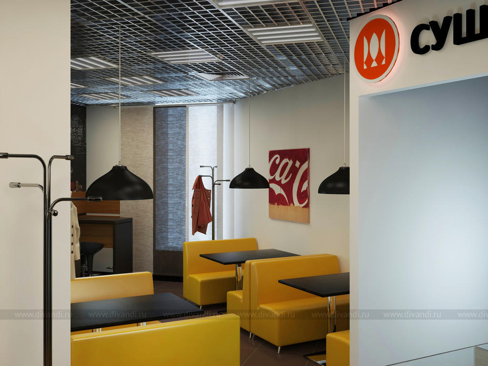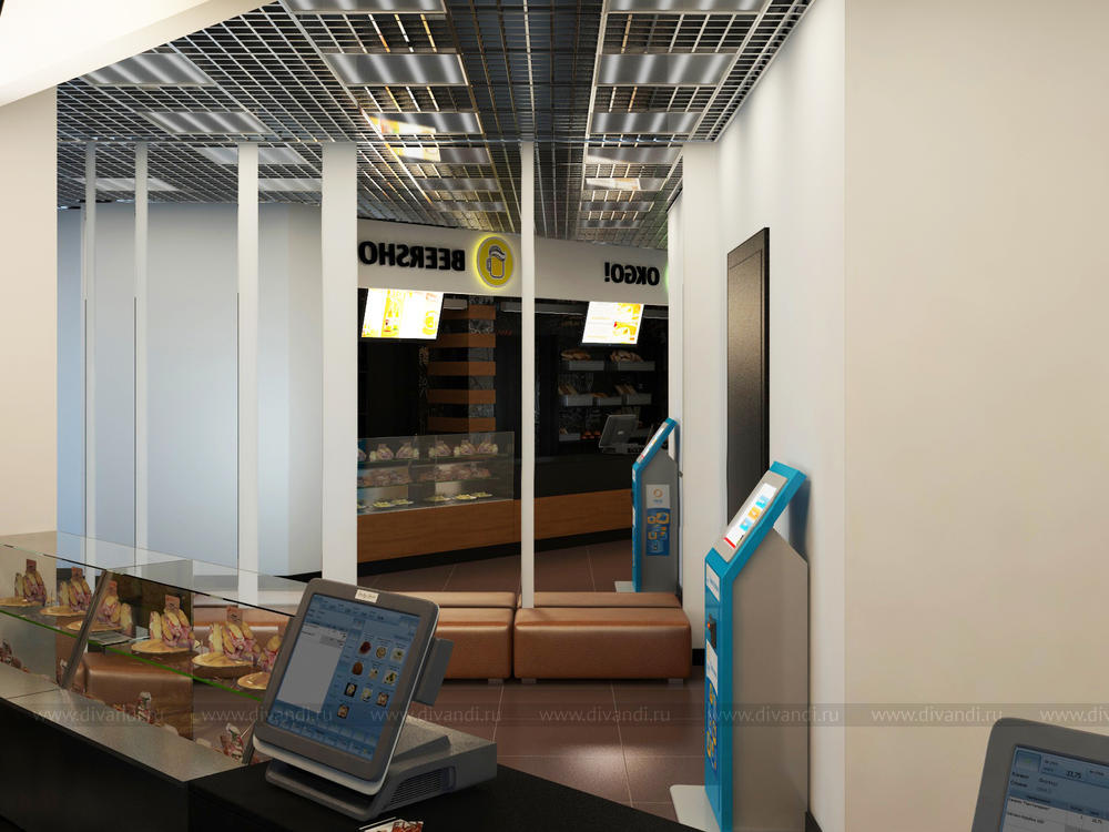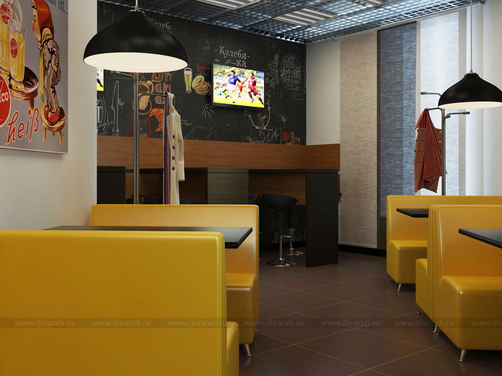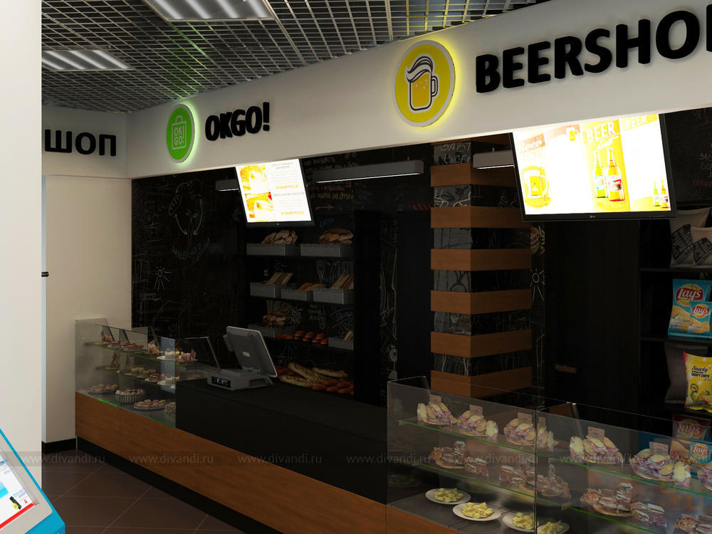 Кафе на вынос в микрорайоне Краснолесье, в котором расположено 3 кафе- пекарня, пивная и суши. Выполнена в современной тематике с модными стенами, покрашенными грифельной краской.