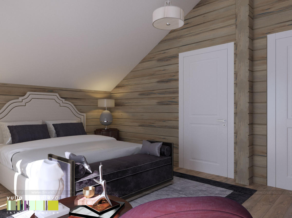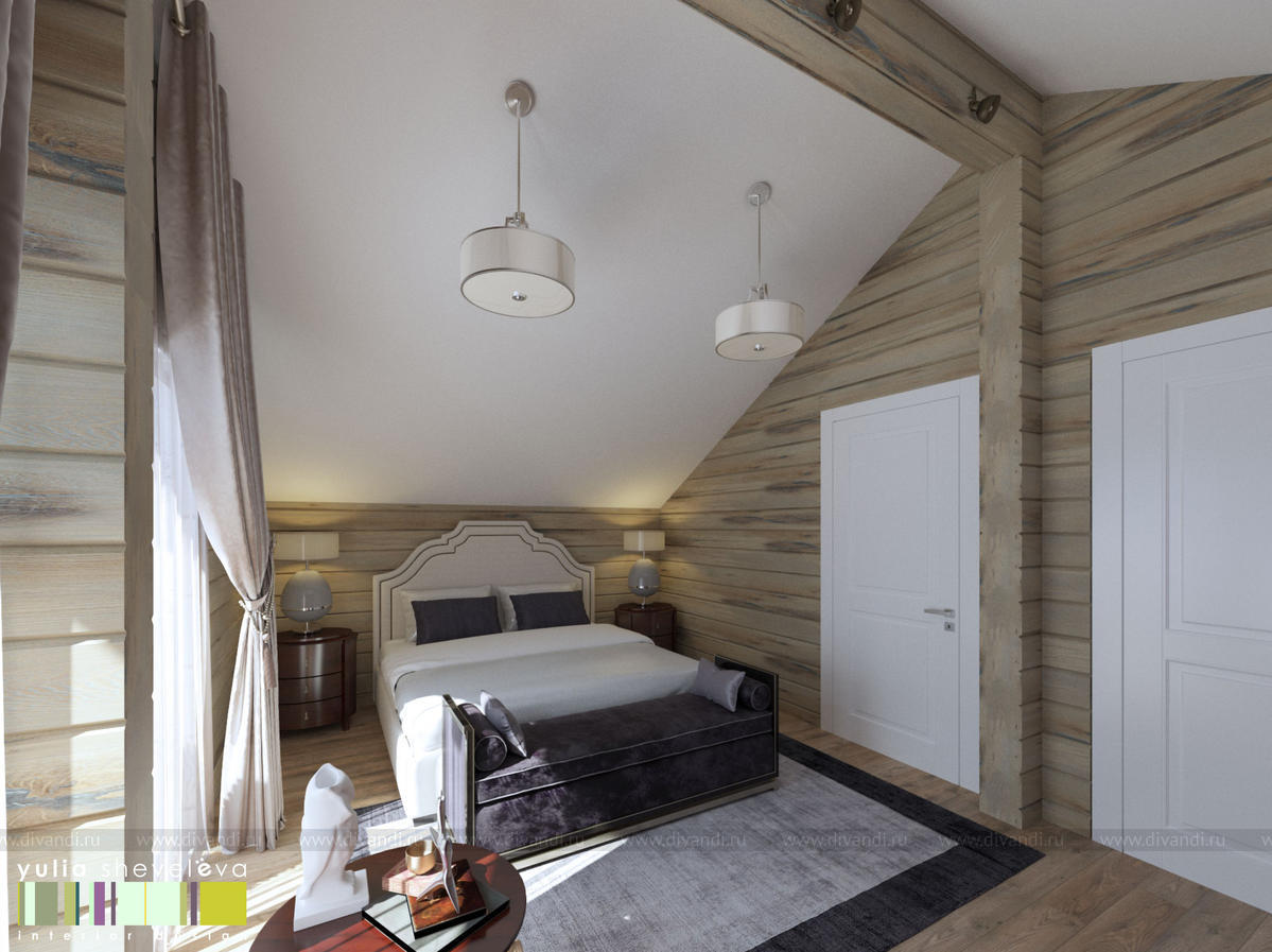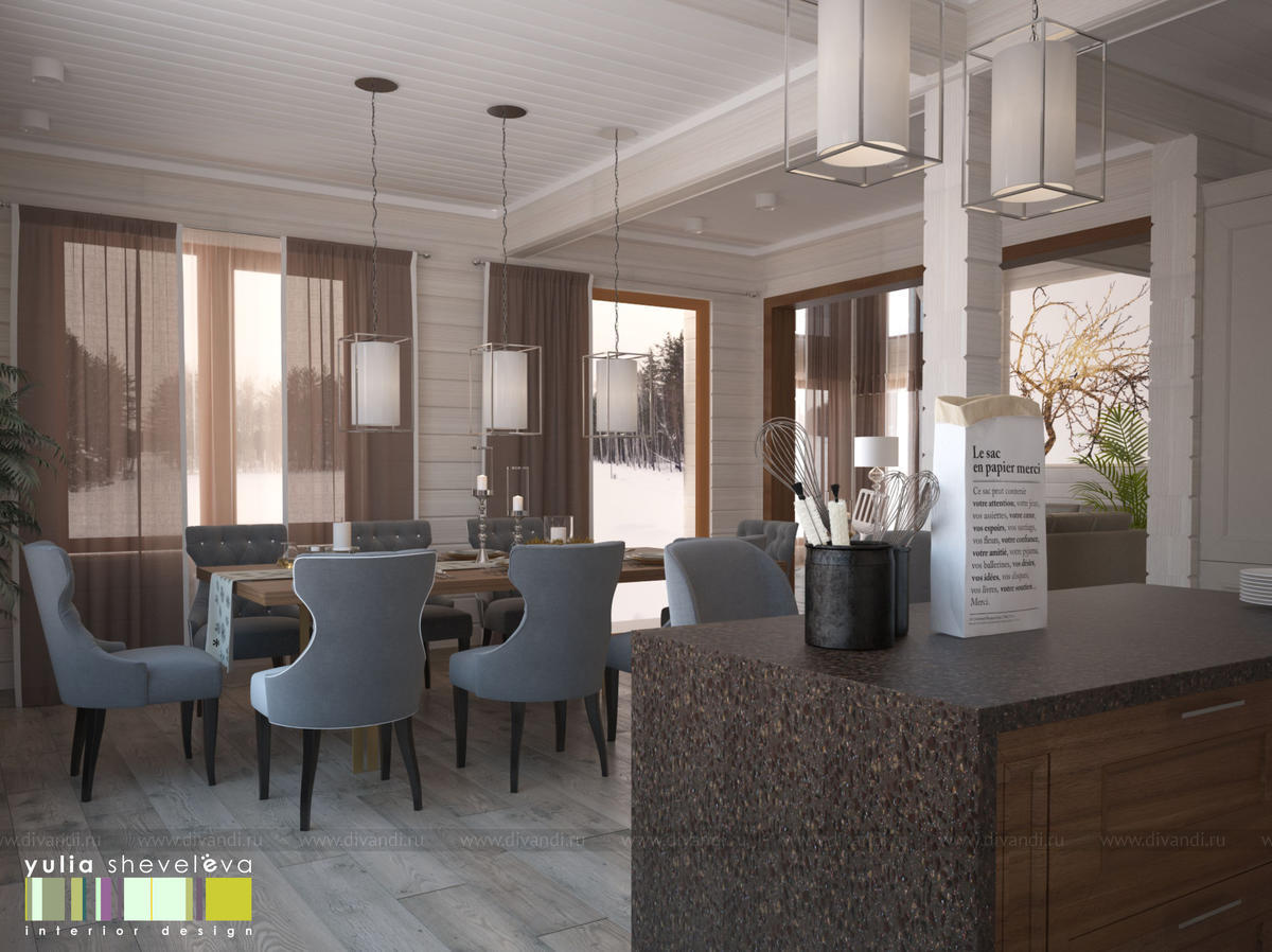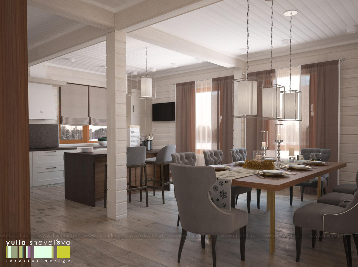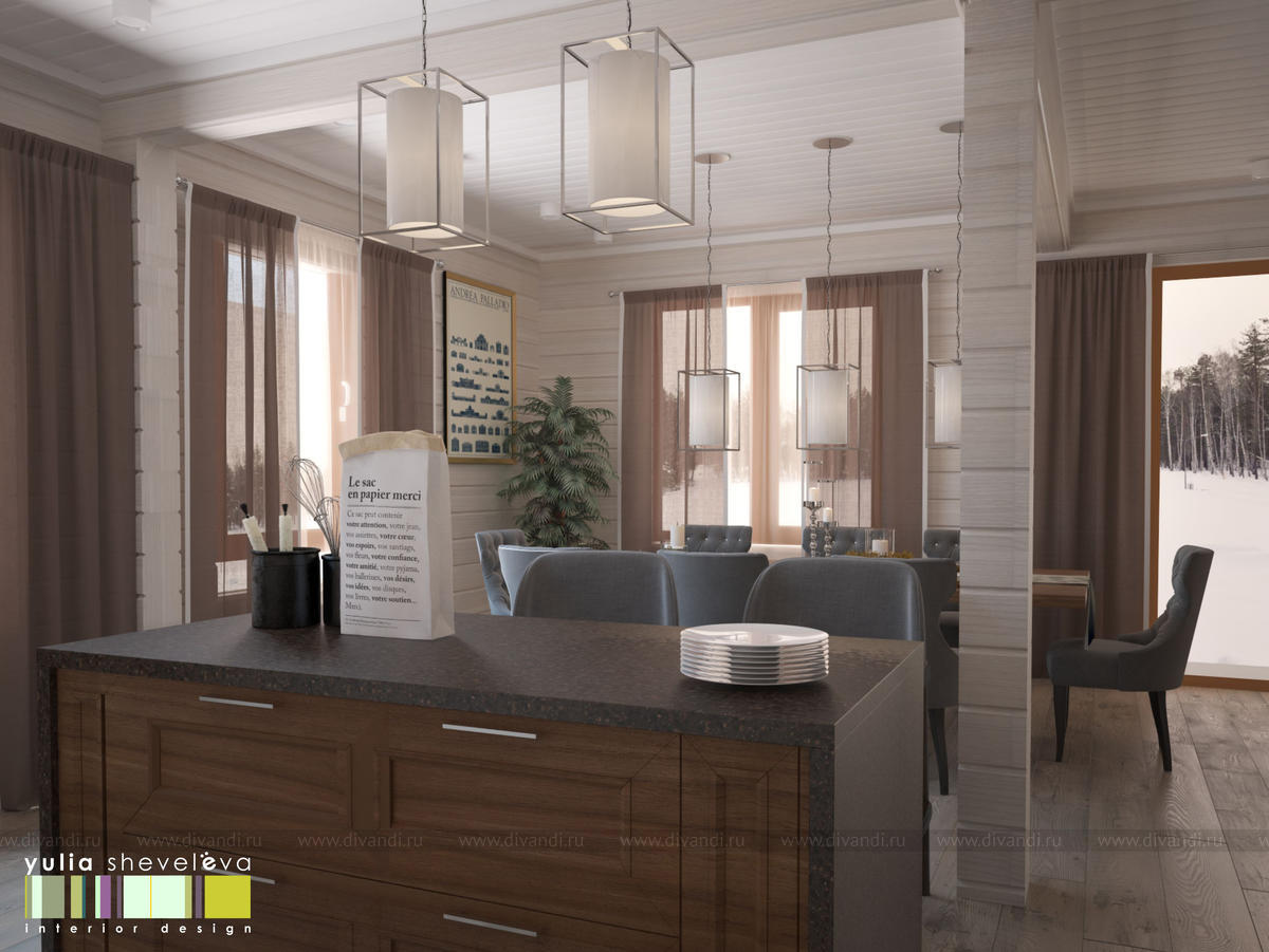 Дом из бруса, расположенный в лесном живописном массиве, недалеко от Екатеринбурга, предназначен для загородного отдыха семьи с двумя маленькими детьми. Дом общей площадью 300 м кв спроектирован в миксе элементов классики и современного стиля. Пространство решено было сделать светлым и просторным, не перегруженным деталями и декором, массивными предметами мебели.Стены окрашены морилкой светлого оттенка, чтобы уйти немного от природного цвета древесины, но при этом сохранить его неповтормую текстуру. Вся концепция интерьера построена по принципу противопоставлений стилей, материалов, форм. В интерьере этого дома классическая кухня находится в гармонии с современным обеденным столом, строгий и прямой диван - в сочетании с уникальными журнальными столиками в эко стиле, минималистичный камин и зеленый большой комод, спроектированный специально для этого интерьера, стоят очень органично. В доме очень много предметов, созданных специально для этого проекта, они придают особый шарм и неповторимость пространству.
