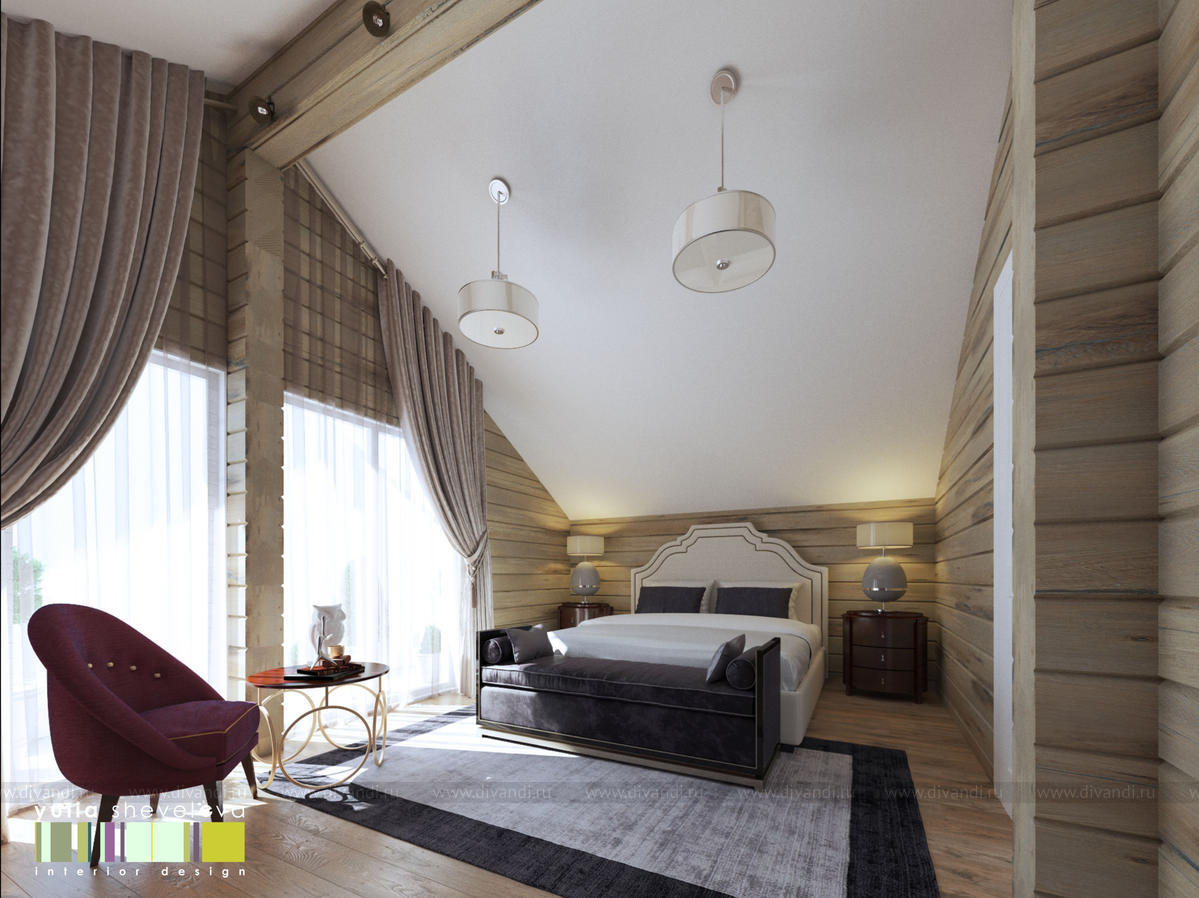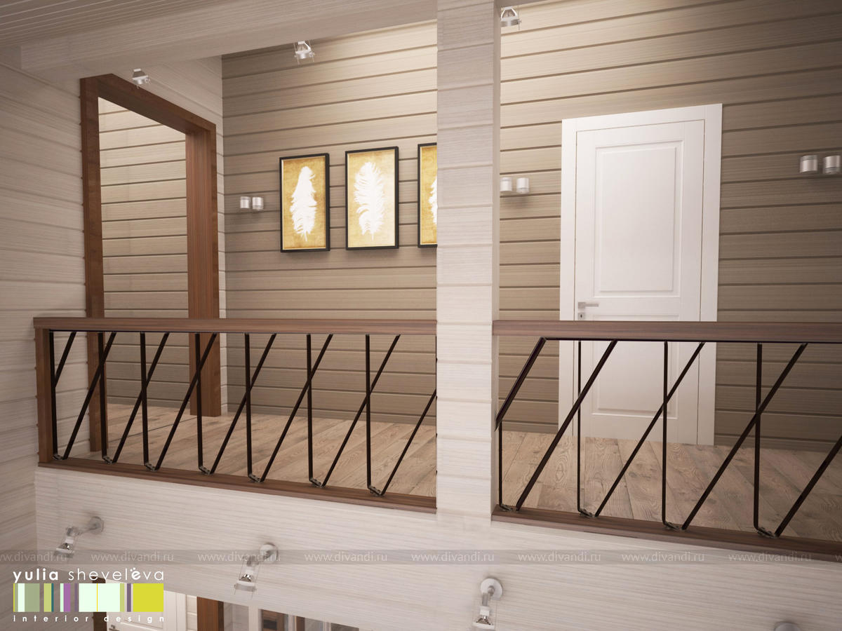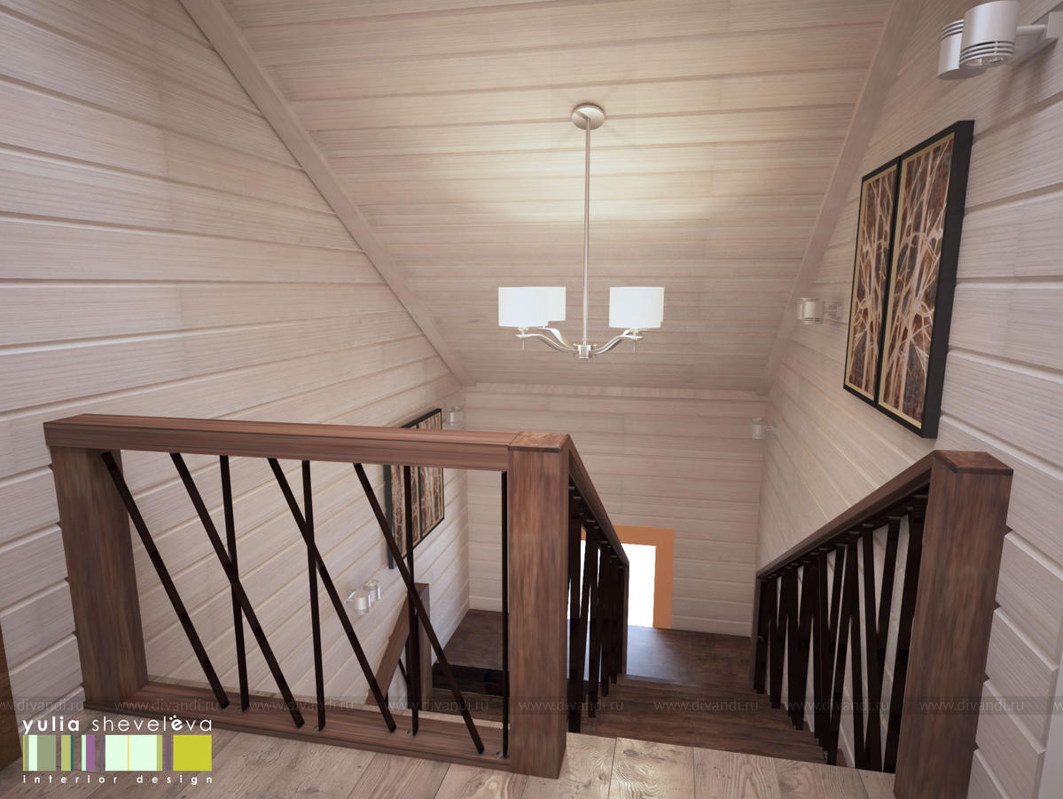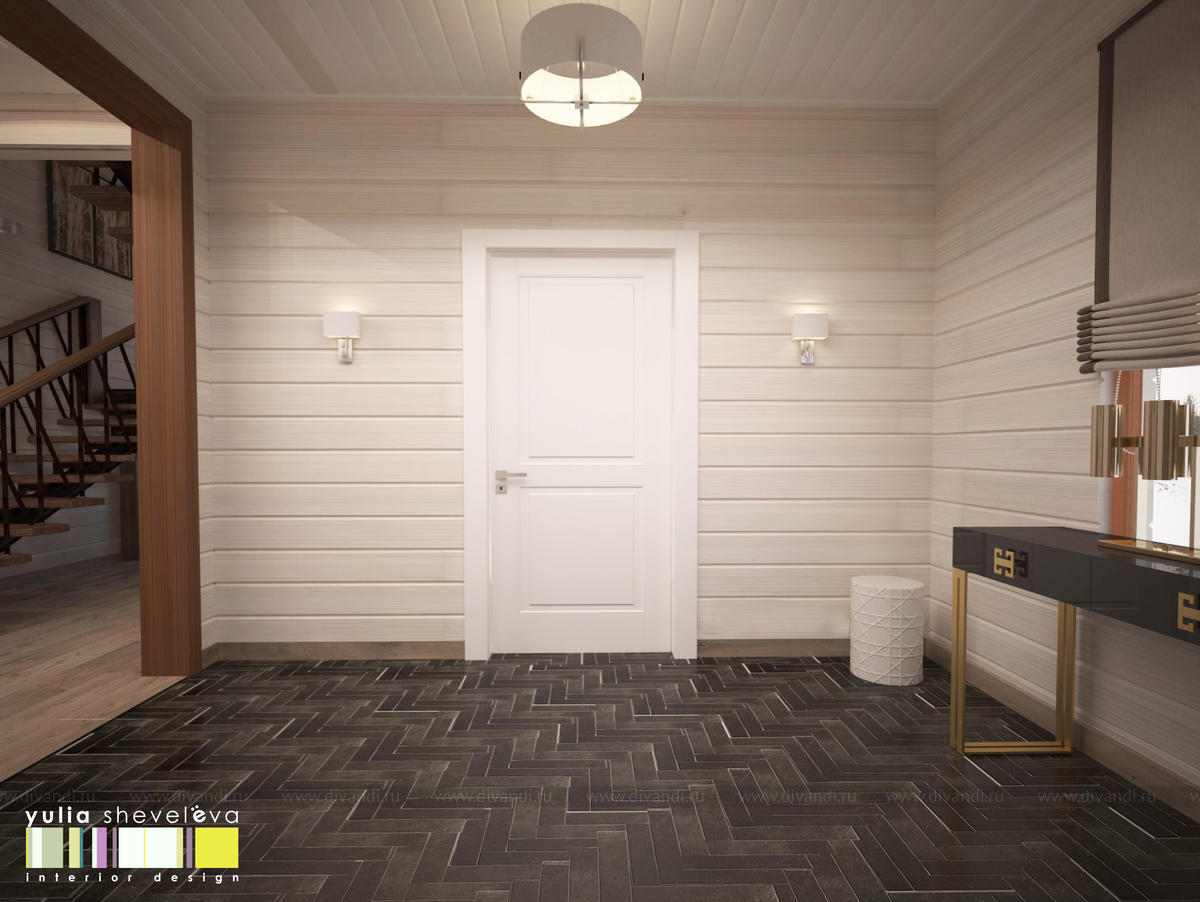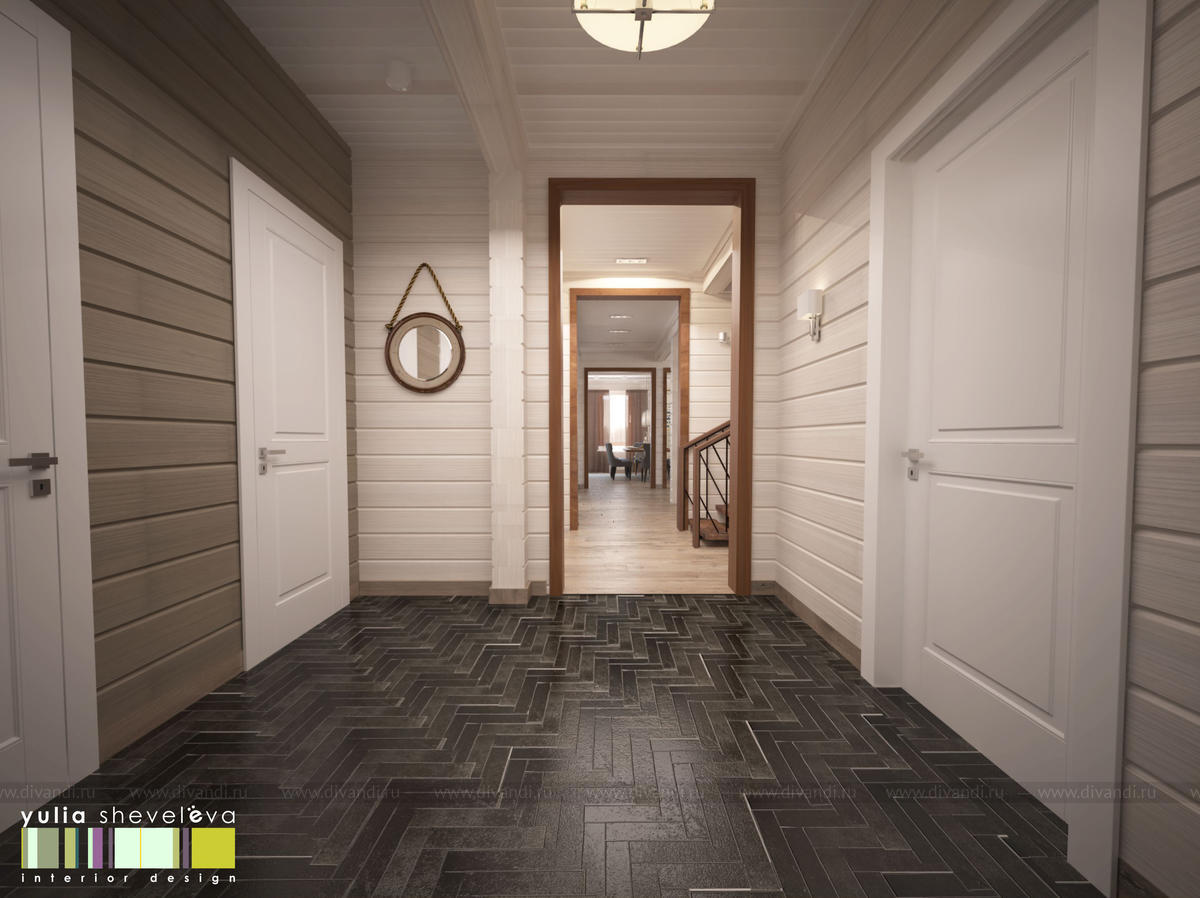 Дом из бруса, расположенный в лесном живописном массиве, недалеко от Екатеринбурга, предназначен для загородного отдыха семьи с двумя маленькими детьми. Дом общей площадью 300 м кв спроектирован в миксе элементов классики и современного стиля. Пространство решено было сделать светлым и просторным, не перегруженным деталями и декором, массивными предметами мебели.Стены окрашены морилкой светлого оттенка, чтобы уйти немного от природного цвета древесины, но при этом сохранить его неповтормую текстуру. Вся концепция интерьера построена по принципу противопоставлений стилей, материалов, форм. В интерьере этого дома классическая кухня находится в гармонии с современным обеденным столом, строгий и прямой диван - в сочетании с уникальными журнальными столиками в эко стиле, минималистичный камин и зеленый большой комод, спроектированный специально для этого интерьера, стоят очень органично. В доме очень много предметов, созданных специально для этого проекта, они придают особый шарм и неповторимость пространству.