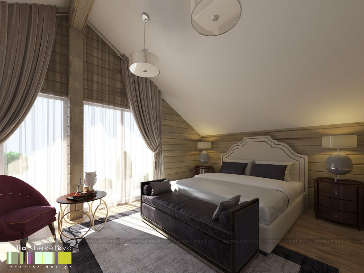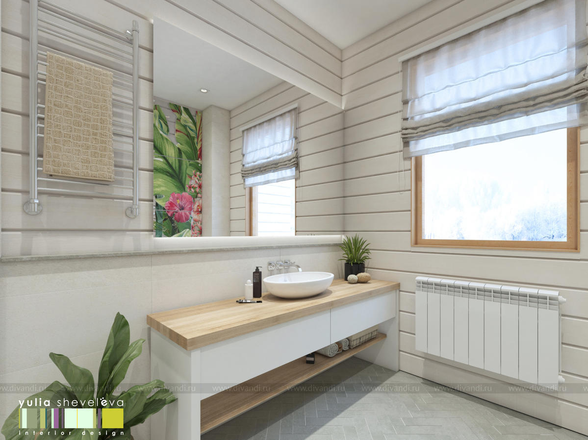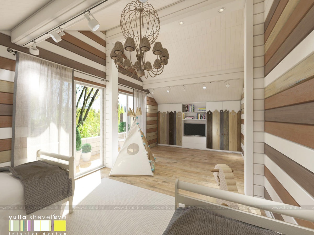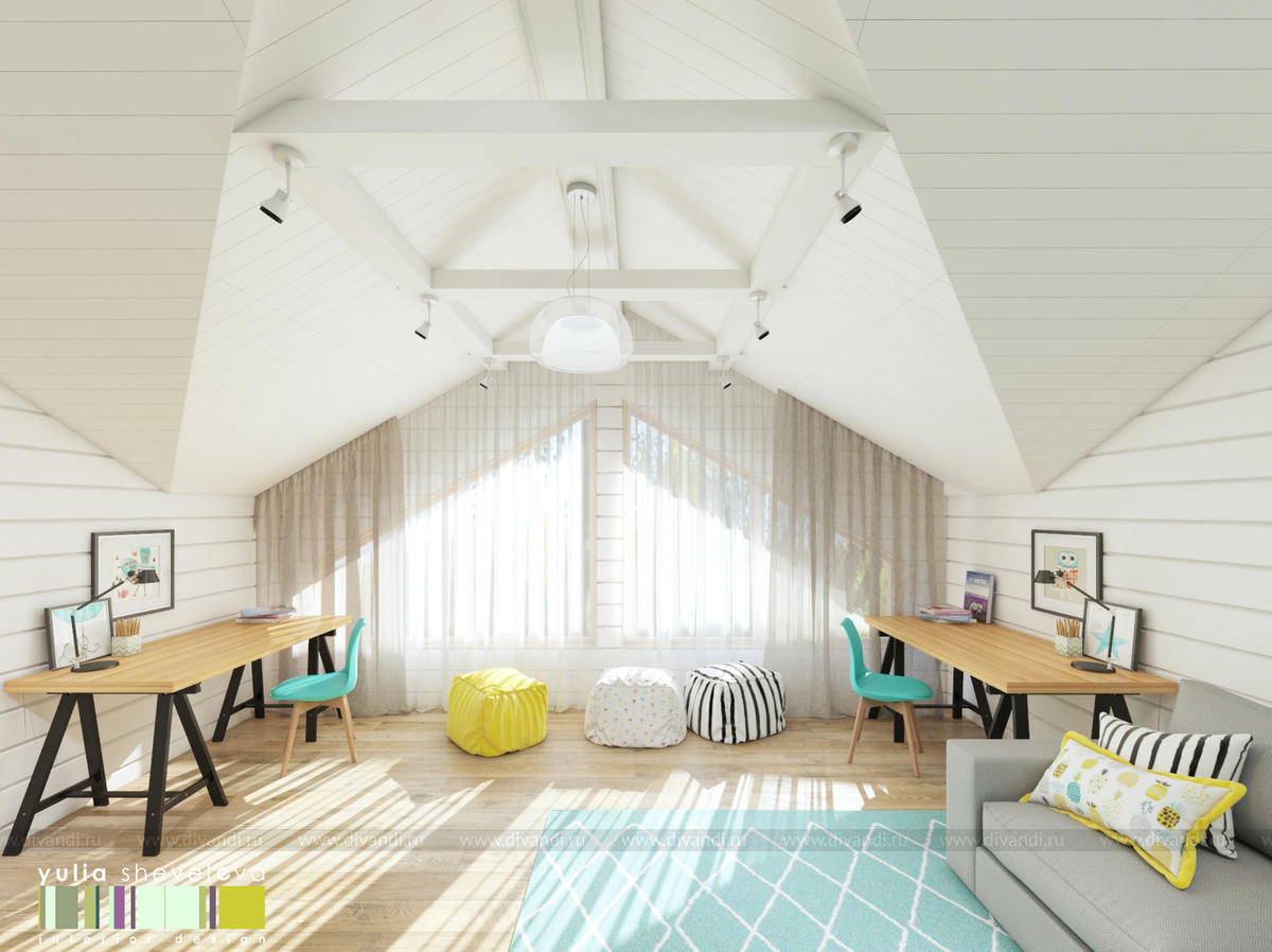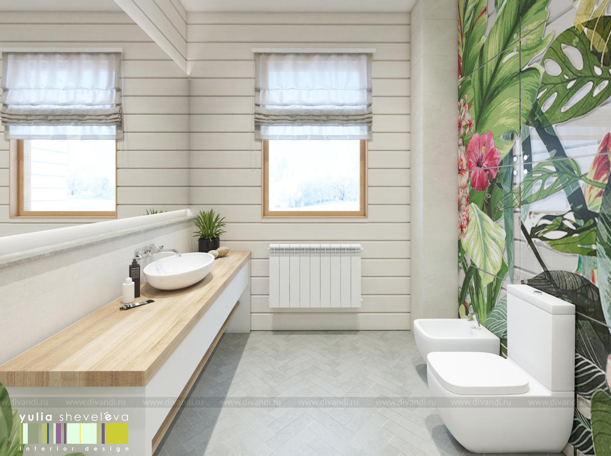 Дом из бруса, расположенный в лесном живописном массиве, недалеко от Екатеринбурга, предназначен для загородного отдыха семьи с двумя маленькими детьми. Дом общей площадью 300 м кв спроектирован в миксе элементов классики и современного стиля. Пространство решено было сделать светлым и просторным, не перегруженным деталями и декором, массивными предметами мебели.Стены окрашены морилкой светлого оттенка, чтобы уйти немного от природного цвета древесины, но при этом сохранить его неповтормую текстуру. Вся концепция интерьера построена по принципу противопоставлений стилей, материалов, форм. В интерьере этого дома классическая кухня находится в гармонии с современным обеденным столом, строгий и прямой диван - в сочетании с уникальными журнальными столиками в эко стиле, минималистичный камин и зеленый большой комод, спроектированный специально для этого интерьера, стоят очень органично. В доме очень много предметов, созданных специально для этого проекта, они придают особый шарм и неповторимость пространству.