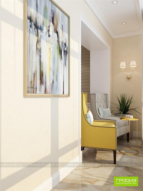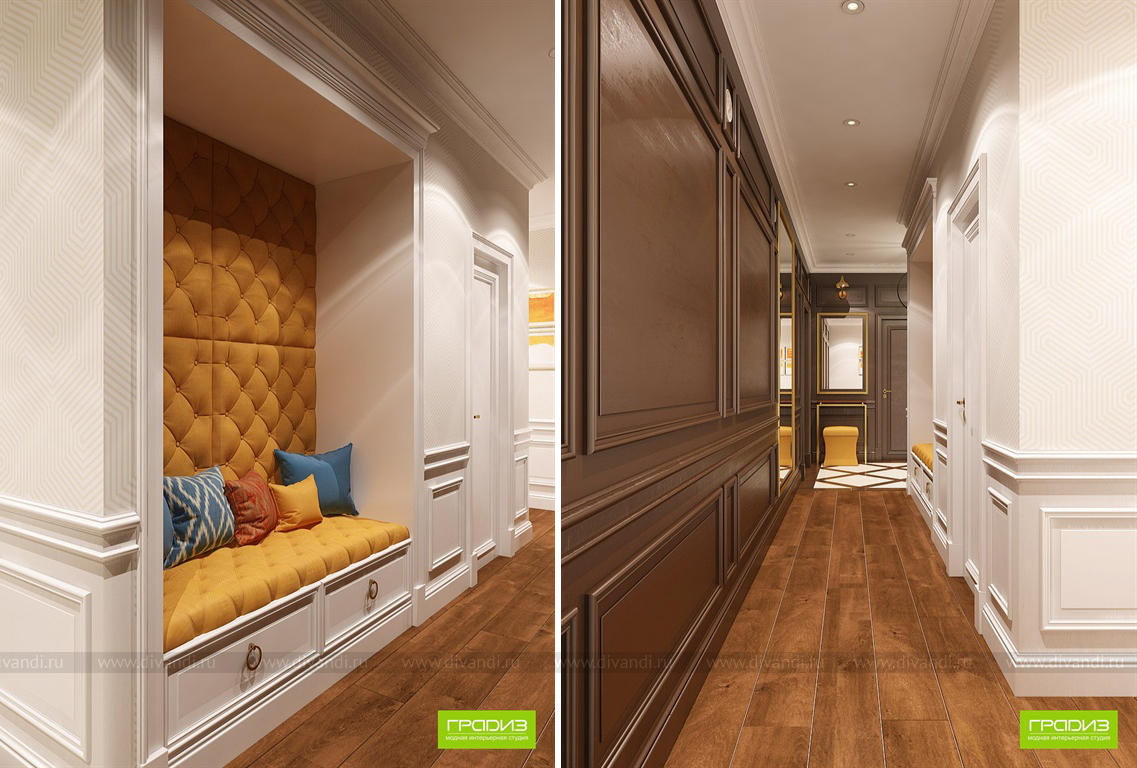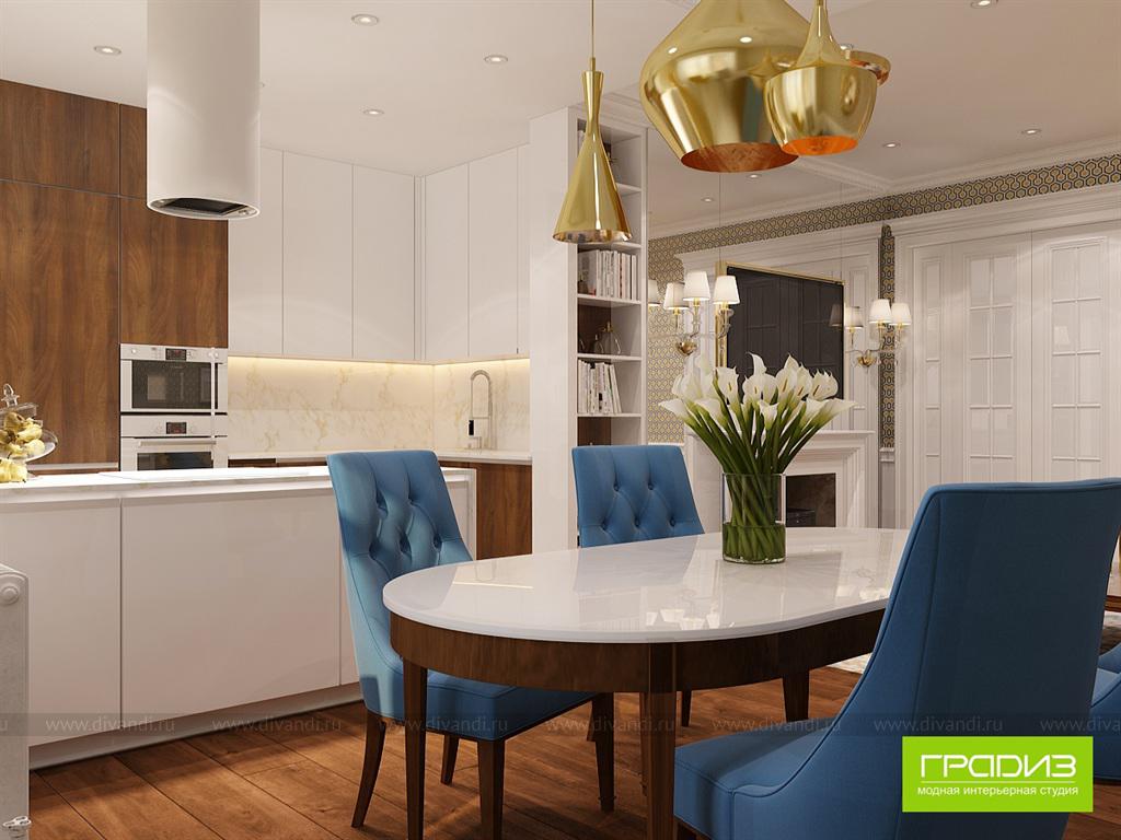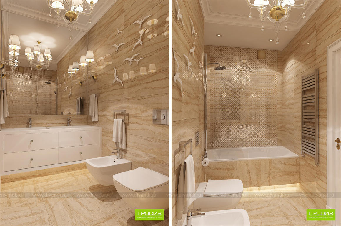 Стильный проект квартиры площадью 142 кв.м. в Ханты-Мансийске. Интерьер выполнен в стиле арт-деко и изобилует блестящими поверхностями, золотом и серебром, зеркалами в шикарных рамах, сияющими люстрами.