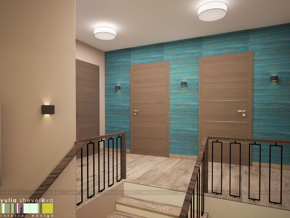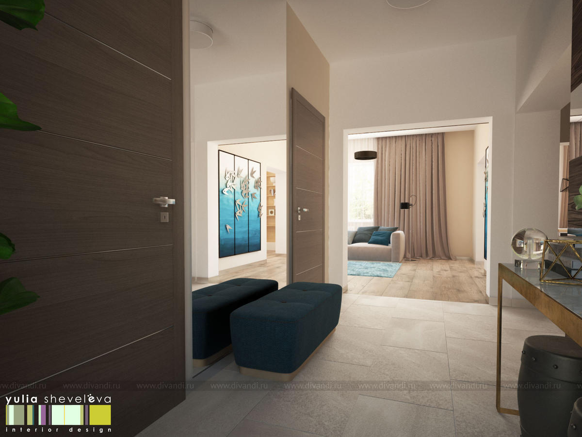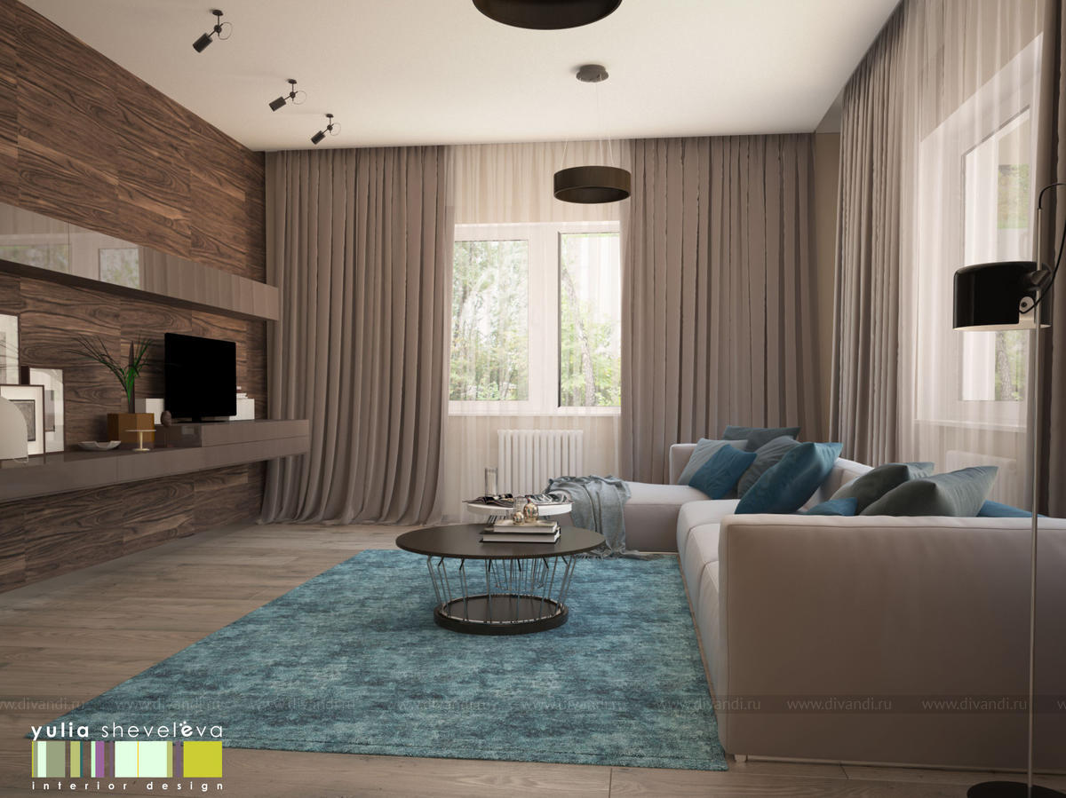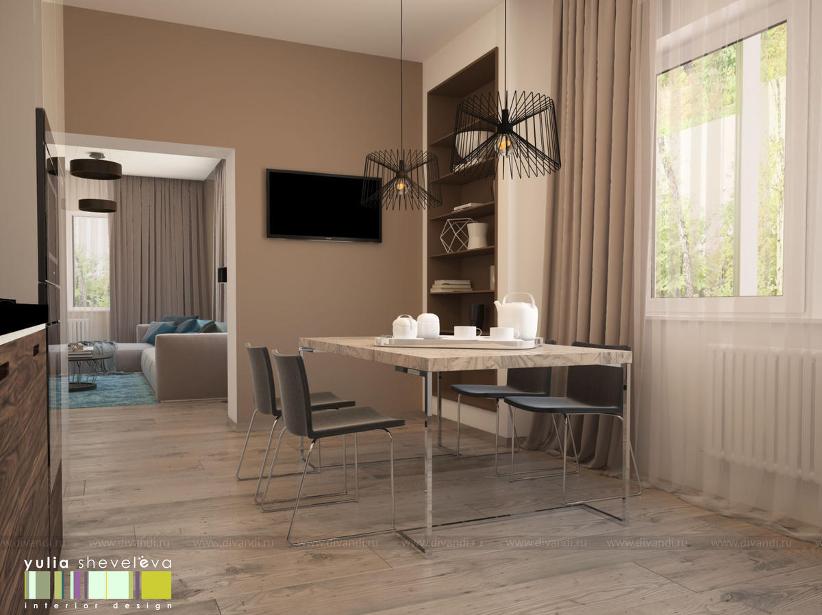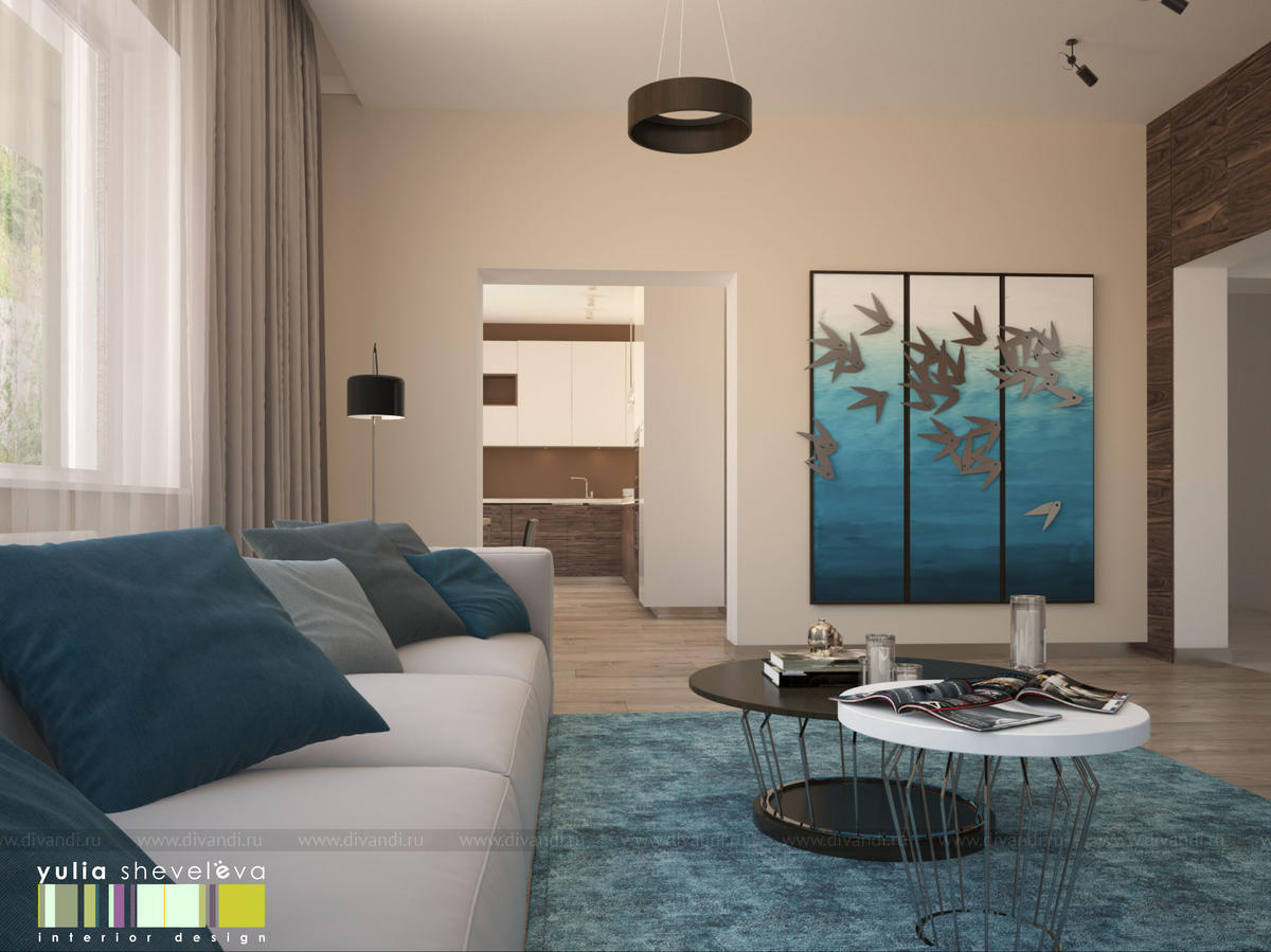 Основа интерьера -теплая гамма, в которую очень органично вписался бирюзовый цвет. Дерево, мягкие ткани, матовые приятные на ощупь поверхности создают ощущение комфорта.