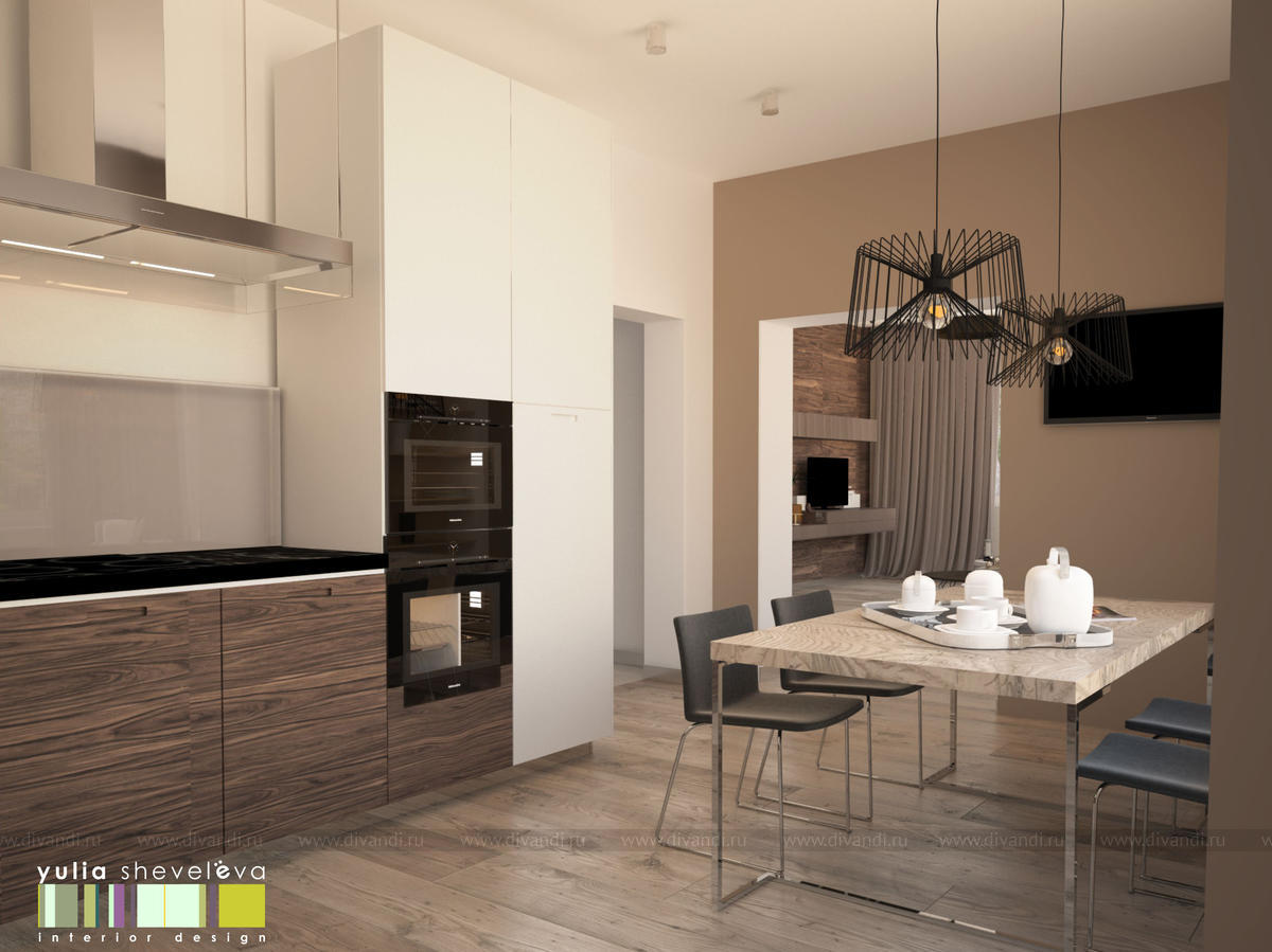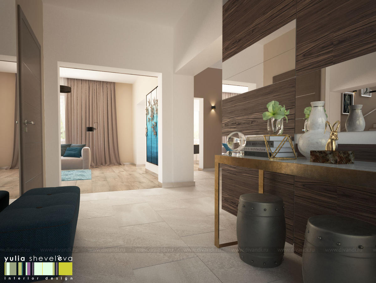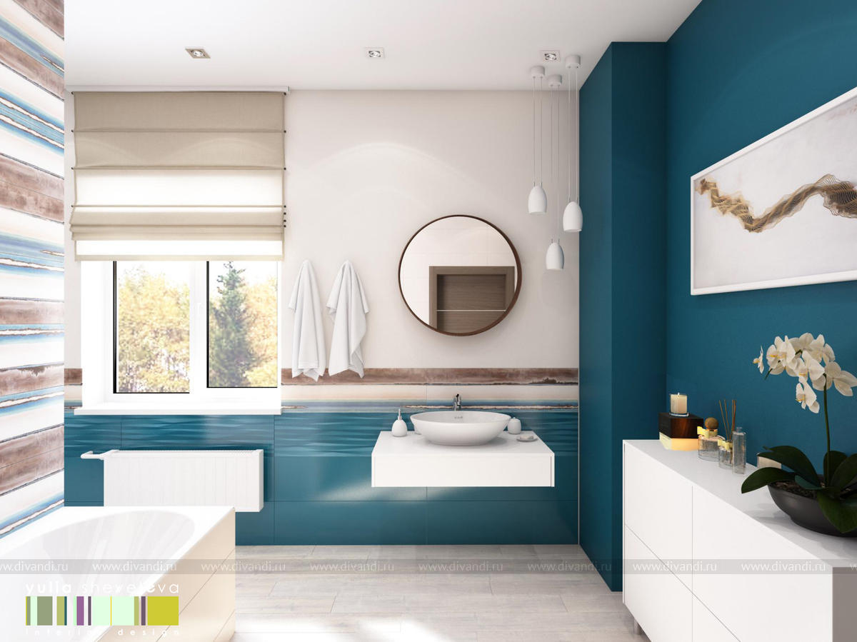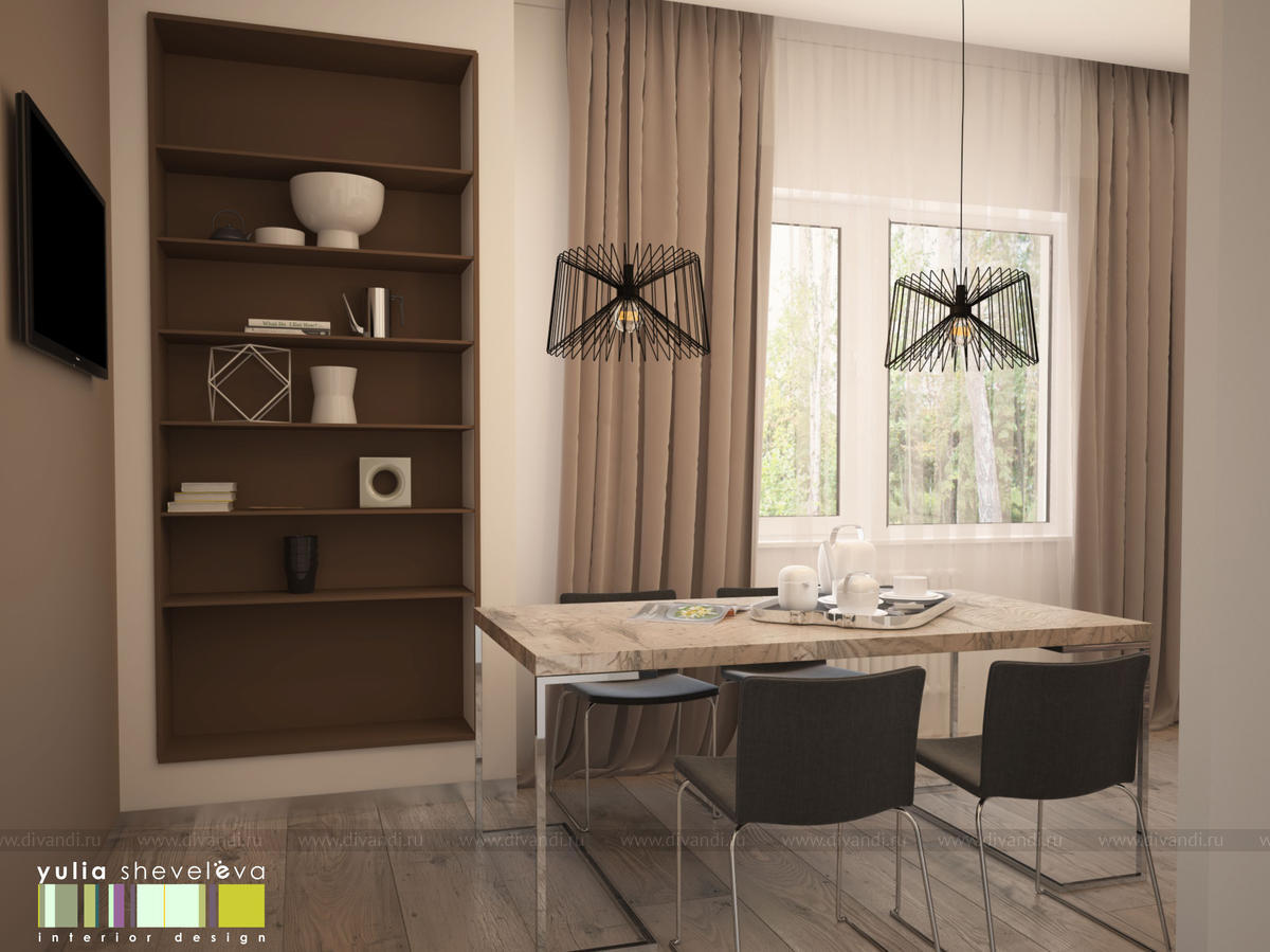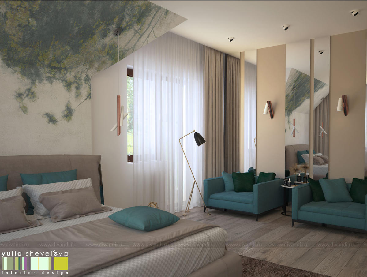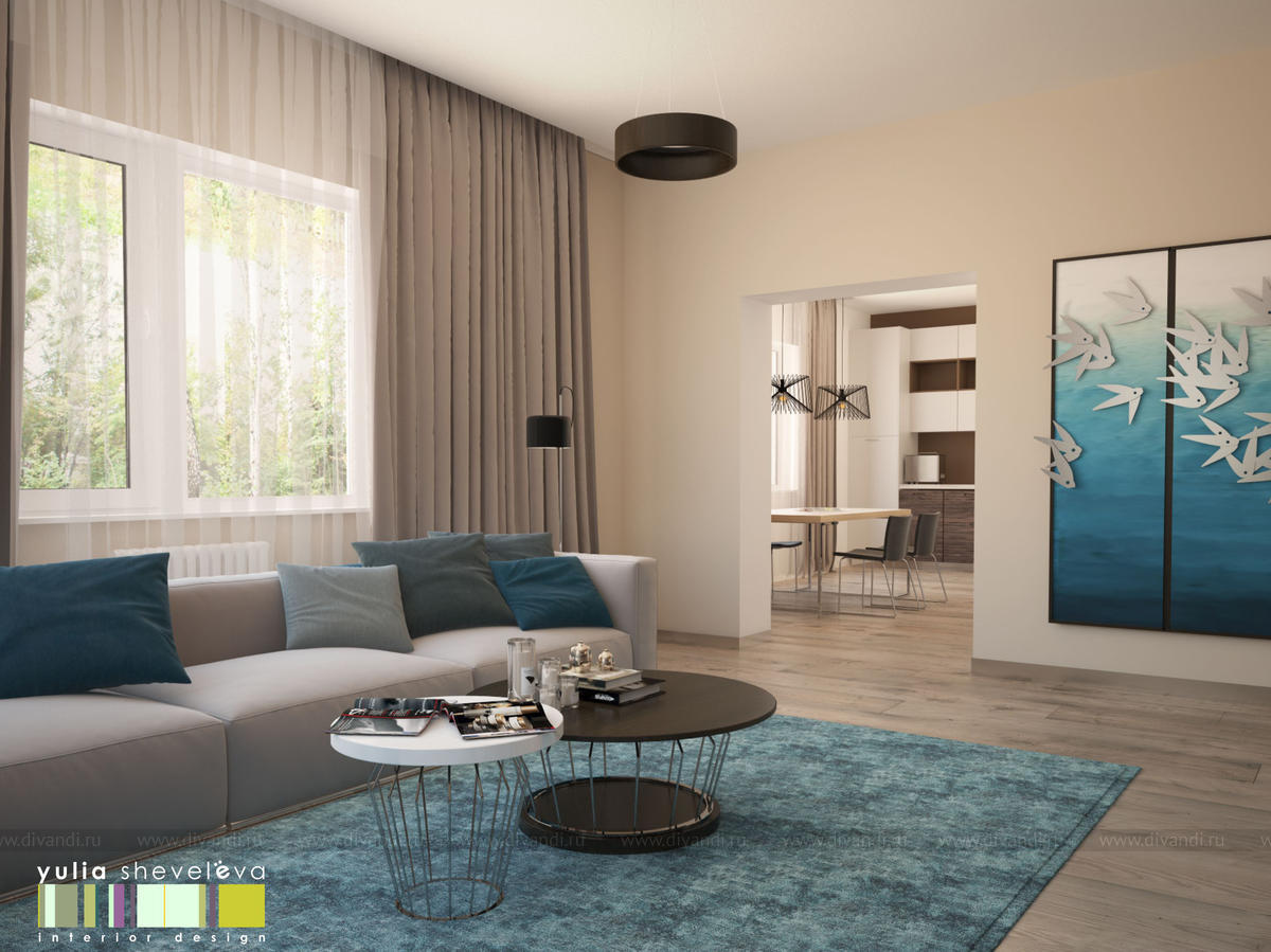 Основа интерьера -теплая гамма, в которую очень органично вписался бирюзовый цвет. Дерево, мягкие ткани, матовые приятные на ощупь поверхности создают ощущение комфорта.