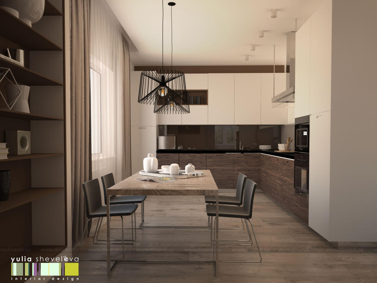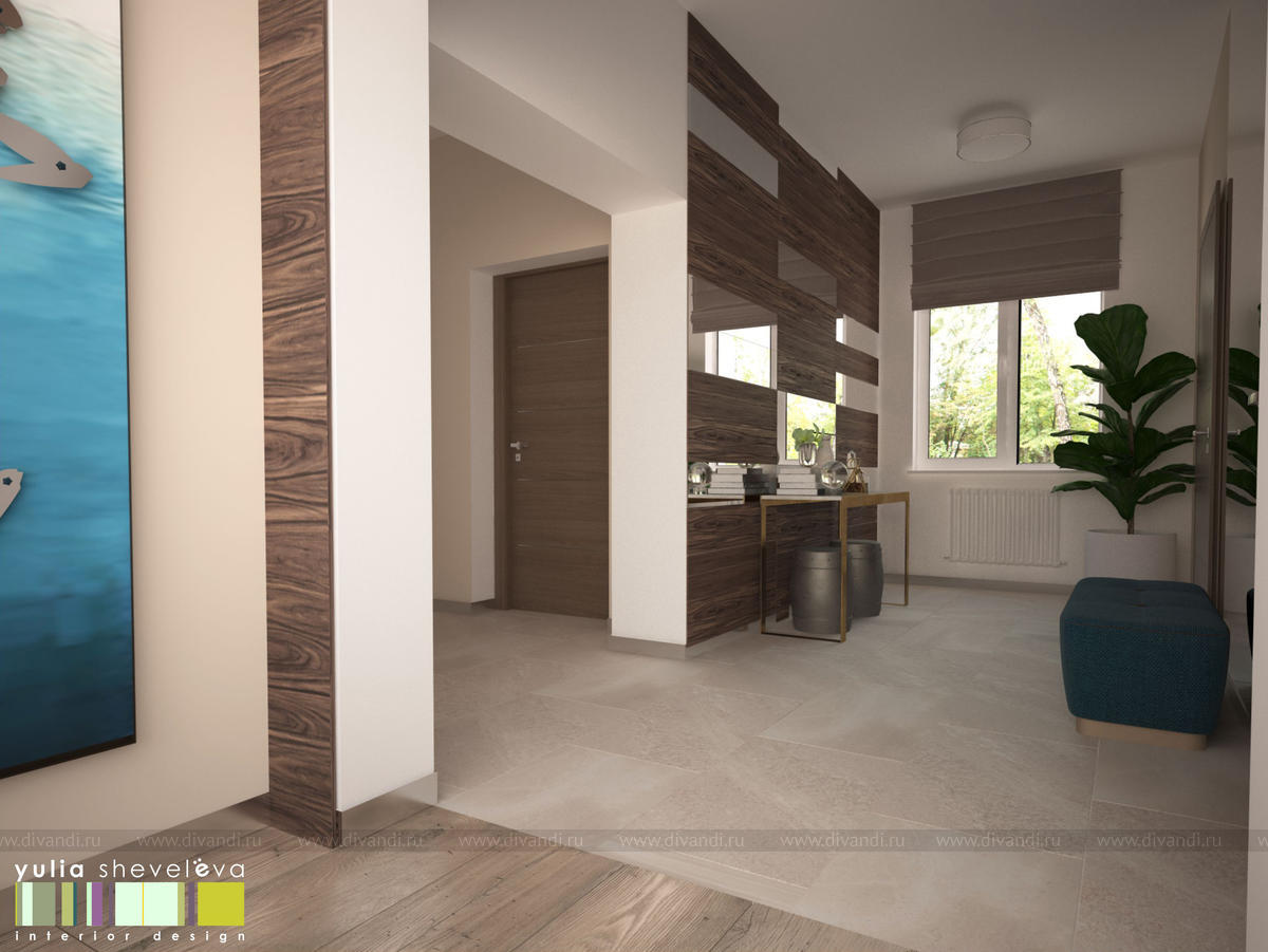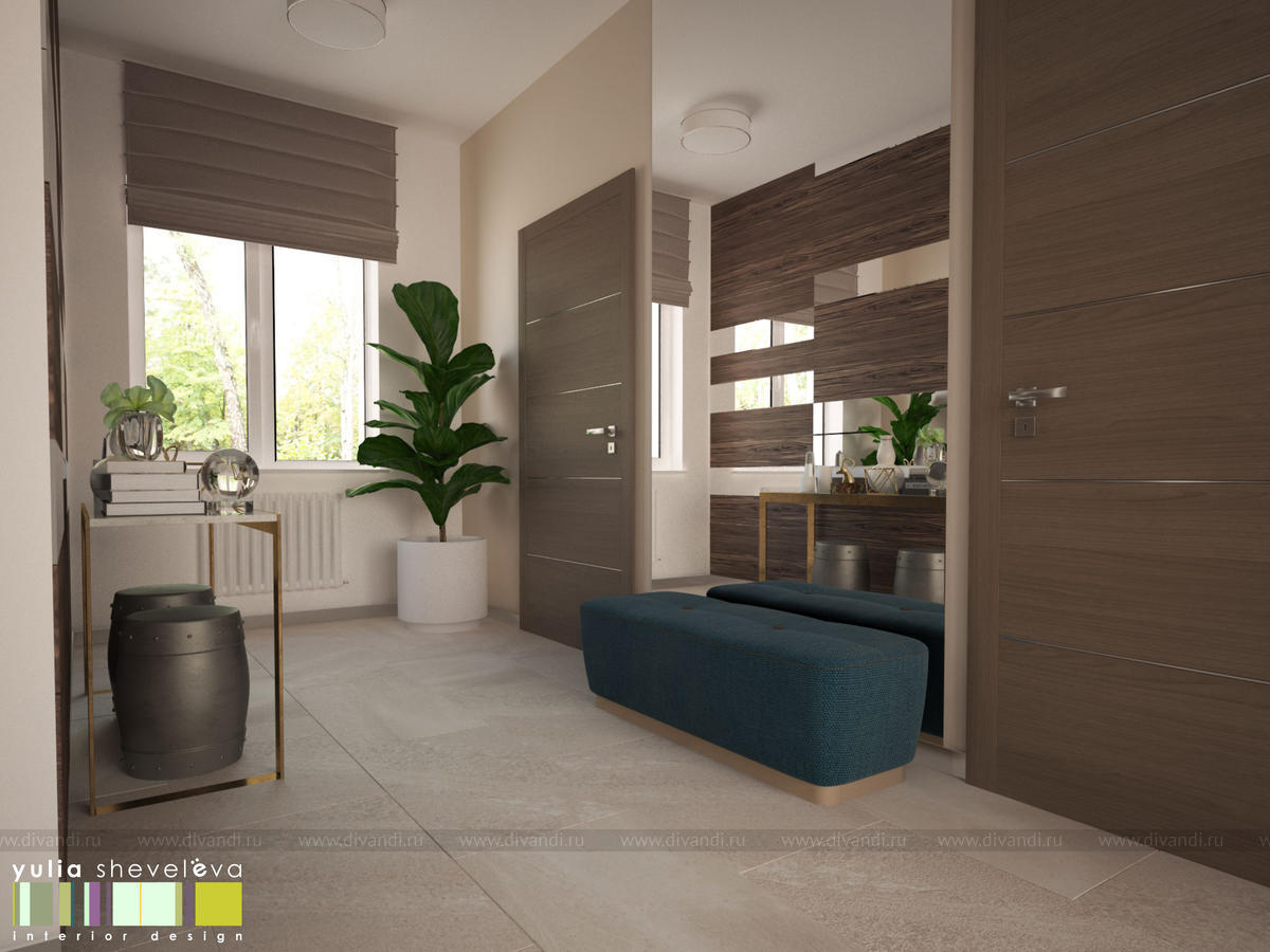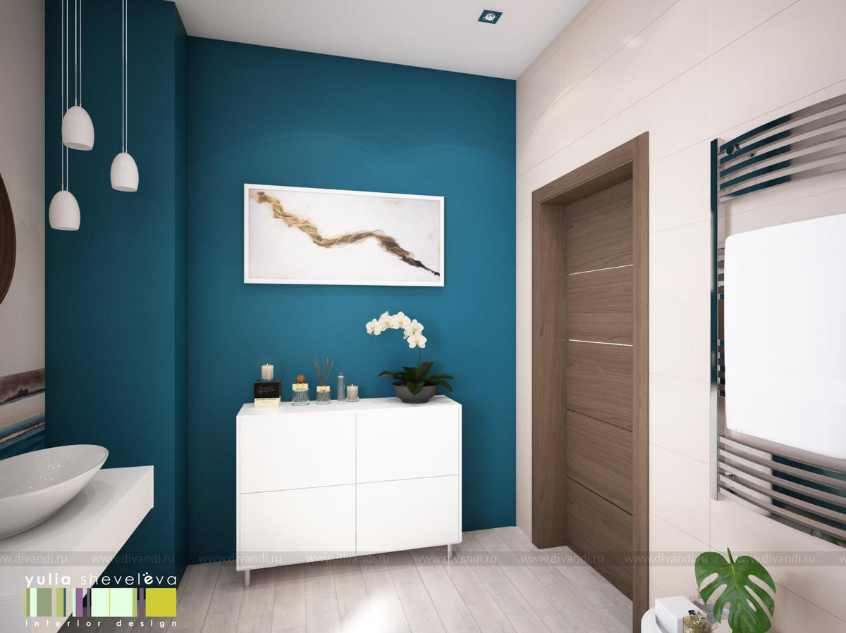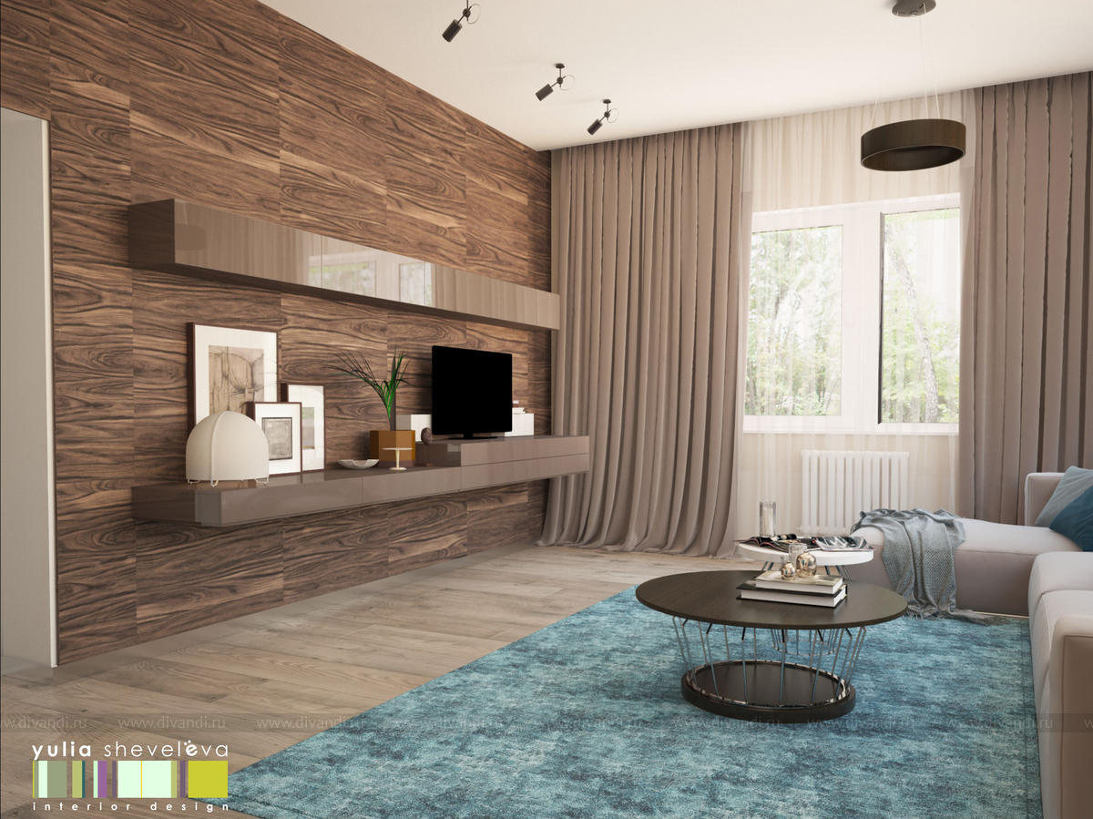 Основа интерьера -теплая гамма, в которую очень органично вписался бирюзовый цвет. Дерево, мягкие ткани, матовые приятные на ощупь поверхности создают ощущение комфорта.