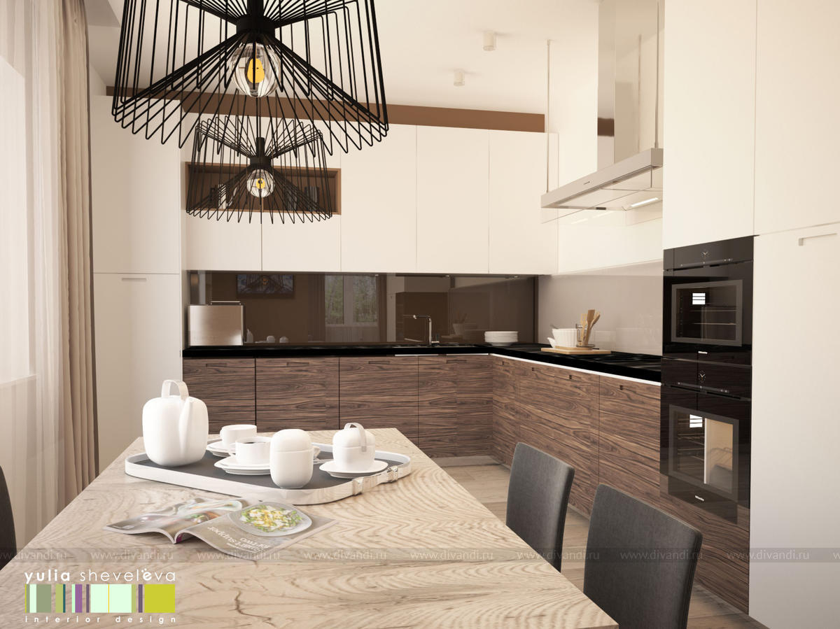 Современная кухня, лаконичного дизайна, продумана до мелочей. Отдельно выделена столовая зона с системой хранения и телевизором.