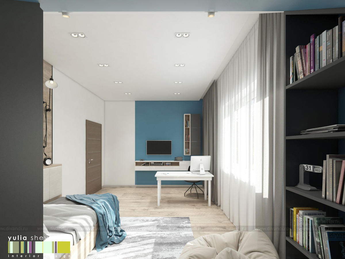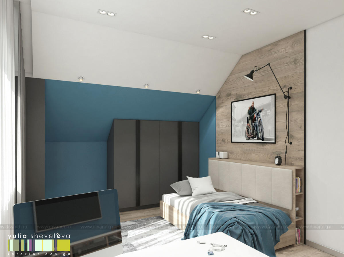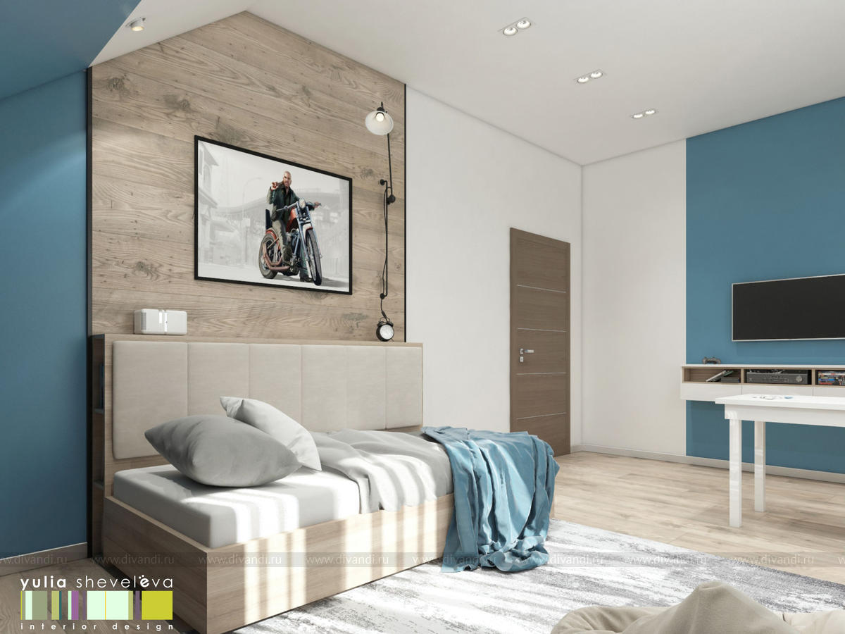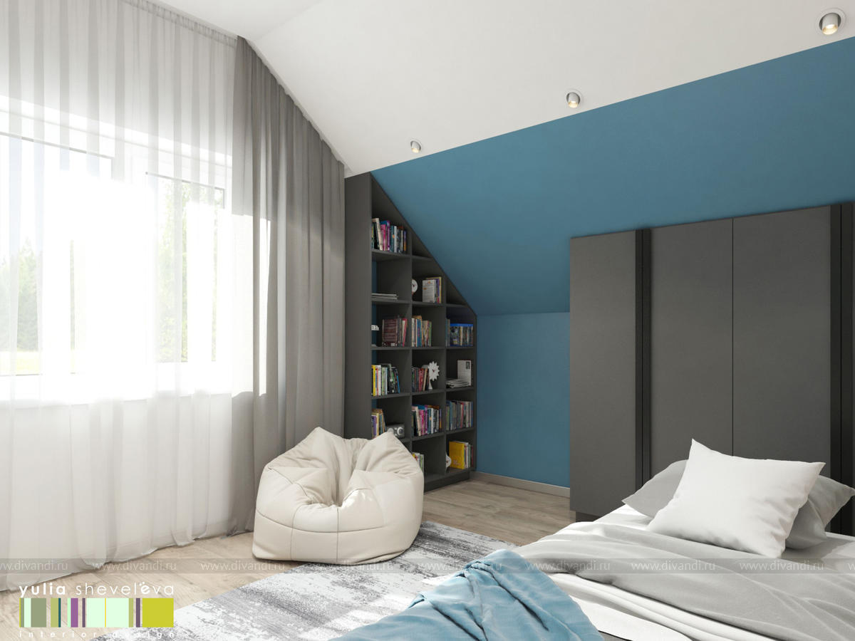 На втором этаже расположены главная спальня, две детских комнаты, ванная и гардероб. Для каждого из детей была продумано свое пространство. Для девочки в интерьере выбрана легкая пастельная гамма, с лимонными акцентами. В детской для мальчика организовано светлое и функциональное пространство.